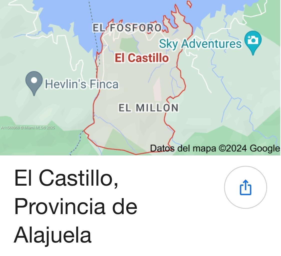 This enormous piece of land of 42 acres is located in El Castillo, San Ramon town in Alajuela, Costa Rica. This area has its own water source. It is surrounded by a river on the south side. There are many uses for the terrain: could be a sustainable hotel, biological station, US tourist project or even a spa with thermal water. Land is suitable and ready for residential construction or other type of construction. There are several viewpoints with 360 degrees of Arenal Volcano and Arenal lake, Chato hills, Fortuna tourist hotspot and other volcanoes. Its unparallel location includes surrounded by the natural reserve of Monteverde, Forest Alberto Brene and famous Arenal Volcano National park.