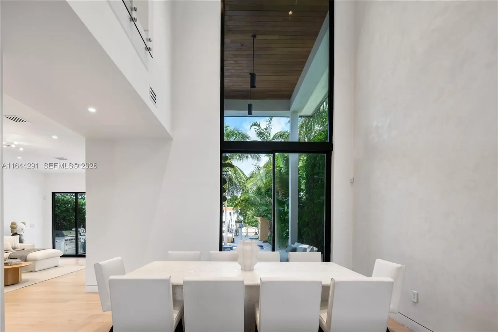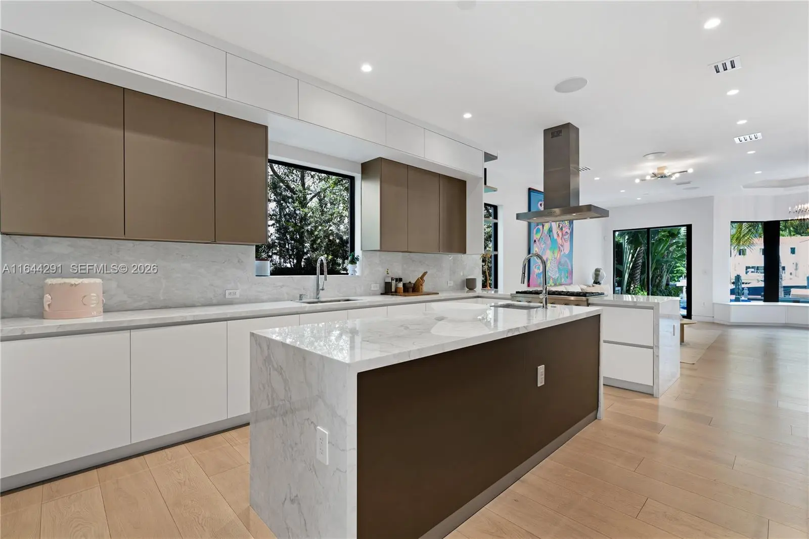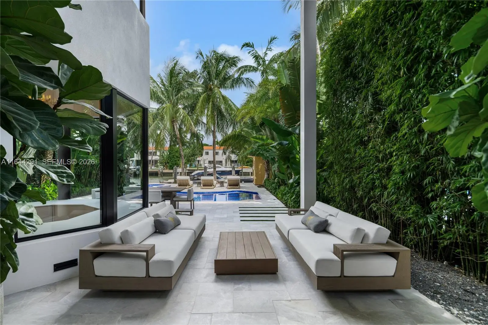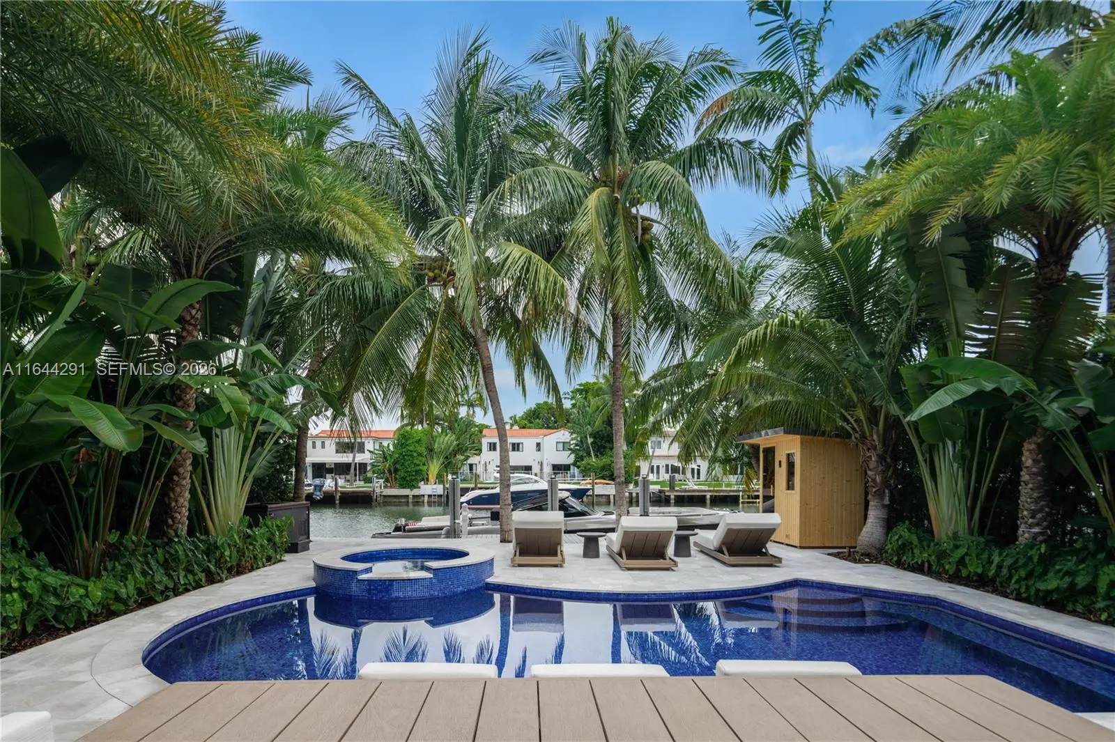 Dive into the tropical fully-renovated turnkey waterfront Modern Mediterranean villa boasts 6 beds/7 baths w/ white oak wood floors, arched doorways, floor to ceiling glass windows unveil natural light & water views. Gather by the fireplace & entertain in the living room w/ 20 ft high ceilings, a built-in bar and a kitchen with high end appliances, fridge & sink with marble countertops. Primary suite brand new custom master closets, outdoor balcony, views of the water, dual vanities & oversized soaking tub. Brand new floor to ceiling new glass doors blur the lines between interior & exterior spaces. 2 car garage. Auto-blinds offer privacy & light control as well. In the backyard there is an outdoor BBQ, pizza oven, pool & spa, sauna & cold plunge, covered terrace, new dock w/ shore power.