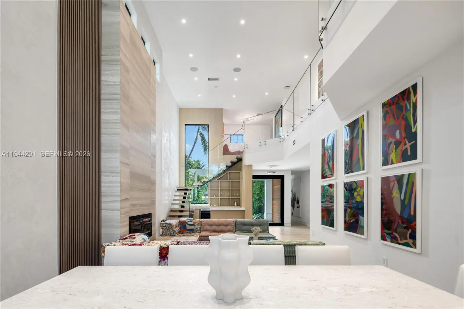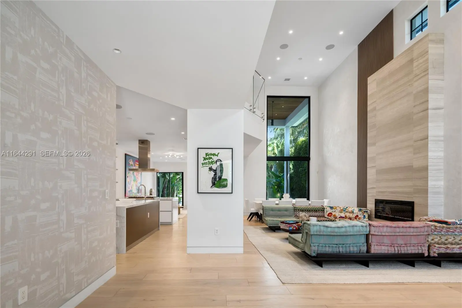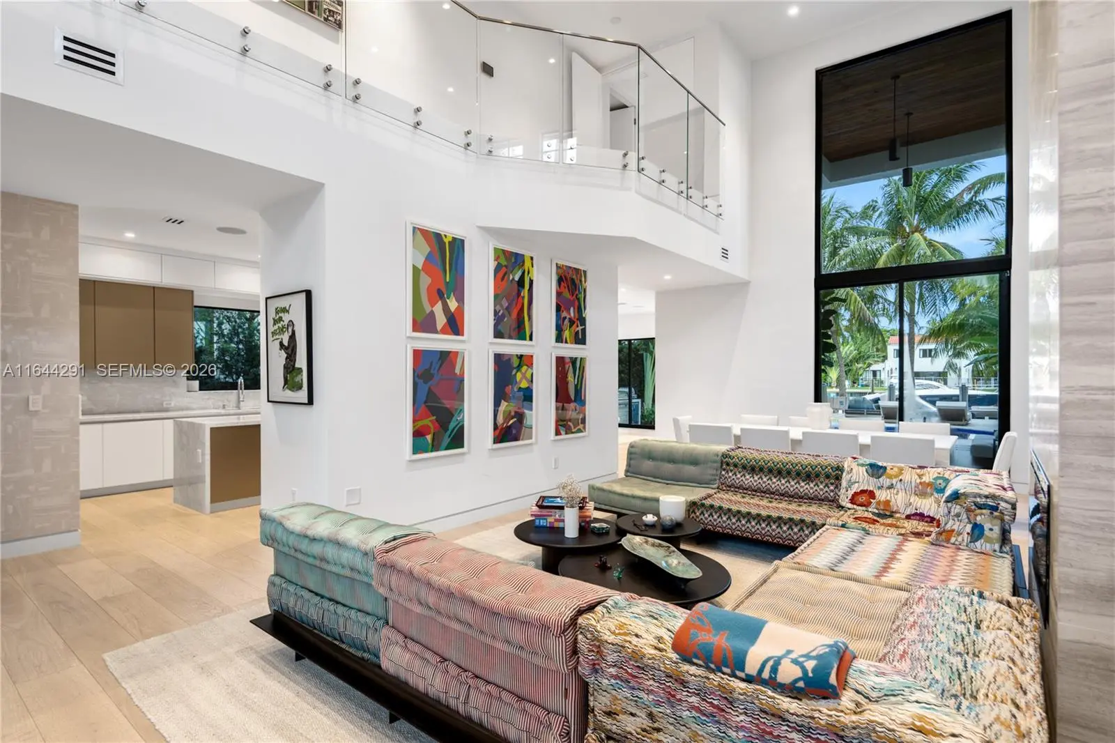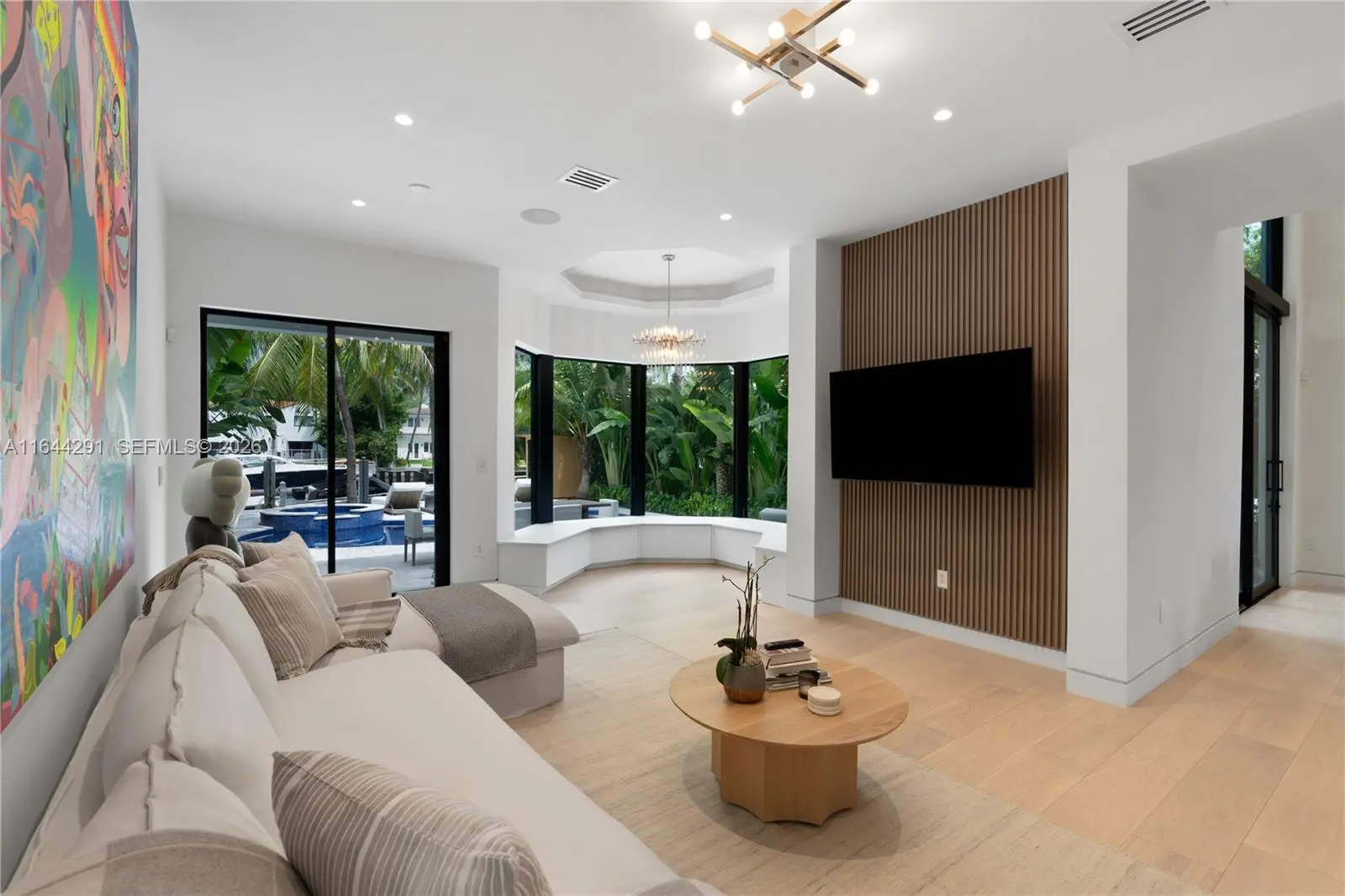 Dive into the tropical fully-renovated turnkey waterfront Modern Mediterranean villa boasts 6 beds/7 baths w/ white oak wood floors, arched doorways, floor to ceiling glass windows unveil natural light & water views. Gather by the fireplace & entertain in the living room w/ 20 ft high ceilings, a built-in bar and a kitchen with high end appliances, fridge & sink with marble countertops. Primary suite brand new custom master closets, outdoor balcony, views of the water, dual vanities & oversized soaking tub. Brand new floor to ceiling new glass doors blur the lines between interior & exterior spaces. 2 car garage. Auto-blinds offer privacy & light control as well. In the backyard there is an outdoor BBQ, pizza oven, pool & spa, sauna & cold plunge, covered terrace, new dock w/ shore power.