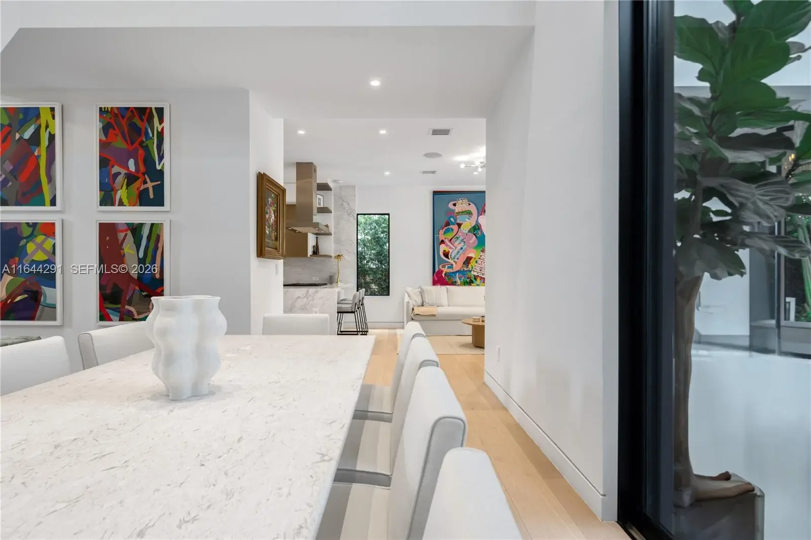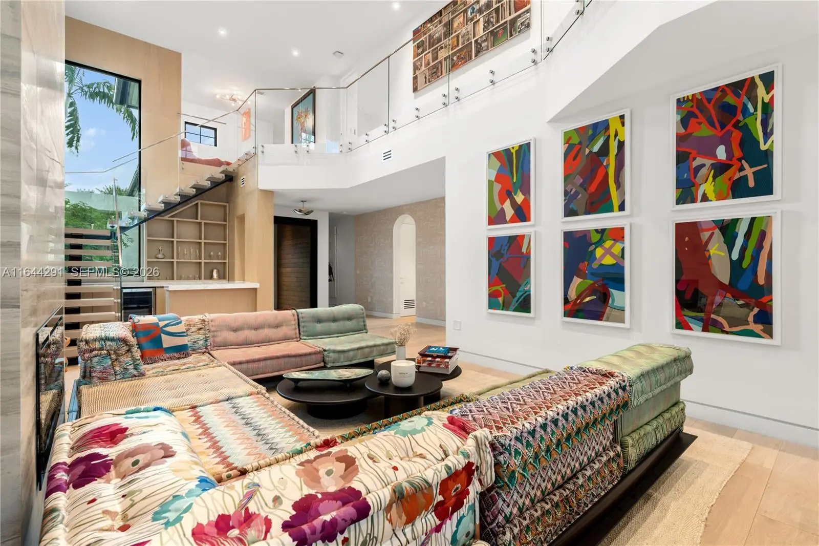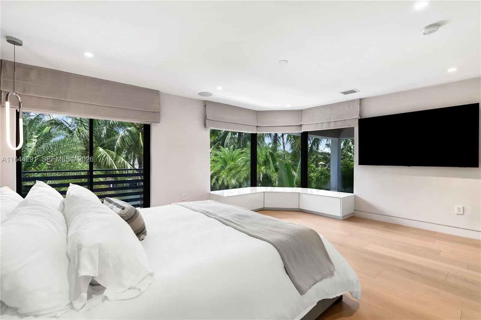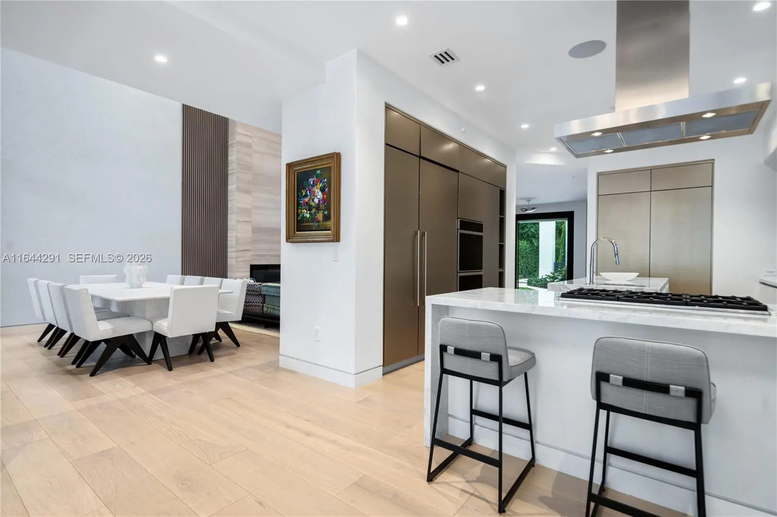 Dive into the tropical fully-renovated turnkey waterfront Modern Mediterranean villa boasts 6 beds/7 baths w/ white oak wood floors, arched doorways, floor to ceiling glass windows unveil natural light & water views. Gather by the fireplace & entertain in the living room w/ 20 ft high ceilings, a built-in bar and a kitchen with high end appliances, fridge & sink with marble countertops. Primary suite brand new custom master closets, outdoor balcony, views of the water, dual vanities & oversized soaking tub. Brand new floor to ceiling new glass doors blur the lines between interior & exterior spaces. 2 car garage. Auto-blinds offer privacy & light control as well. In the backyard there is an outdoor BBQ, pizza oven, pool & spa, sauna & cold plunge, covered terrace, new dock w/ shore power.