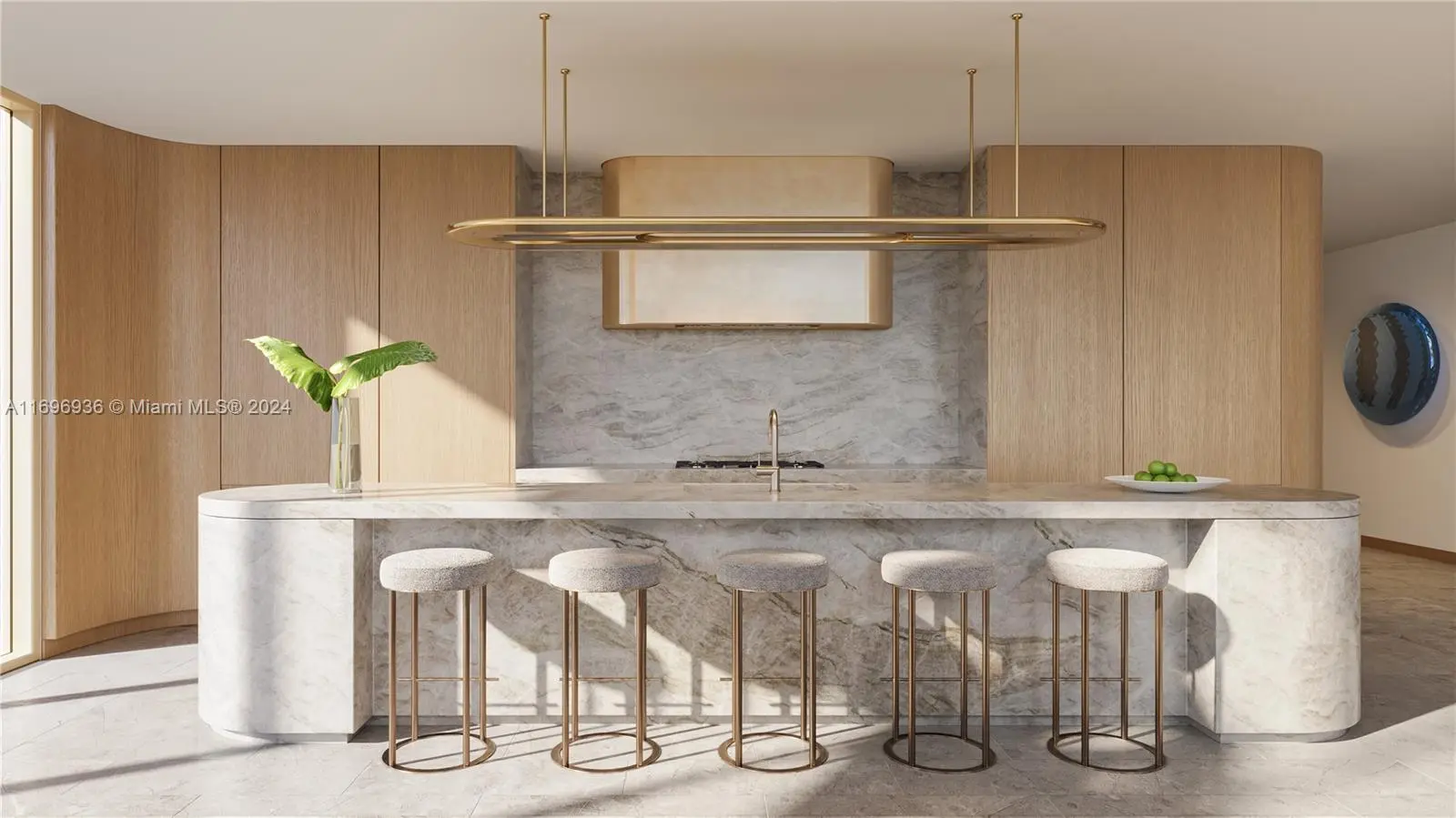 Presenting an unparalleled waterfront residence in Bay Harbor Islands, this exclusive unit boasts 75 feet of unobstructed water and golf course views. The interiors are graced with honed vanilla spider marble flooring throughout, and a kitchen equipped with Gaggenau appliances, complemented by Taj Mahal countertops and island tops. For the culinary enthusiast, a separate chef's kitchen awaits. This residence offers five bedrooms, five bathrooms, two powder rooms, plus an office and a family room. Every corner of this home reflects extreme attention to detail, with bathrooms showcasing exquisite finishes from travertine floors and leather walls in the primary to Crema di Orcia and Carrara marble in the secondary baths. Residents-Only Yacht Club and Marina. Only nine waterfront homes.