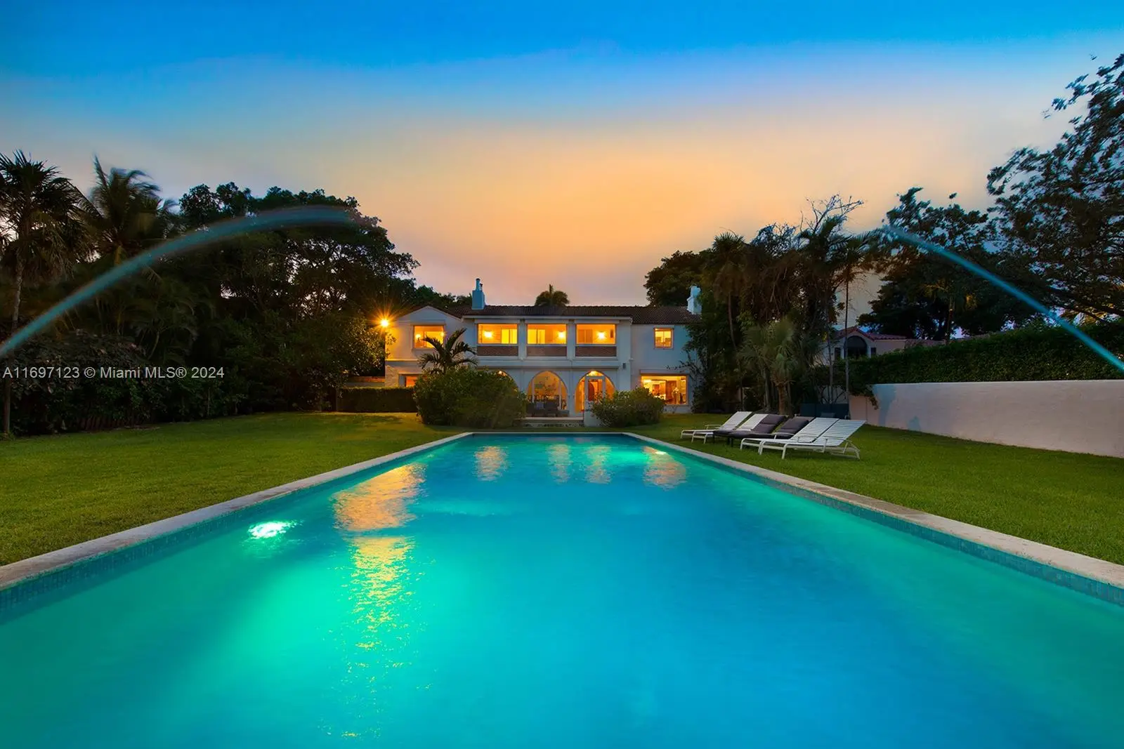 Grand Estate on prestigious Pine Tree Drive. Located on an acre of land ,the home features large rooms, formal dinning , library, gourmet chefs kitchen, grand salon, coffered ceilings , custom built ins, impact doors/ windows , 10 bedrooms and 9.5 bathrooms. Home has three detached guest houses. Architectural integrity throughout the home. Long driveway surrounded by royal palms creates a dramatic entrance to the home. 100’ of waterfrontage with no fixed bridges, infinity edge pool with fountains.