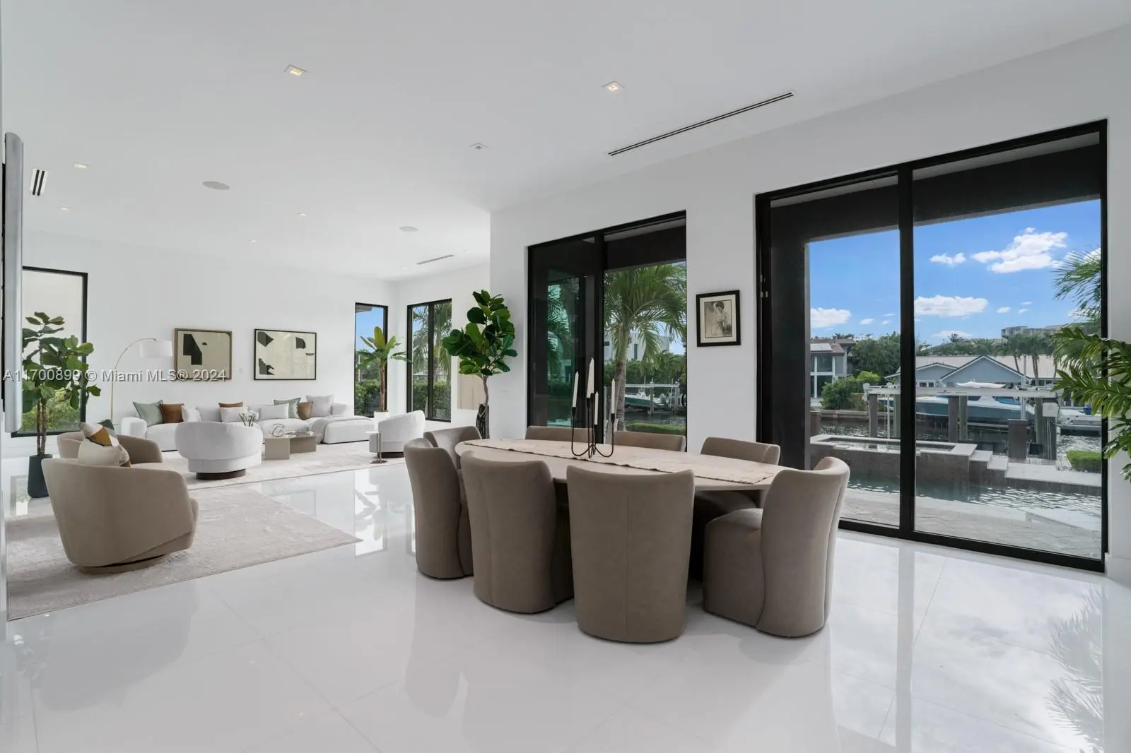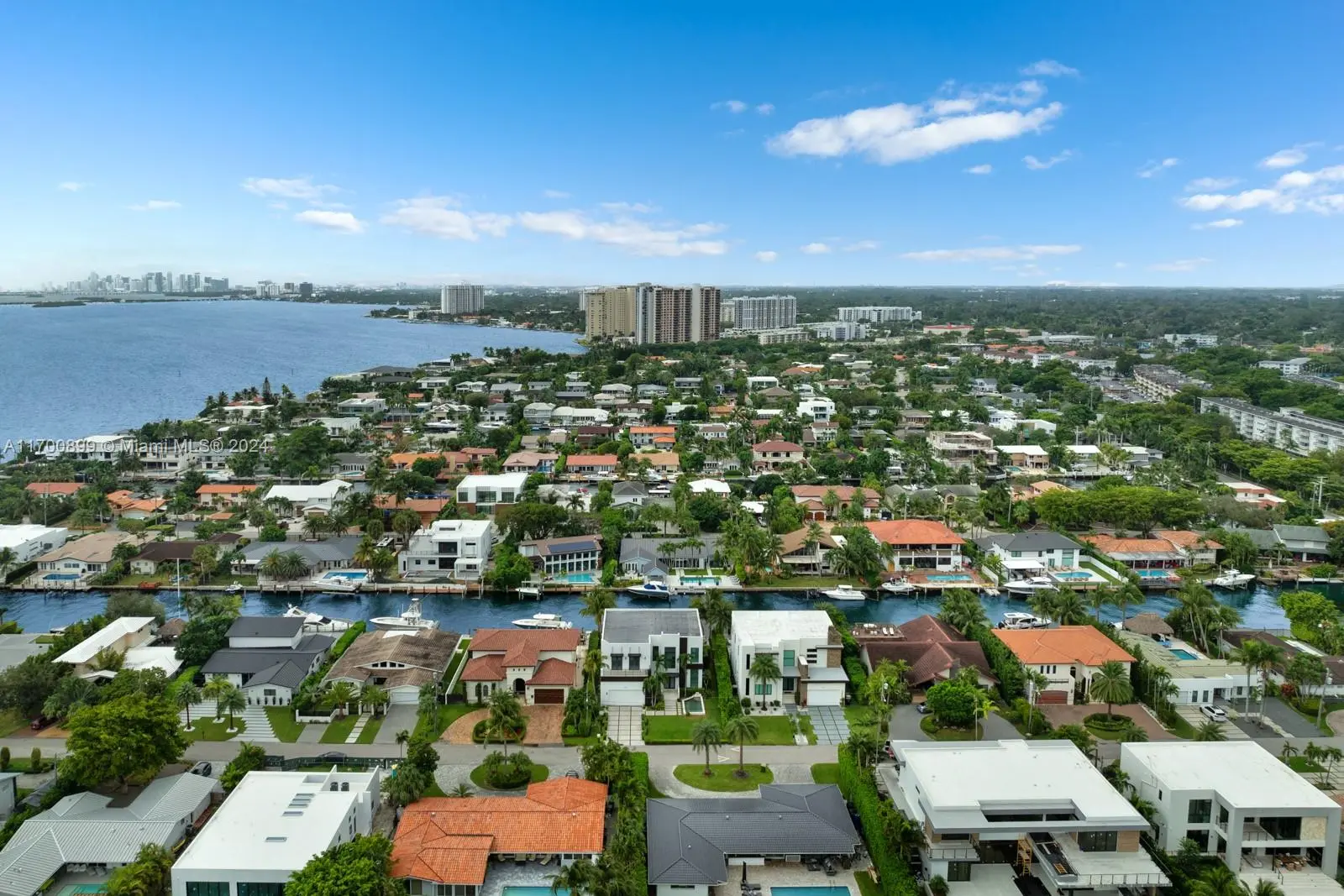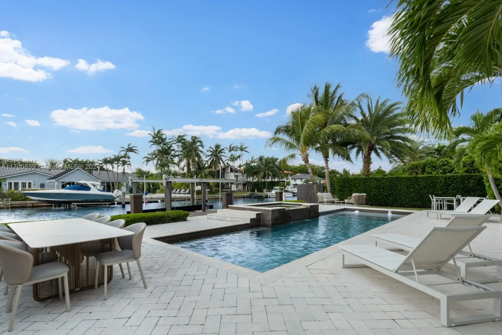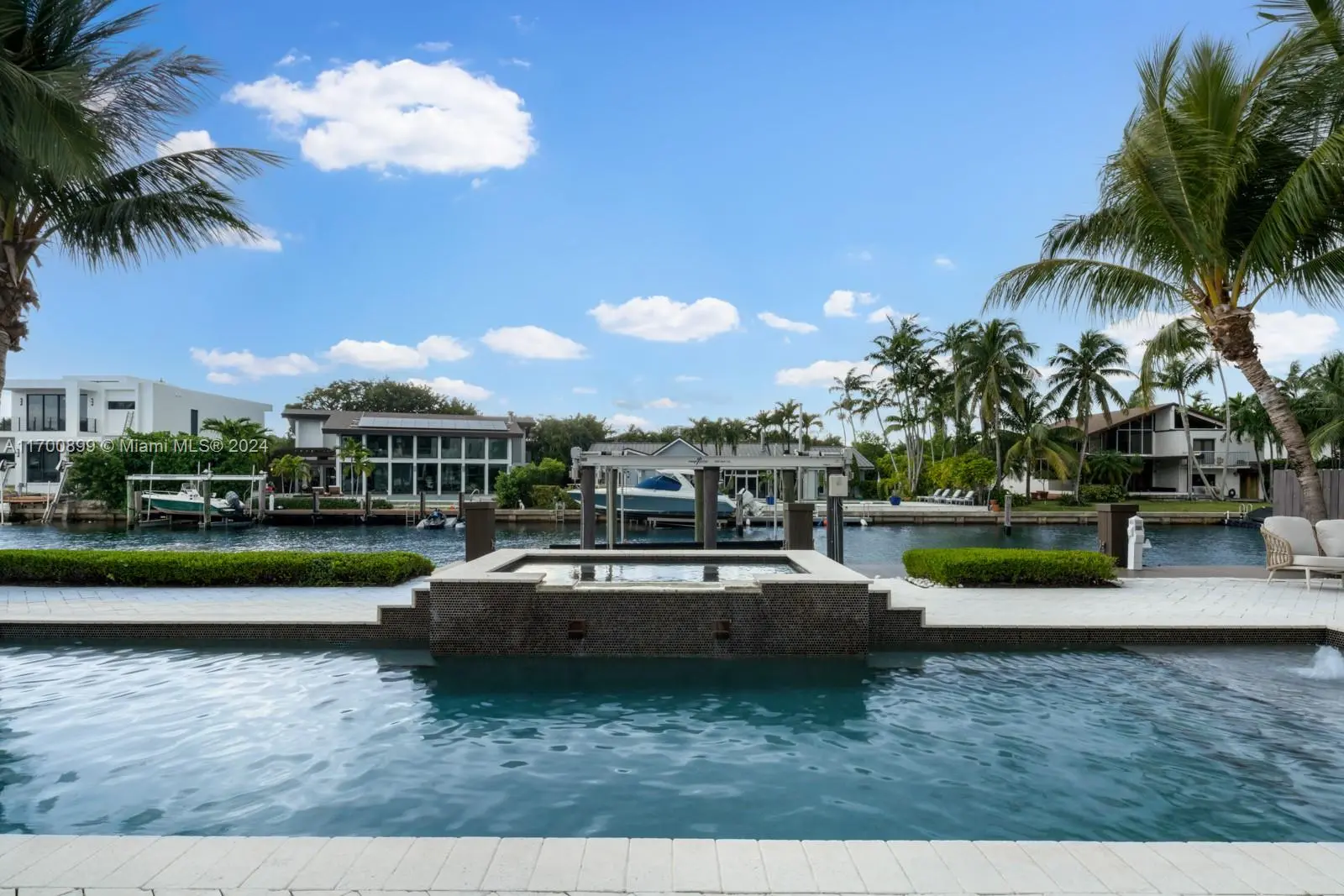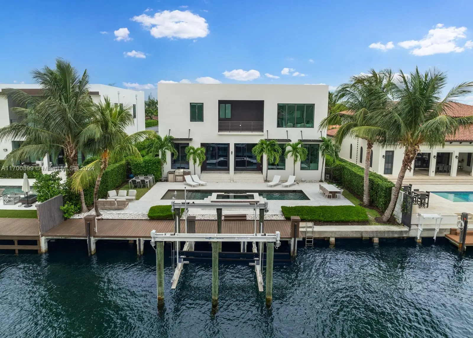Introducing this stunning two-story waterfront home in the exclusive, guard-gated San Souci Estates. Built in 2016, this 4,800+ SQFT luxury residence boasts 12+ ft high ceilings, an open floor plan, grand entrance w/ double height ceilings, 6 bedrooms, a den/office, and 7 bathrooms. Enjoy 75+ ft of WF with direct bay/ocean access, no fixed bridges, a saltwater pool, jacuzzi, private dock, and boat lift. The chef’s kitchen features a Wolf gas cooktop, Sub-Zero fridge/wine cooler, ample seating space all w/ breathtaking water views. The expansive master suite offers dual walk-in closets, a large shower with tub, separate sinks, + a private balcony. Park your cars in a two-car garage, 4 car driveway! 24/7 security as well