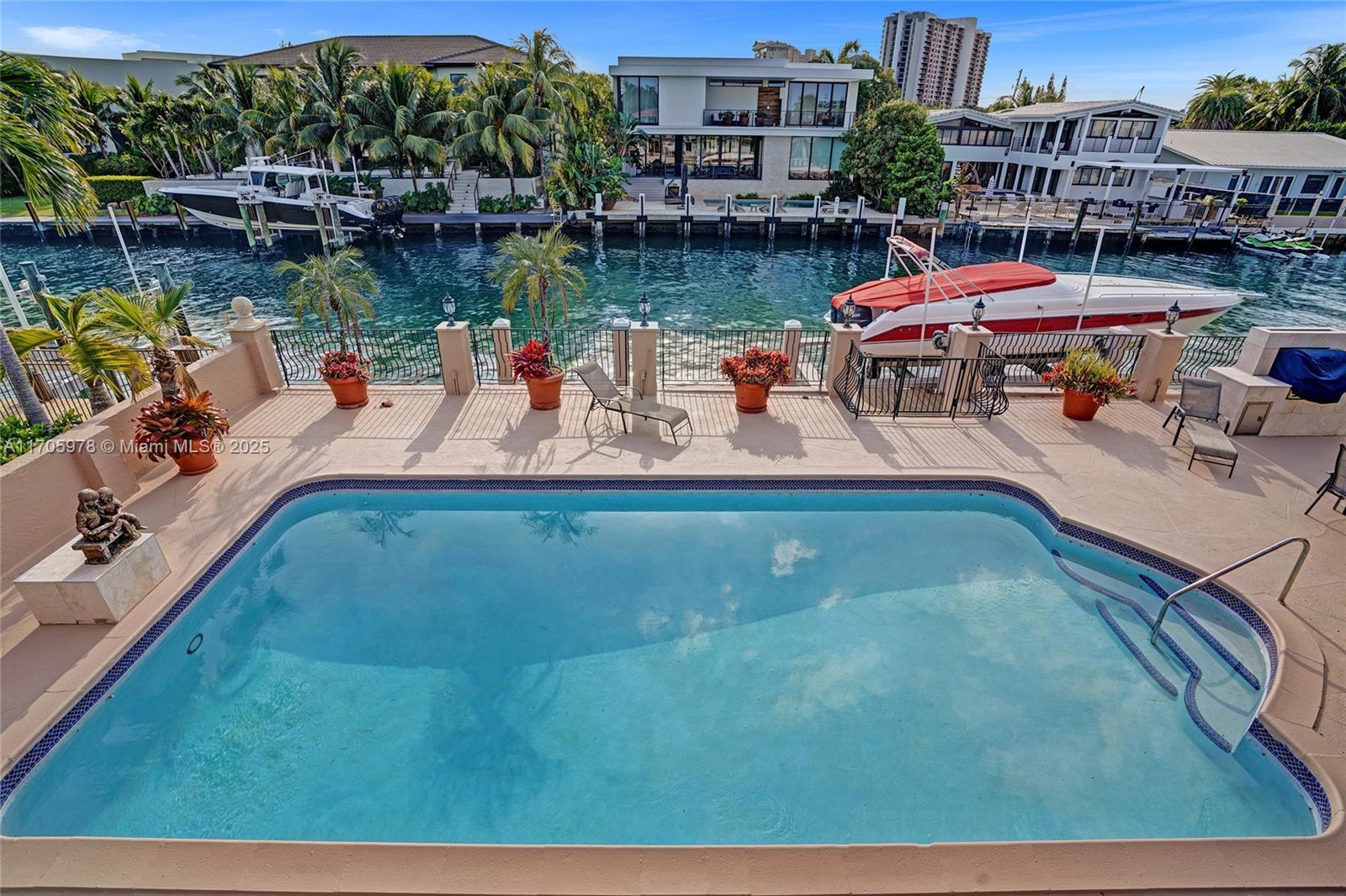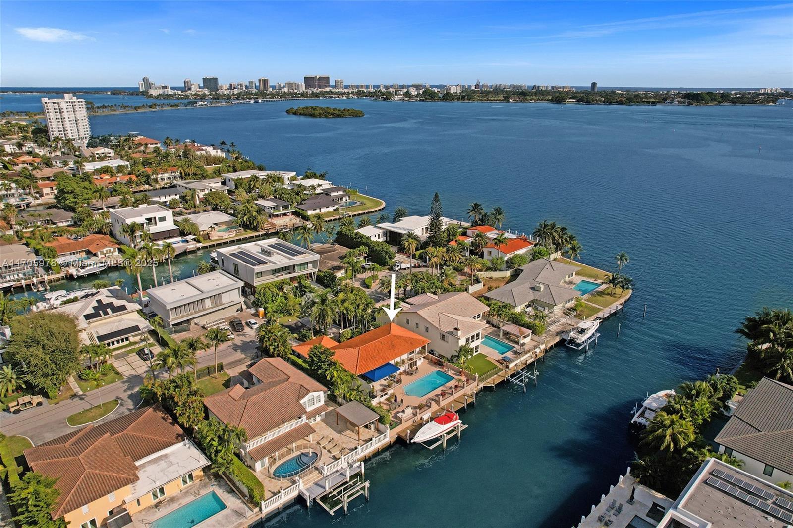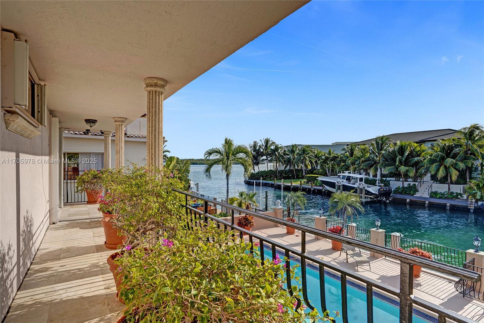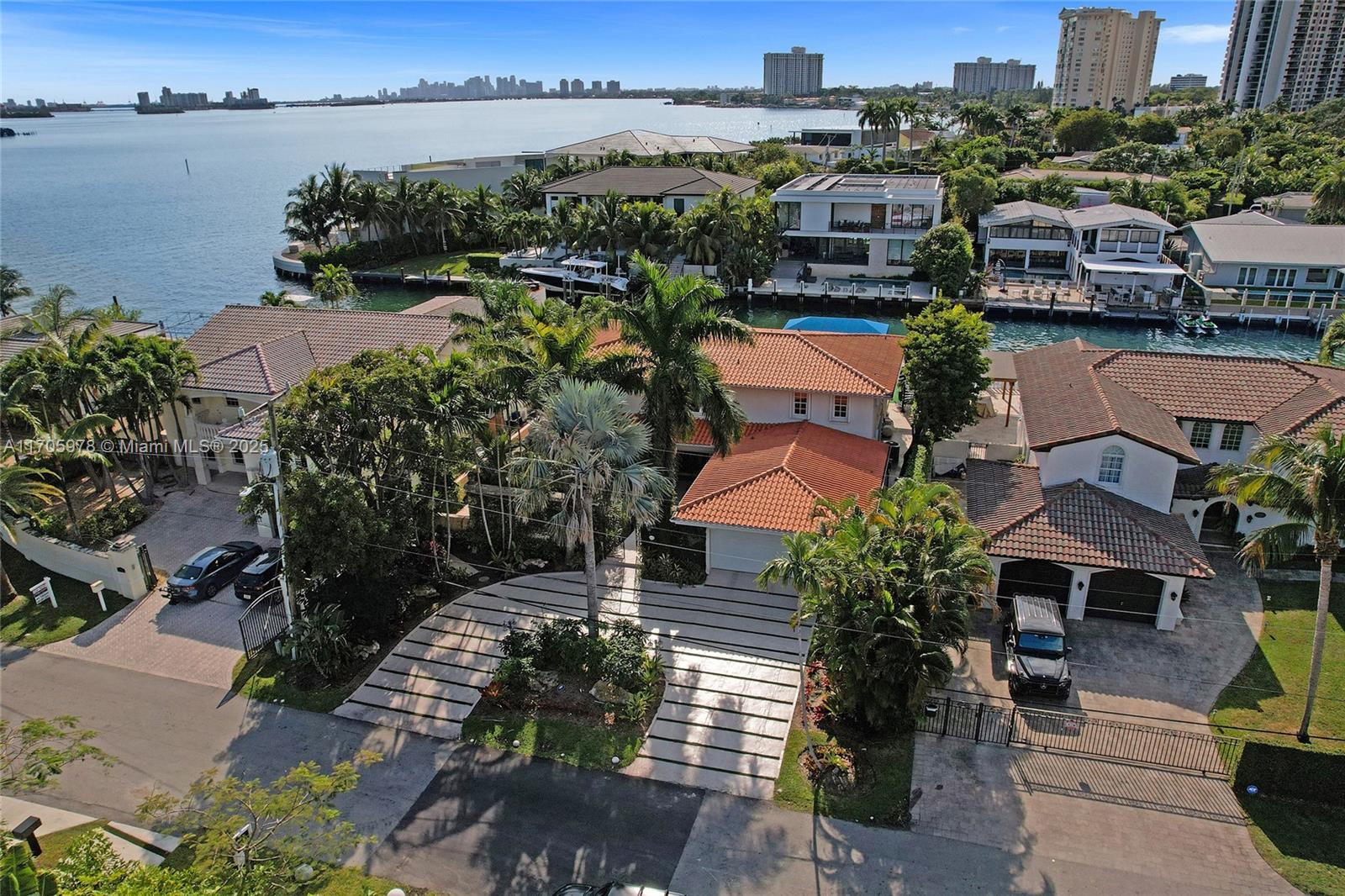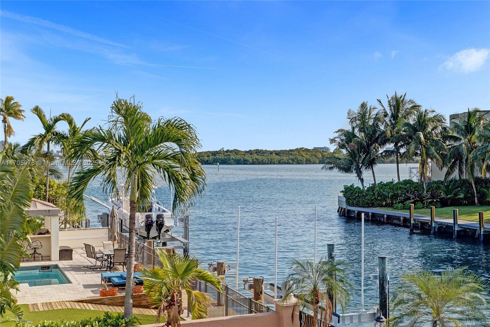 One of a kind with Bay views!!!! Located in the gated, police-protected community of Sans Souci Estates, this 2-story concrete home offers breathtaking open bay views and an extra-wide deep-water canal with ocean access just minutes away. Perfect for larger boats, it features a 20,000-lb boat lift and a sprawling outdoor entertaining area with a pool, lush landscaping, and up-lighting. Inside, enjoy 5BR/4BA, soaring ceilings, marble floors, and natural light throughout. The oversized master suite boasts one of the largest layouts in the area, a spa-like bath, and a huge private terrace overlooking the bay. The air-conditioned 2-car garage doubles as flexible space. This premium property shines day and night, offering luxury waterfront living at its finest.