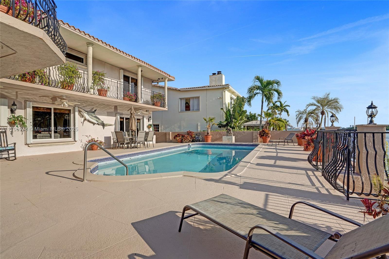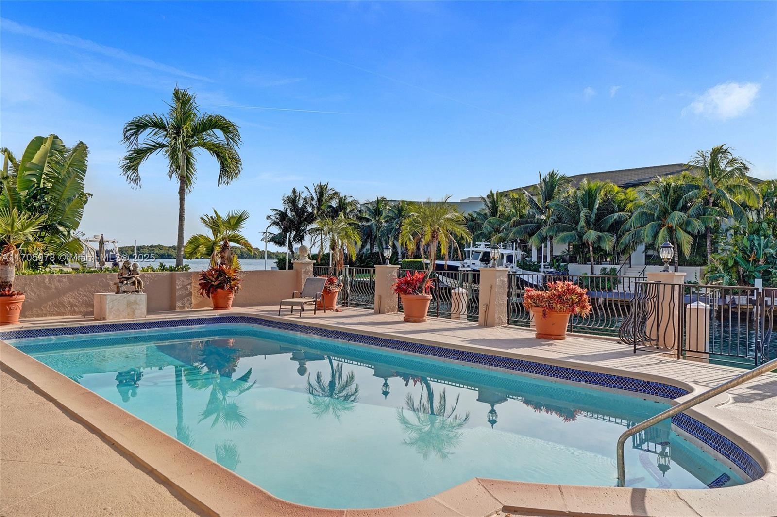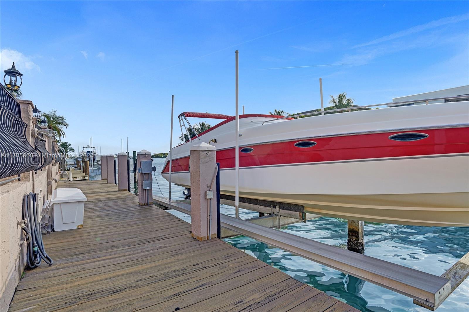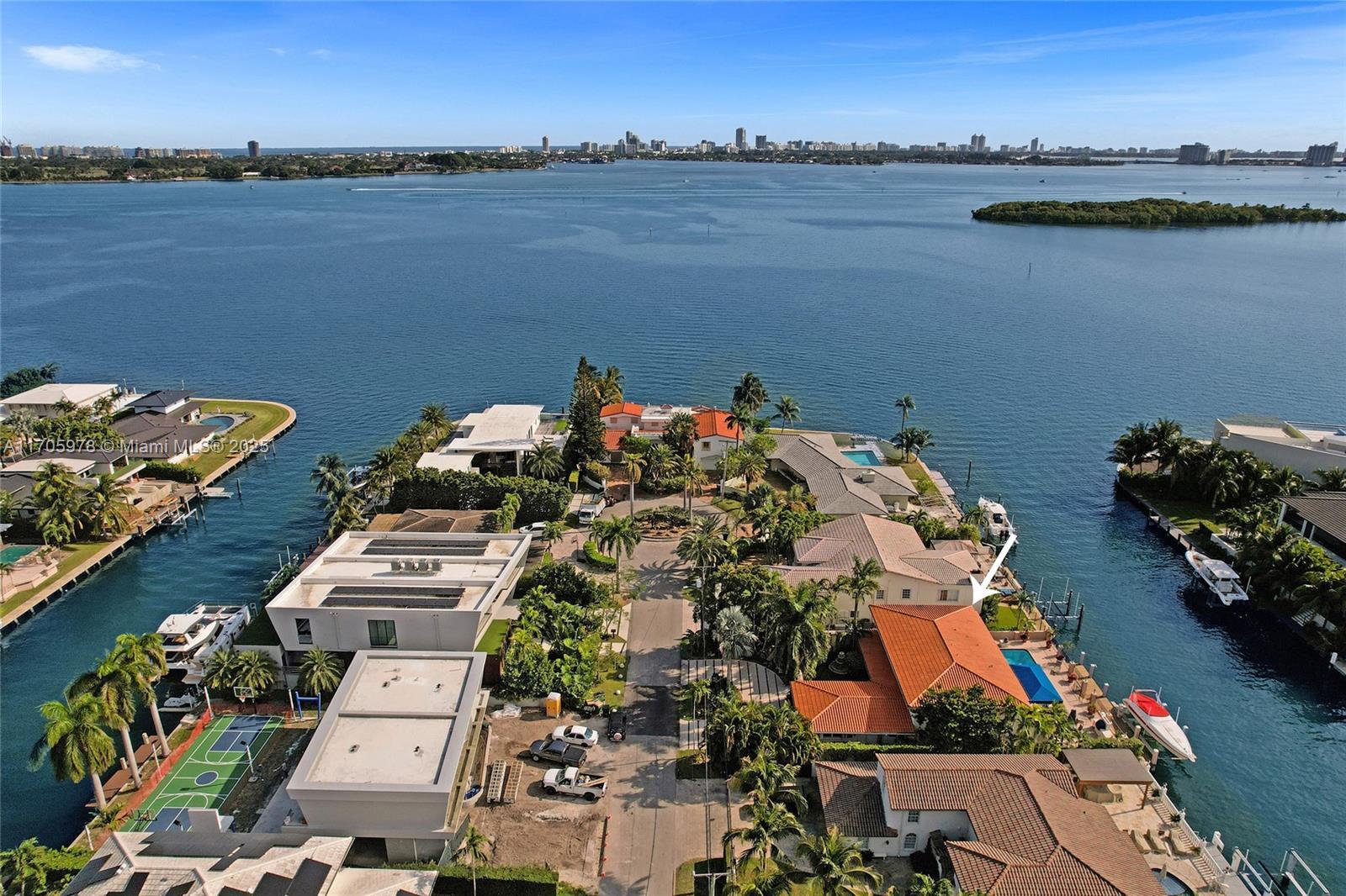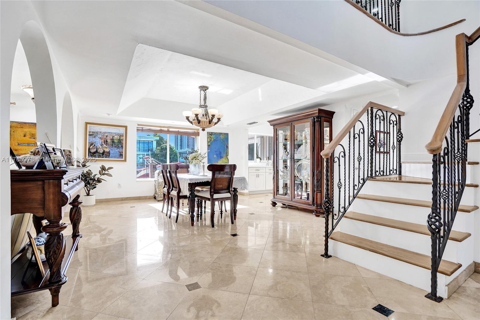 One of a kind with Bay views!!!! Located in the gated, police-protected community of Sans Souci Estates, this 2-story concrete home offers breathtaking open bay views and an extra-wide deep-water canal with ocean access just minutes away. Perfect for larger boats, it features a 20,000-lb boat lift and a sprawling outdoor entertaining area with a pool, lush landscaping, and up-lighting. Inside, enjoy 5BR/4BA, soaring ceilings, marble floors, and natural light throughout. The oversized master suite boasts one of the largest layouts in the area, a spa-like bath, and a huge private terrace overlooking the bay. The air-conditioned 2-car garage doubles as flexible space. This premium property shines day and night, offering luxury waterfront living at its finest.