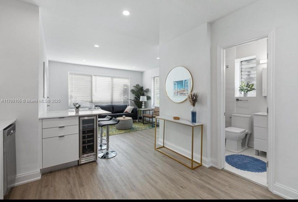 Experience the perfect blend of modern style and beachside living in this bright and spacious 2-bedroom, 1-bath apartment. The large main bedroom features custom closets, while the second bedroom offers versatile space that can easily serve as a home office or den. A spa-inspired bathroom provides a peaceful sanctuary. The open-concept living area flows effortlessly into a sleek, contemporary kitchen outfitted with stainless steel appliances, including a dishwasher, wine cooler, and an island with seating—ideal for hosting. Additional perks include the convenience of an in-unit washer and dryer. Situated in a prime location, this apartment combines comfort, style, and easy access to everything you need. Come see what coastal living is all about!