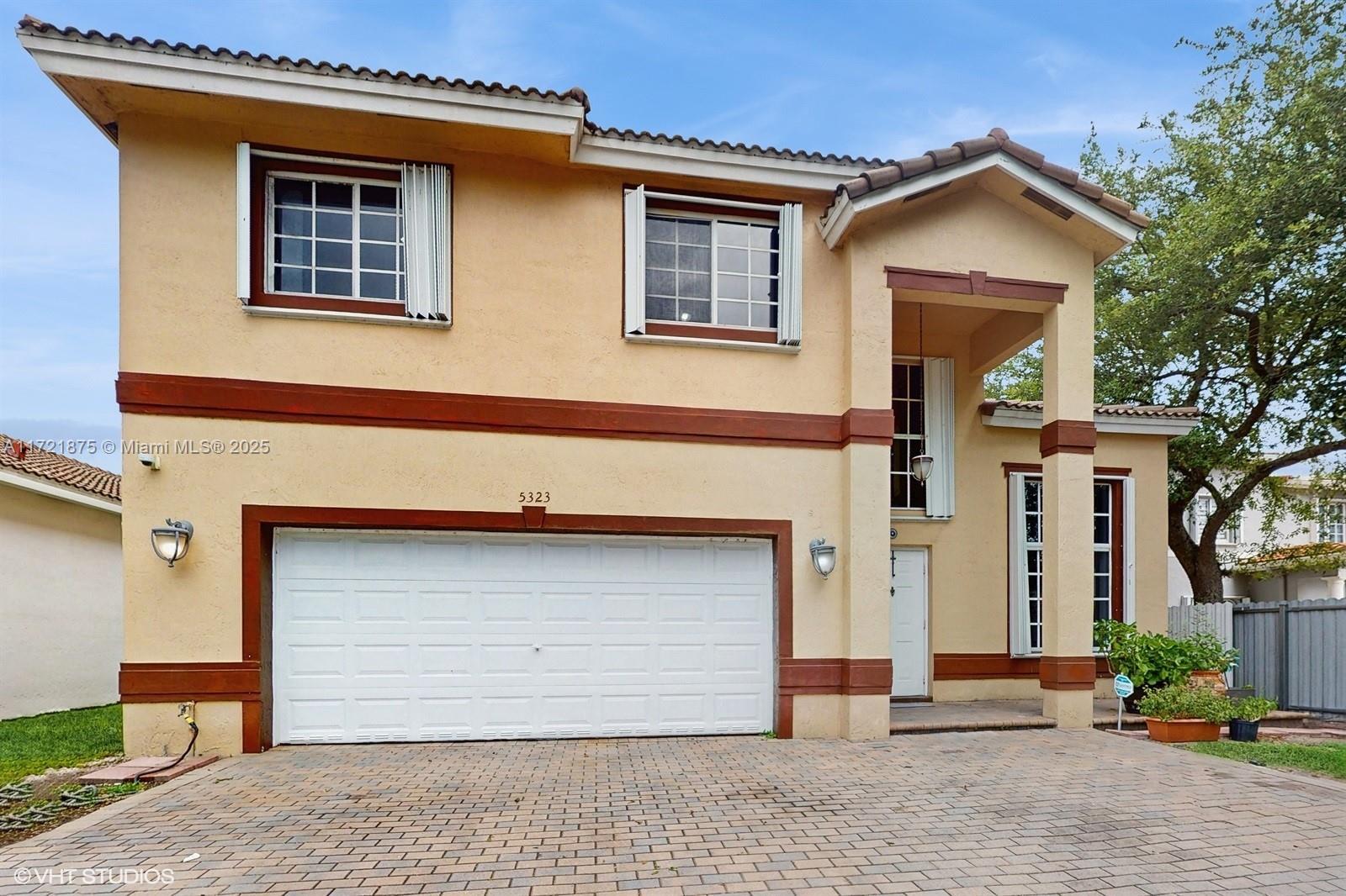 The Happy Home-Located on a quiet cul-de-sac within Doral Gardens,a gated community. Spacious 2 Story home HOA (Only $315.00 Monthly), Built 2000. 4 Bedrooms 3 full baths. Atractive "split floorplan" for multi-generational lifestyle. (Upstairs-3 bedrooms 2 baths Downstairs- One bedroom 1 full bath.) 2 car garage, Updated kitchen, counter seating. Food & butlers pantry. Laundry room, Lots of storage space throughout. Natural light and high ceilings fill this home with great energy. Full storm protection. Great floorplan and location. Well maintained, home is ready for you to enjoy it is (TURNKEY & MOVE-IN READY!) Private back yard with covered terrace enjoy as-is or build a pool ! Ample parking for family and friends.
