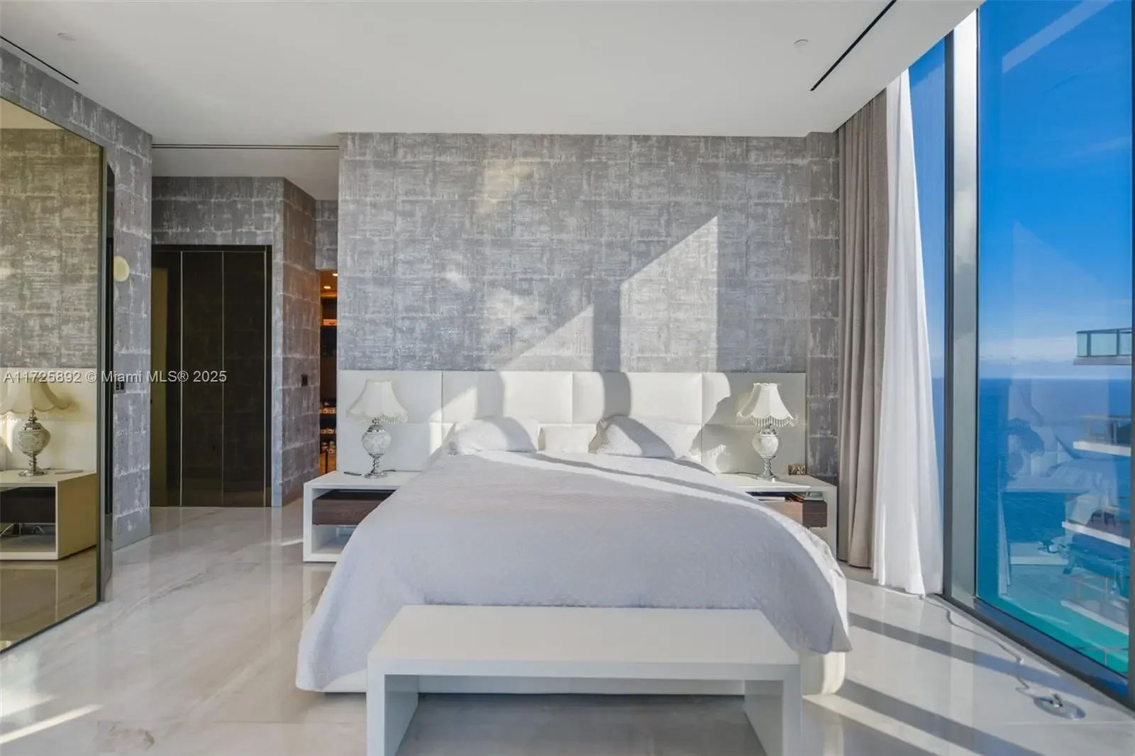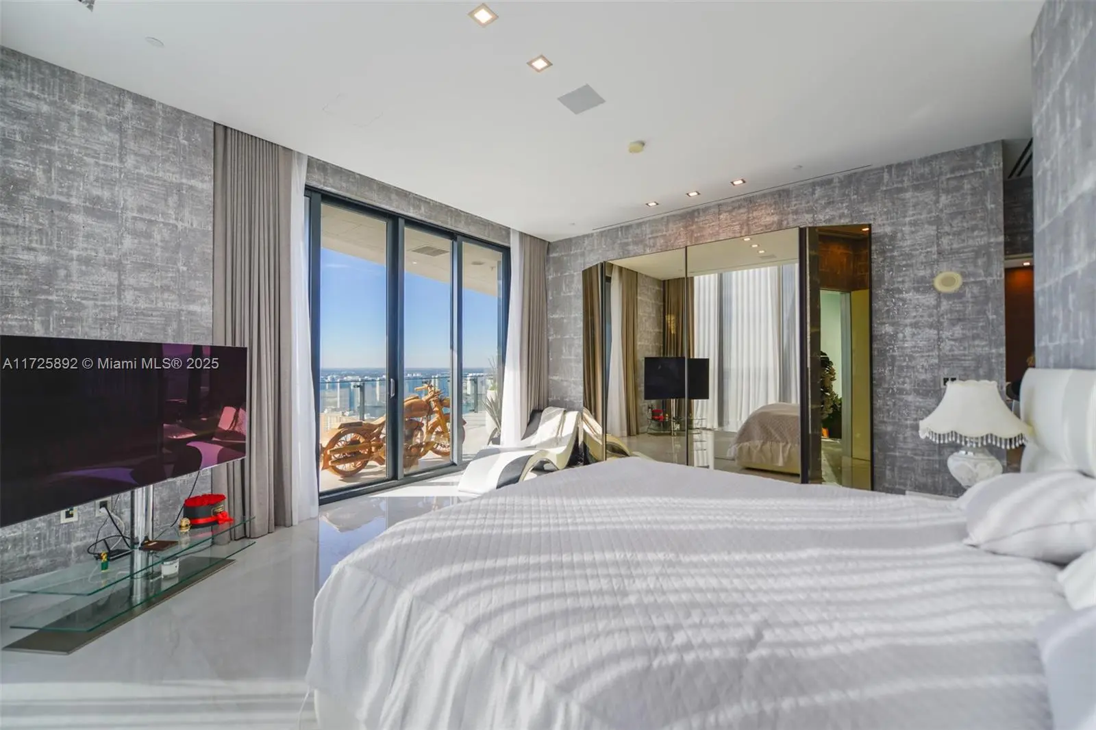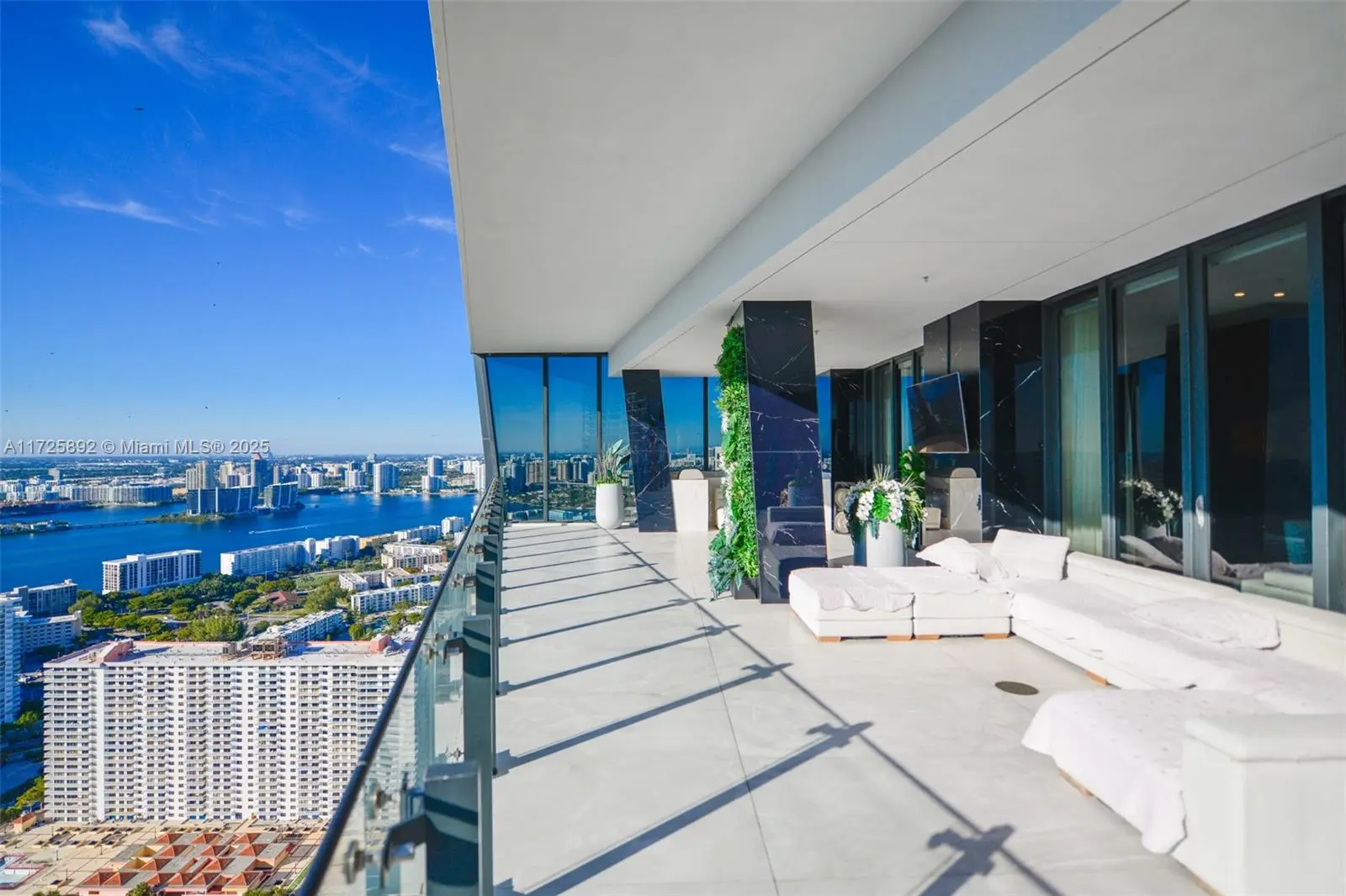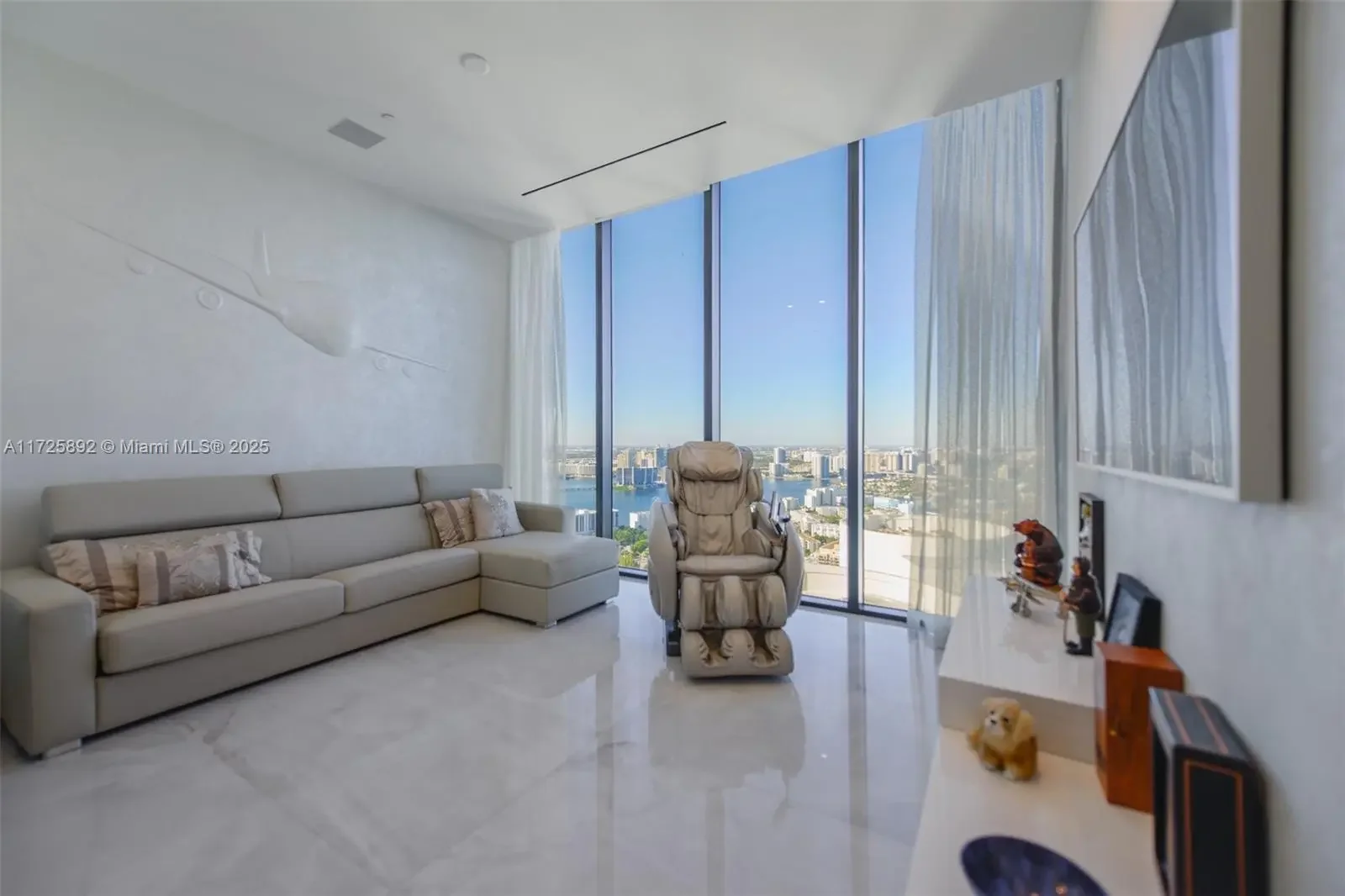 Enjoy unobstructed City, Intracoastal, and some ocean views from this high-floor corner residence in Muse Sunny Isles Beach. This remodeled with designer finishes 2 bed and 2,5 bath smart home unit with private foyer entry, 12’ ceilings, and gourmet kitchen. The floor plan was improved by expanding the living room, Italian porcelain floors throughout, bubble water panel with LED lights, handcrafted onyx in the guest bathroom, bamboo wallpapers, black marble slabs give the elegant covering of the columns at the balcony, and Italian doors. Large outdoor living space w/summer kitchen. With only 63 ultra-luxury exclusive residences Designed by Carlos Ott, an edge pool and spa overlooking the Atlantic Ocean, a State-of-the-art fitness center, and a Fully automated parking system.