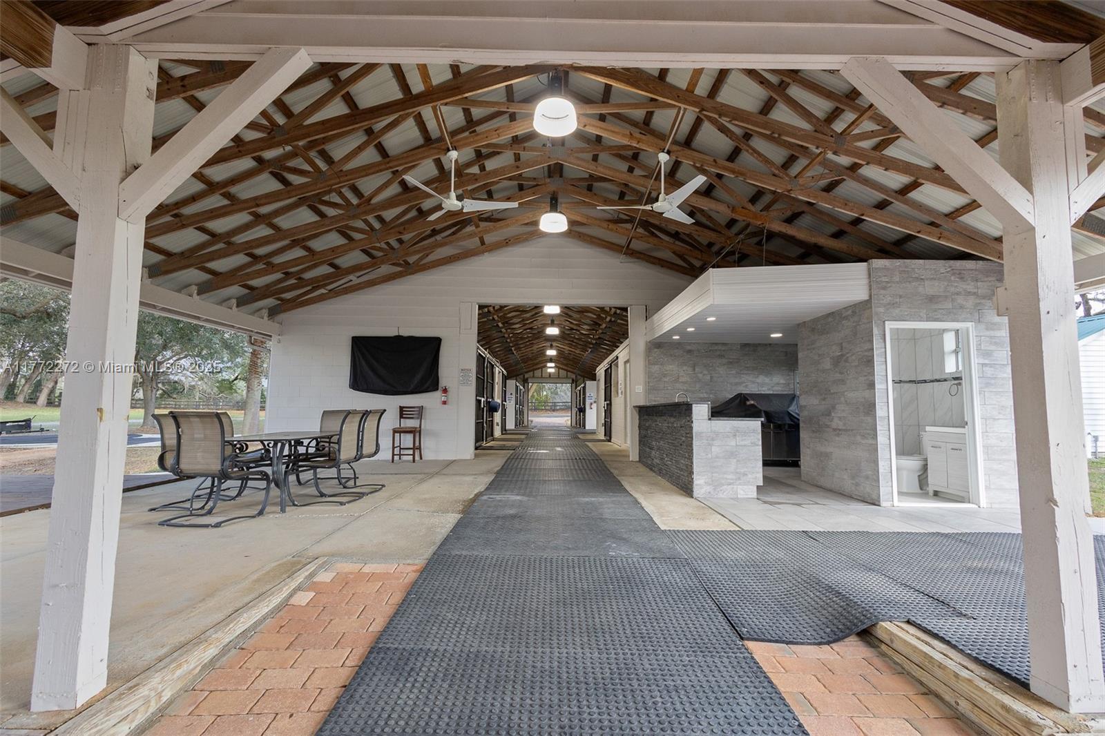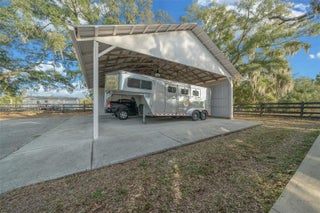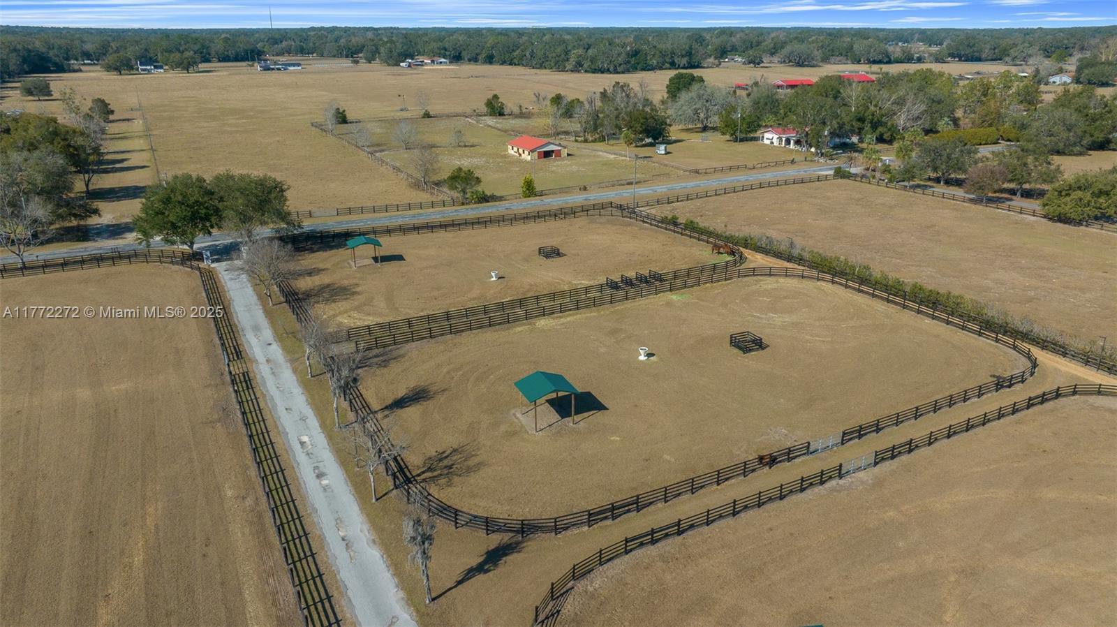 Located in southern Marion County, only 15 minutes from the Florida Horse Park and I-75, 30 min from WEC and close to the Villages. This property is ready to go to work with upgrades including fencing with CenFlex, 2 Concrete Barns with a total of 20 stalls, 4 additional wood barns (two are 12 x 24 and two 12x12) with 6 additional stalls designed for overflow or isolation, creating a total of 26 stalls across all barns. Among equestrian amenities are Covered Round Pen with a little sitting area on either side, ideal for observing training or giving lessons in any weather and a Horse Walker for cooling down or low-impact exercise. The 9 paddocks are spacious and well maintained, equipped with automatic waterers, ensuring horses stay hydrated & comfortable. Entertainment area outdoor kitchen