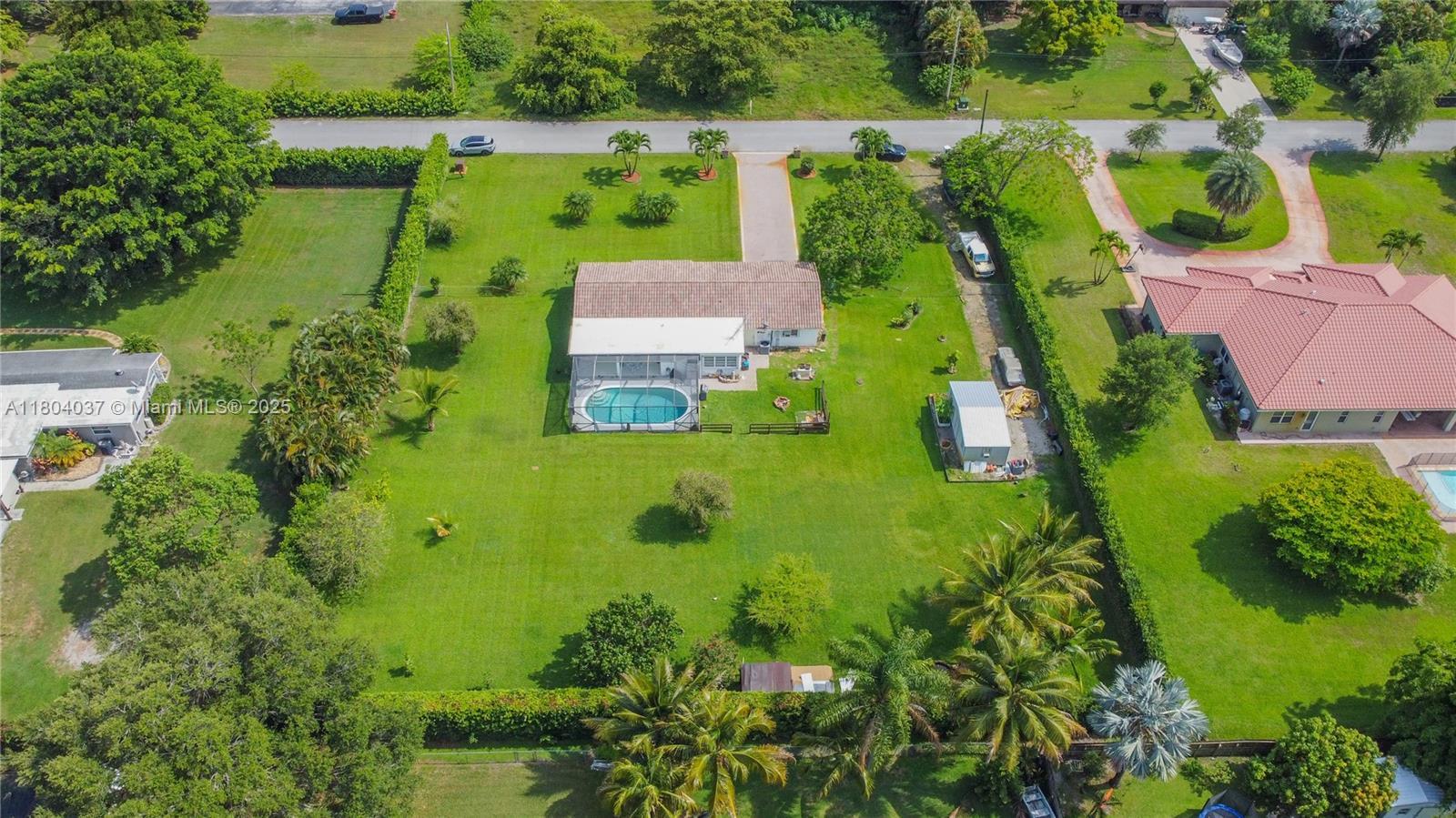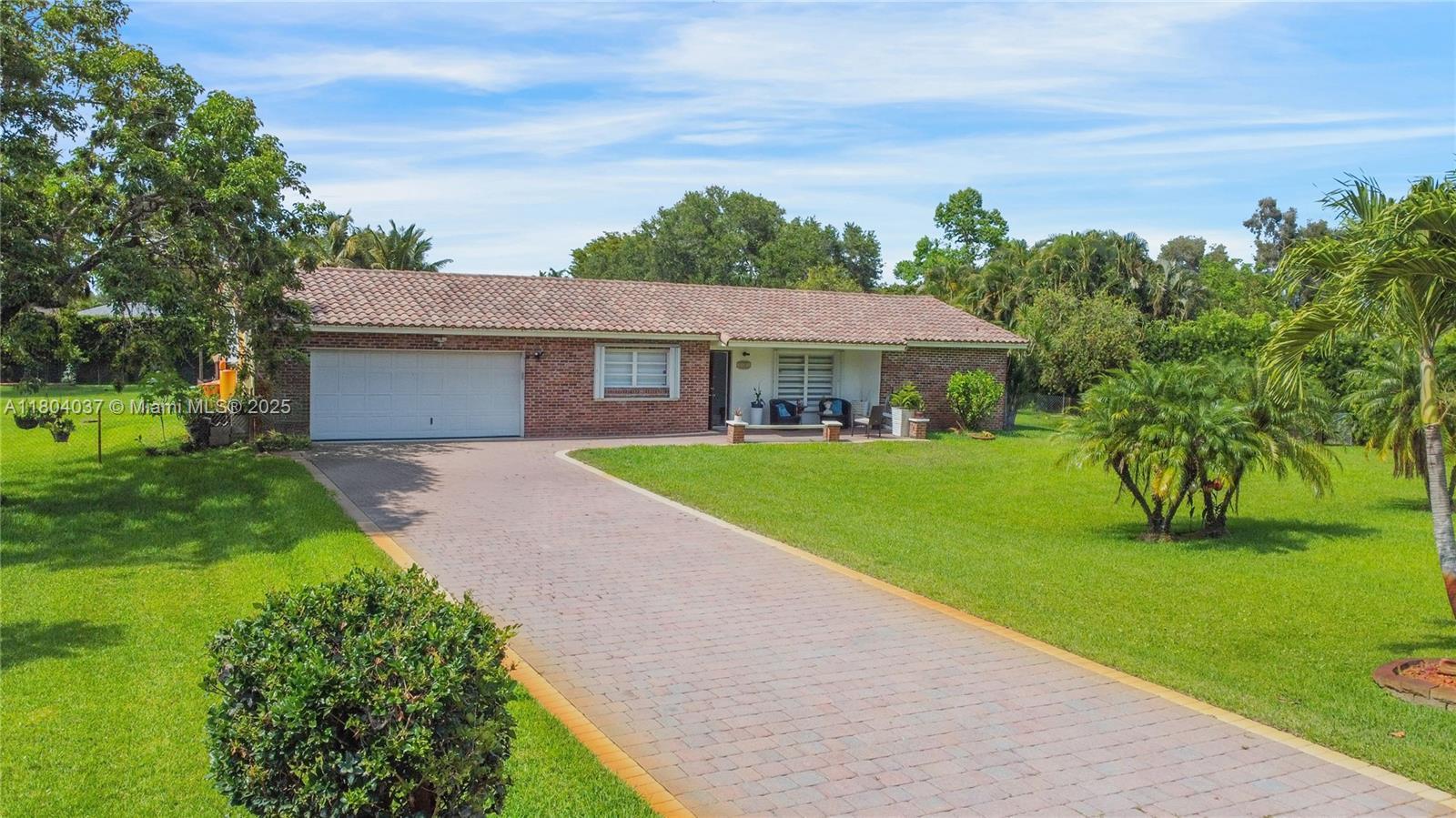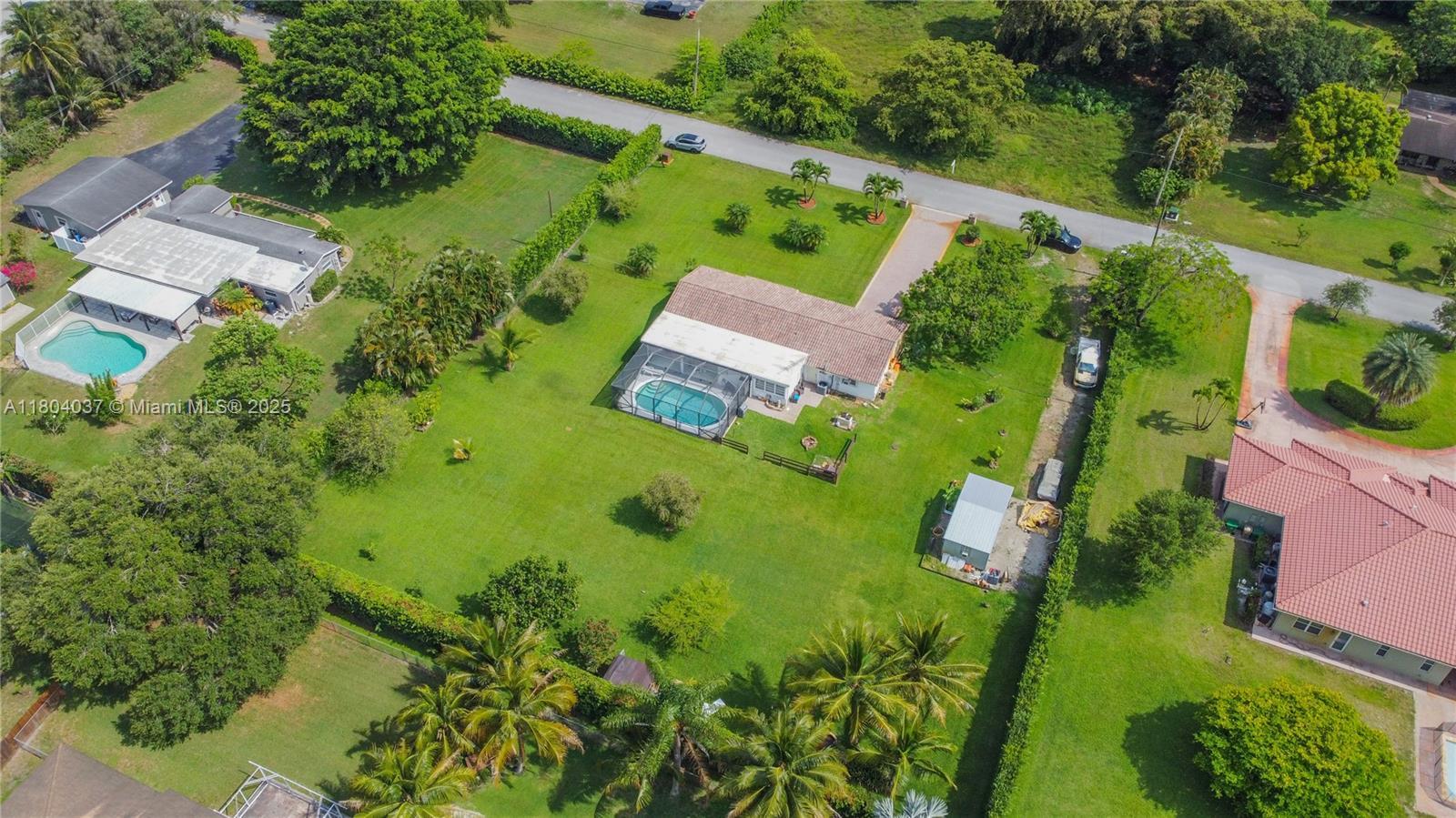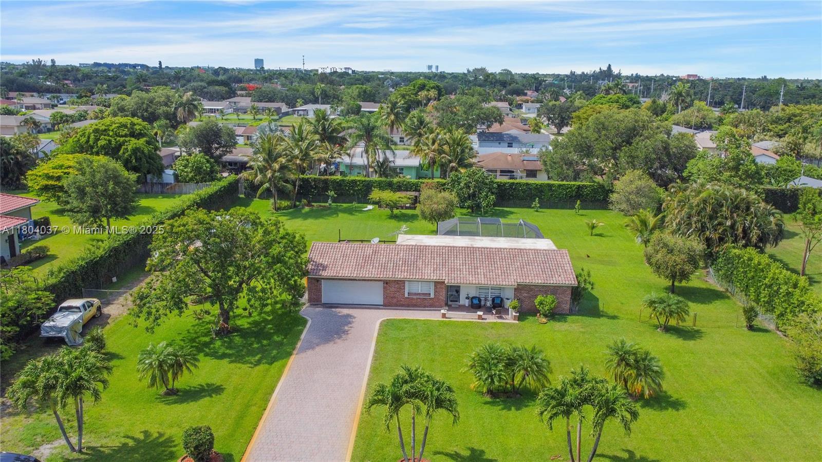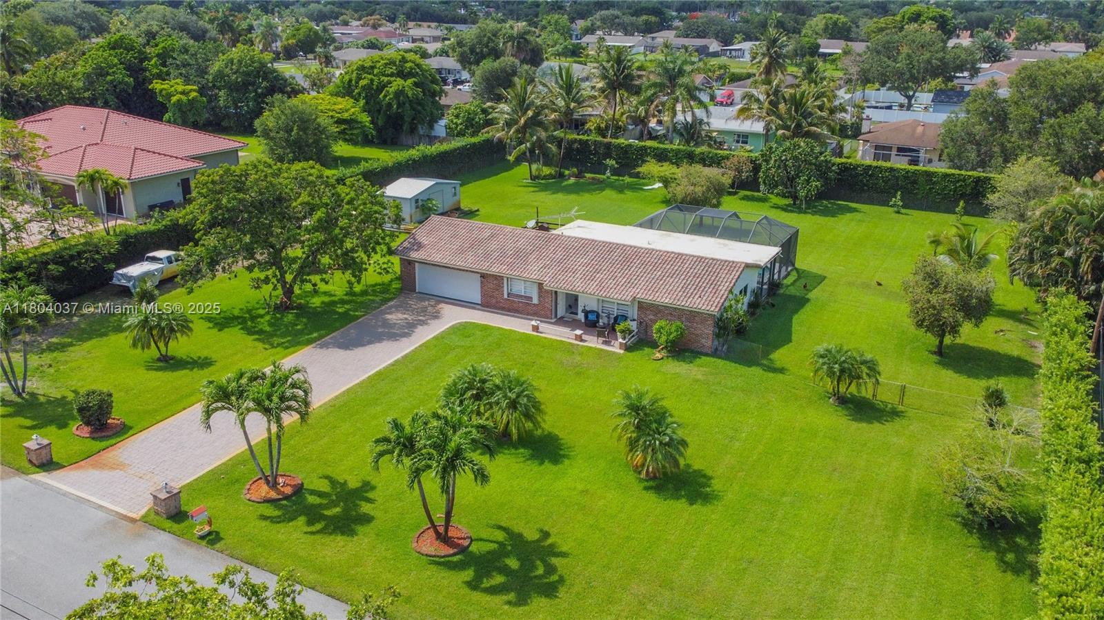 Stunner one-acre lot in Davie offers plenty of space to expand this cozy 2/2 single family with screened pool. The one-story home has split floor plan, master bedroom with walking closet, hurricane impact windows, accordion shutters and impact doors. The screened backyard area offers a separate covered area so you can enjoy the pool without getting sunburned. The oversized lot features lush tropical landscaping, with fruit trees including coconut and mango trees. Storage Shed 24x12 offers extra storage space/workshop. 2 Car garage and super long driveway fit up to 6 cars and additional space to park your boat, RV, or trailer. No HOA! A hardwired generator for the whole home. New A/C, pool equipment and water softener. Close to I-595, restaurants, and shopping. Seller is highly motivated!