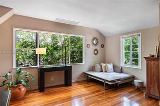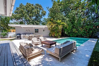 2-story home in Miami Shores East of US-1. Comfortable home, warm & welcoming with oak/mahogany floors, fireplace, built-in bookshelves & custom touches. The large living room leads to a dining room & kitchen with many cabinets, marble countertops, stainless steel appliances & a cozy dining area. The family room features distinctive tile floors, a brick accent wall & a window overlooking the pool & garden area. The yard is very private & fenced, perfect for outdoor entertaining. The first floor features one bedroom with an ensuite half bath that is perfect for guests as well as a bright primary bedroom suite with a big closet, private bath and glass window opening to a large wood deck. The second floor has 2 bedrooms. Impact windows, Detached garage and additional room with A/C.