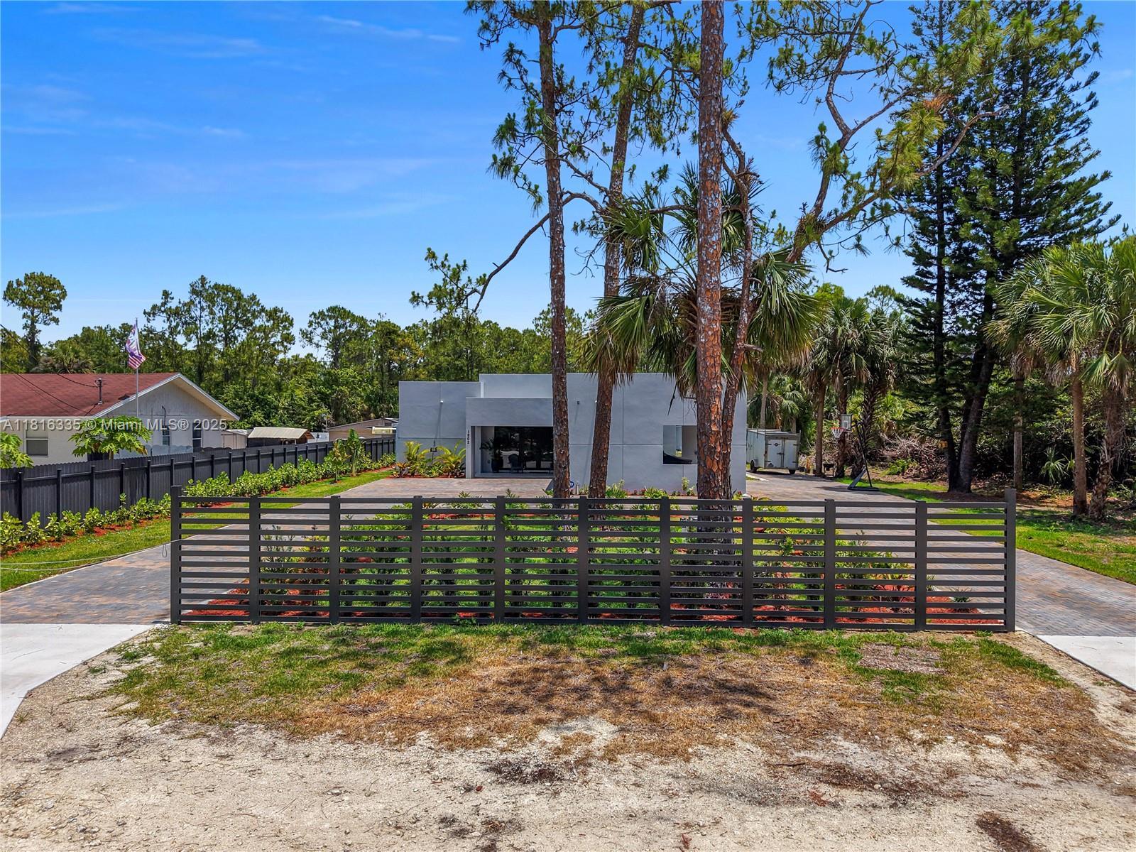 Modern luxury meets Florida living in this stunning 3-bedroom, 2-bath home on a spacious 0.5-acre lot. Built in 2024, this over 1,900 sq ft residence features an open-concept layout, a chef’s kitchen with quartz counters and stainless steel appliances, and a spa-like primary suite. Enjoy high ceilings, smart home features, impact windows, and perfect for outdoor living. Fully equipped with all appliances, including washer/dryer. No HOA and plenty of room for a pool, RV, or boat. A rare find in Naples—schedule your showing today!