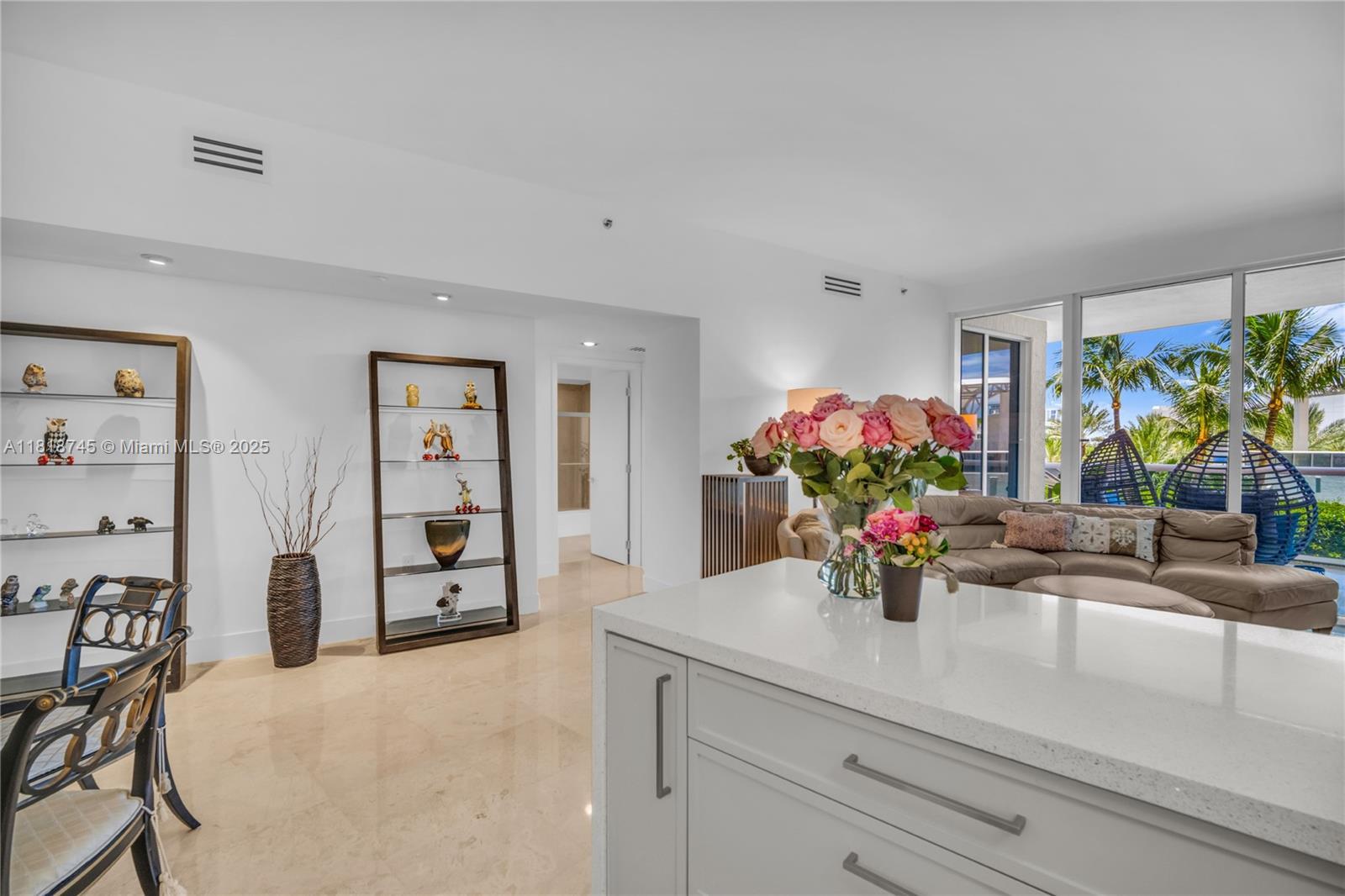 Private. Peaceful. Perfectly Positioned. Tucked away on the first residential floor, this 1,658 sq ft 2BR/2BA is generously sized with excellent closet space throughout. It is the only residence on its level—offering rare privacy, direct access to parking, and no adjacent neighbors. The oversized terrace is framed by lush palms, creating a natural screen of greenery and serenity. At night, enjoy soft views of the illuminated water sculpture below. A newly renovated kitchen and pristine interiors complete this one-of-a-kind, move-in ready home.