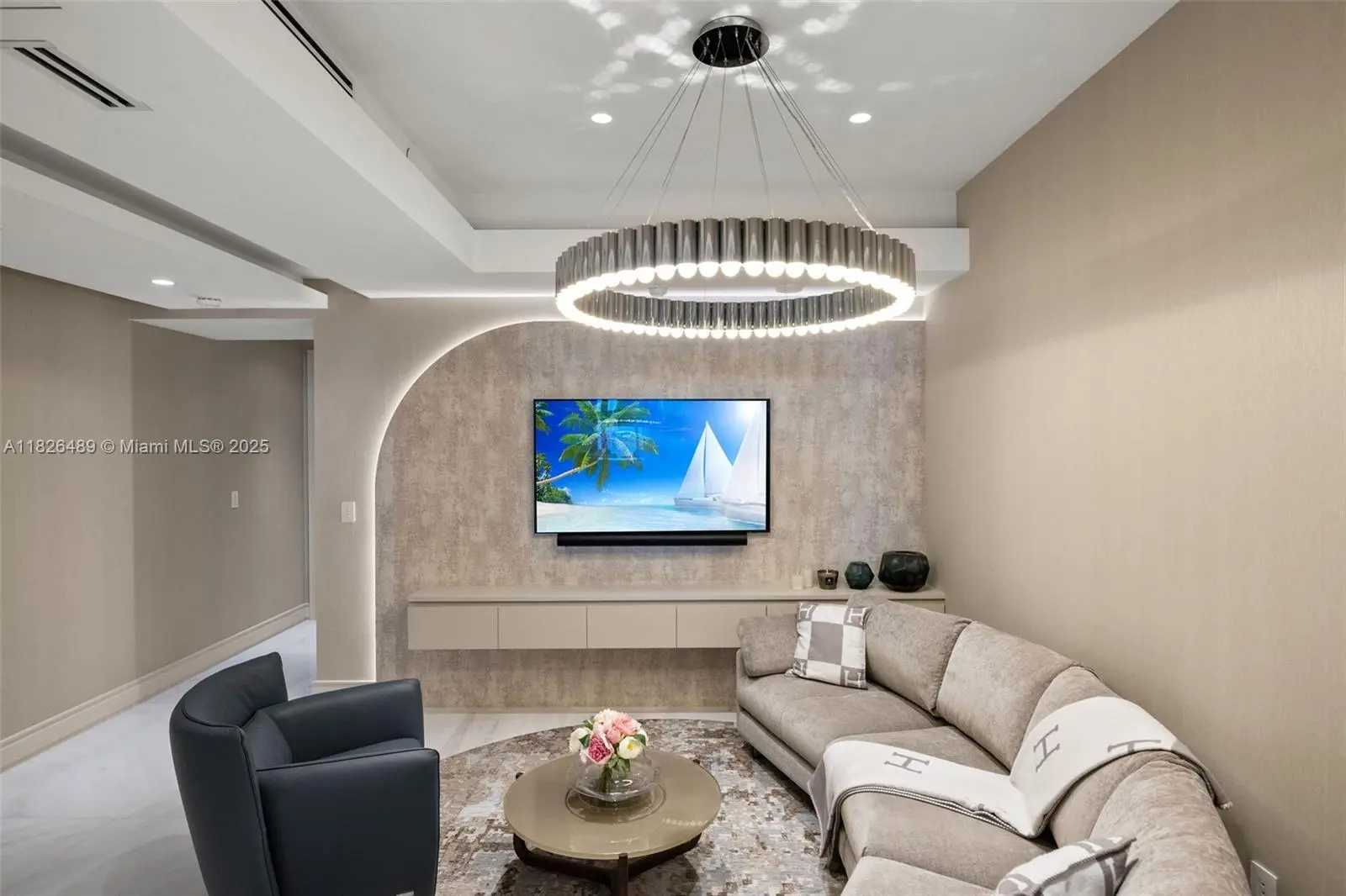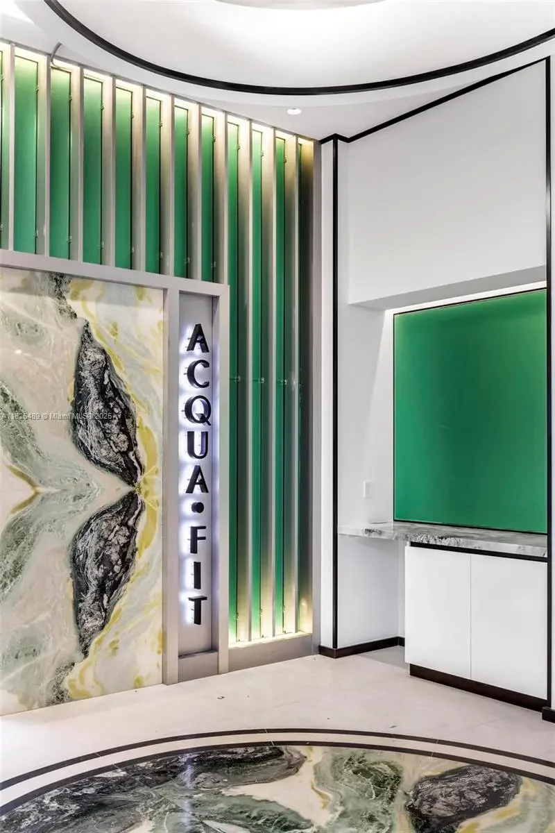 Oceanfront “Vecchio” residence at The Estates at Acqualina, designed by DKOR Interiors. Flow-through layout with 4 bedrooms, 5 bathrooms, and a den. Features include spacious great room and family room, two terraces with ocean and Intracoastal views, Miele appliances, and La Cornue gas range. Smart home automation with electric shades and blackouts. Primary suite includes dual bathrooms with onyx finishes. Full-service building with amenities such as spa, theater, ice-skating rink, bowling alley, Avra restaurant, and more. Offered furnished with Fendi, Poltrona Frau, and B&B Italia pieces. $8.5M.
