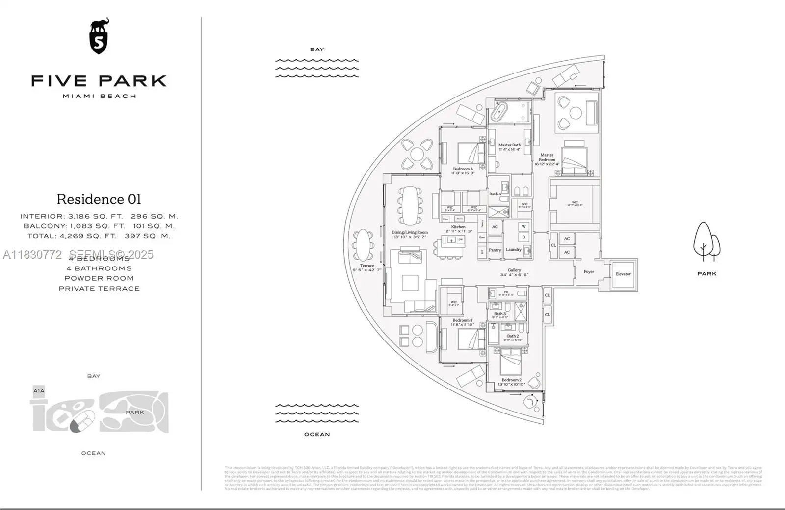 An ultra-exclusive corner residence at Five Park with 3,200 SF interior + 1,100 SF wraparound terrace. Breathtaking 180° views of the ocean, Miami skyline, South of Fifth & Fisher Island. High-floor unit just below the penthouses with 11'+ ceilings and floor-to-ceiling windows. Upgrades include Apple Smart Home system, custom closets, electric blinds, and renovated primary bath. Currently being reconfigured from 4 beds to 3, with a fully redesigned and expanded kitchen that enhances flow and opens up even more skyline views. Renderings attached. As part of the exclusive Canopy Collection residents enjoy access to private 26th-floor Canopy Club, 2 pools, gym, spa, beach club, restaurant & more—steps from South of Fifth in Miami Beach’s newest iconic tower.