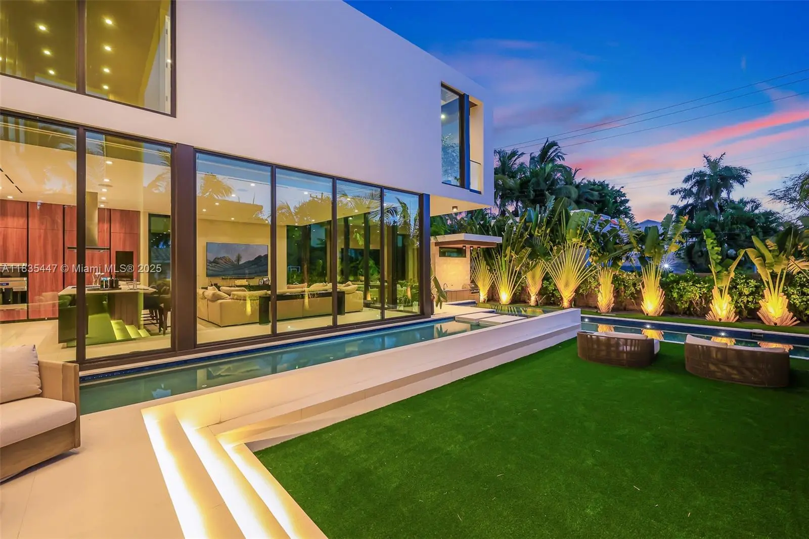 Fully furnished and truly turn-key — just bring your toothbrush and your sunglasses. This striking modern residence overlooks a beautiful golf course and offers 5 bedrooms, 6 bathrooms, and over 5,200 sq ft of elevated living designed for the Miami lifestyle. Soaring ceilings, sleek European flooring, skylights, and walls of floor-to-ceiling glass flood the home with natural light and seamless indoor-outdoor flow. The chef’s kitchen features Italian Boffi cabinetry, Sub-Zero and Wolf appliances, and designer fixtures—perfect for entertaining or laid-back luxury. A sculptural wood staircase leads to the large primary suite with private terrace and panoramic views. A junior suite overlooks the pool, while the rooftop terrace delivers sunrise mornings and golden-hour sunsets. A newly added wine cellar and spa-like baths complete the interiors. Outside, the backyard is pure resort mode with a heated pool and spa, cabana bath, and full summer kitchen—made for weekends that turn into nights. Just minutes from Sunset Harbour’s dining, shopping, fitness studios, and Sunset Padel, this move-in-ready, fully furnished home lets you skip the setup and step straight into the lifestyle.