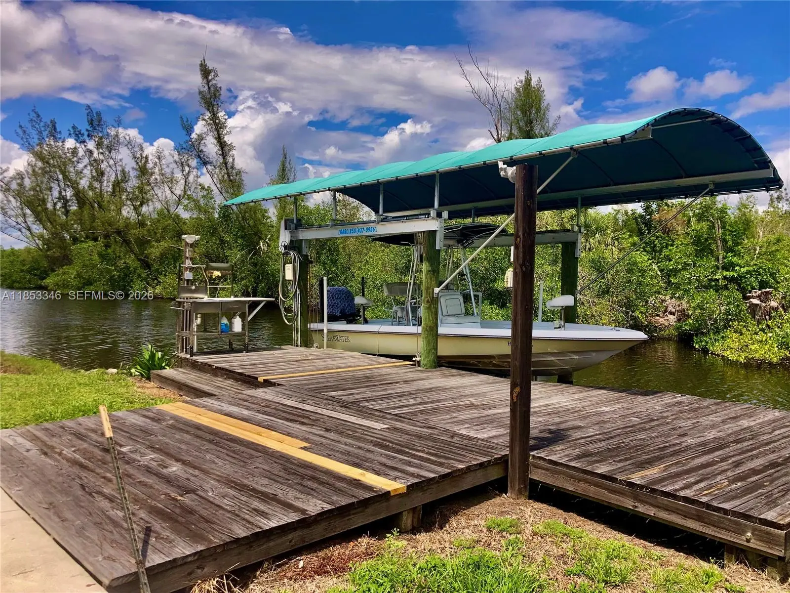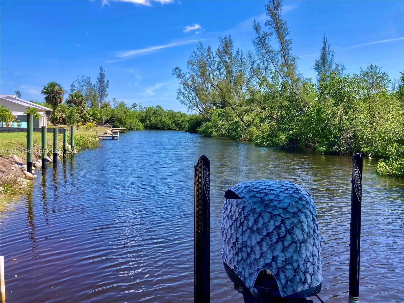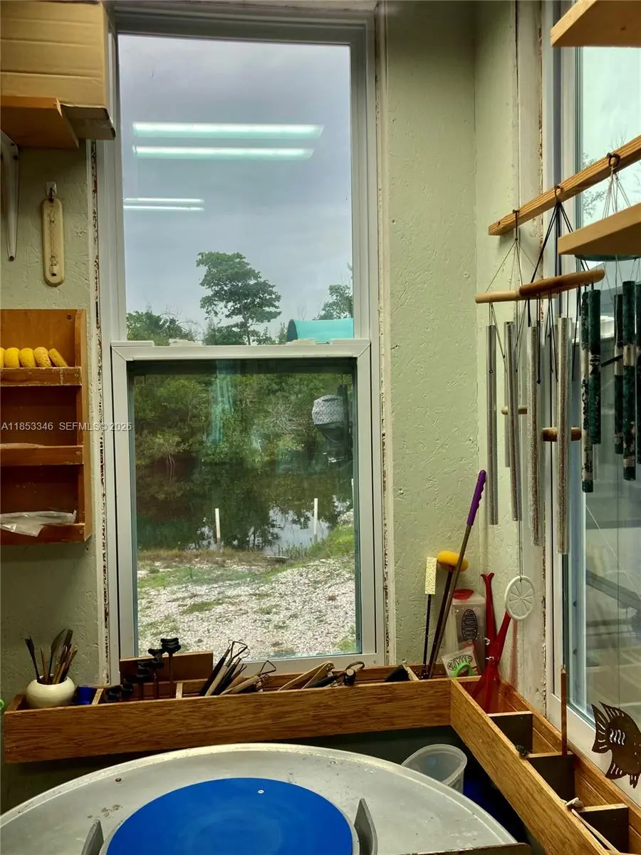 Price improvement! WATERFRONT & 550 yards navigable canal to river. Private ramp & with fresh water, shore power, 10k boat lift & canopy, docks, lights. Southern-style charm. CBS, stucco all around impact glass! NO HOA. Private Lazy-L pool est. depth of 3-7', lanai 38x40 (approx), distributed power and water, 6x6 outdoor shower. Plus 14x40 concrete slab, to the dock. 3 bedrooms, 2 baths, open concept, see front door through to boat lift.The Primary with ensuite bathroom, open concept. 2 bedrooms, & second bathroom. Kitchen is wide galley of bamboo cabinetry, French door fridge with ice and filtered water, induction convection range with pot filler. Deep quartz sink and epoxy tops. 10x20 art studio, currently a glass fusion and ceramicist shop. Studio has distributed power, a/c and hot and cold water.