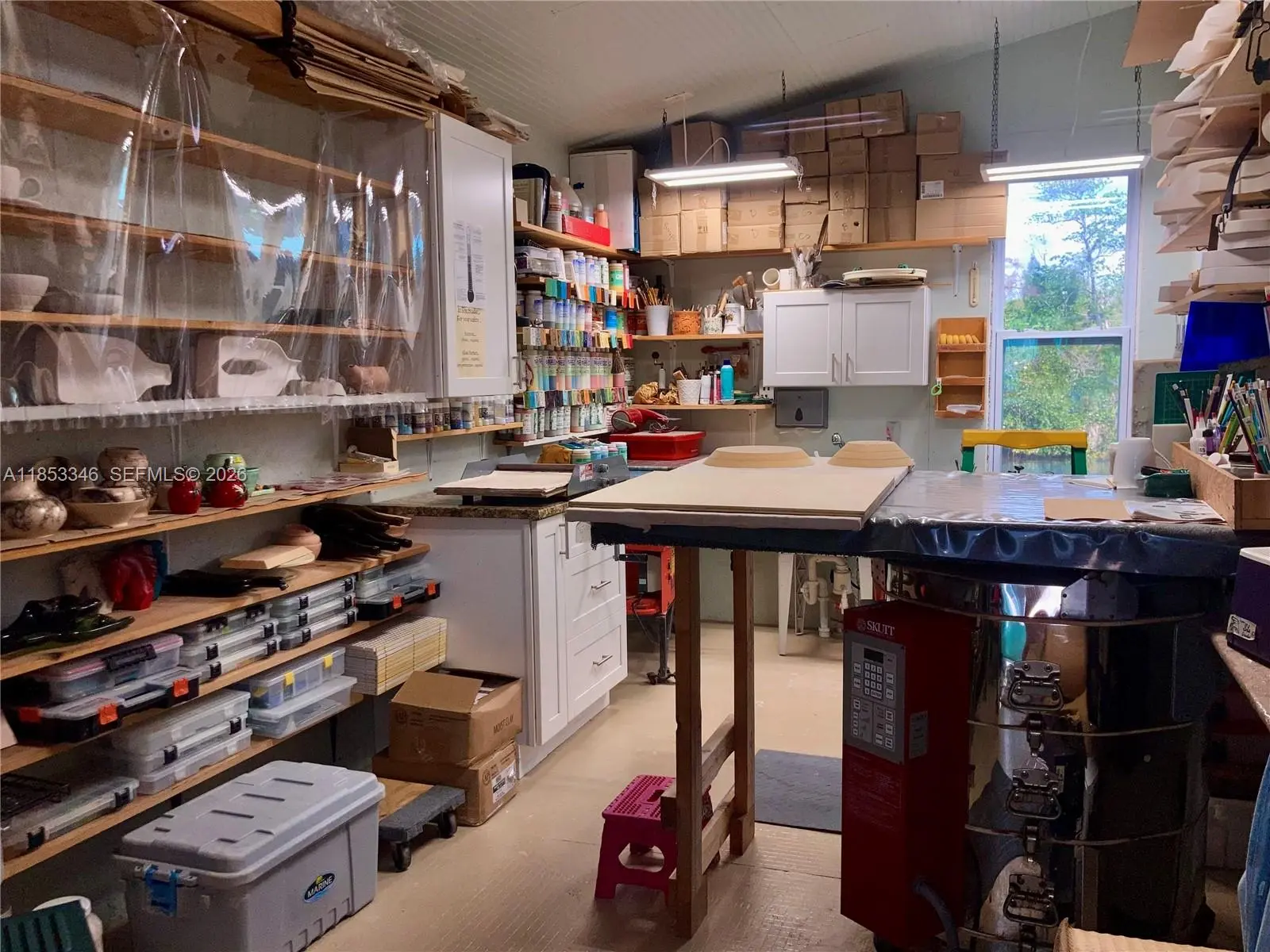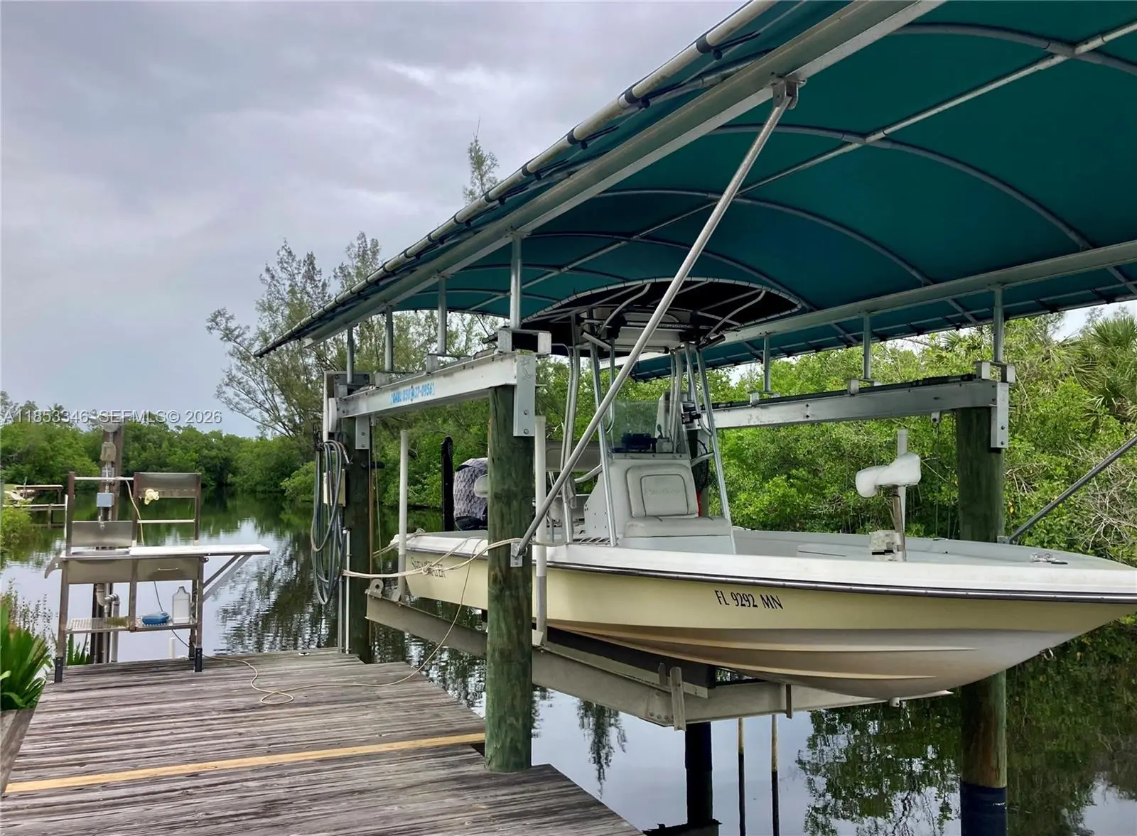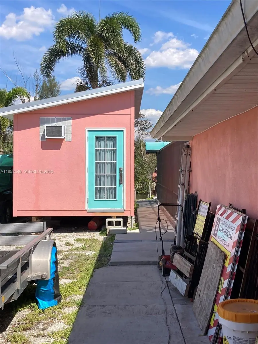 Price improvement! WATERFRONT & 550 yards navigable canal to river. Private ramp & with fresh water, shore power, 10k boat lift & canopy, docks, lights. Southern-style charm. CBS, stucco all around impact glass! NO HOA. Private Lazy-L pool est. depth of 3-7', lanai 38x40 (approx), distributed power and water, 6x6 outdoor shower. Plus 14x40 concrete slab, to the dock. 3 bedrooms, 2 baths, open concept, see front door through to boat lift.The Primary with ensuite bathroom, open concept. 2 bedrooms, & second bathroom. Kitchen is wide galley of bamboo cabinetry, French door fridge with ice and filtered water, induction convection range with pot filler. Deep quartz sink and epoxy tops. 10x20 art studio, currently a glass fusion and ceramicist shop. Studio has distributed power, a/c and hot and cold water.