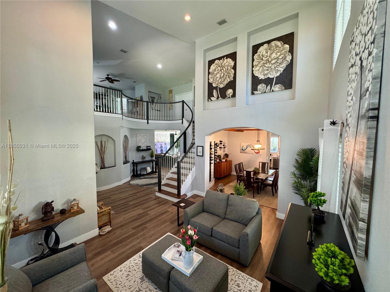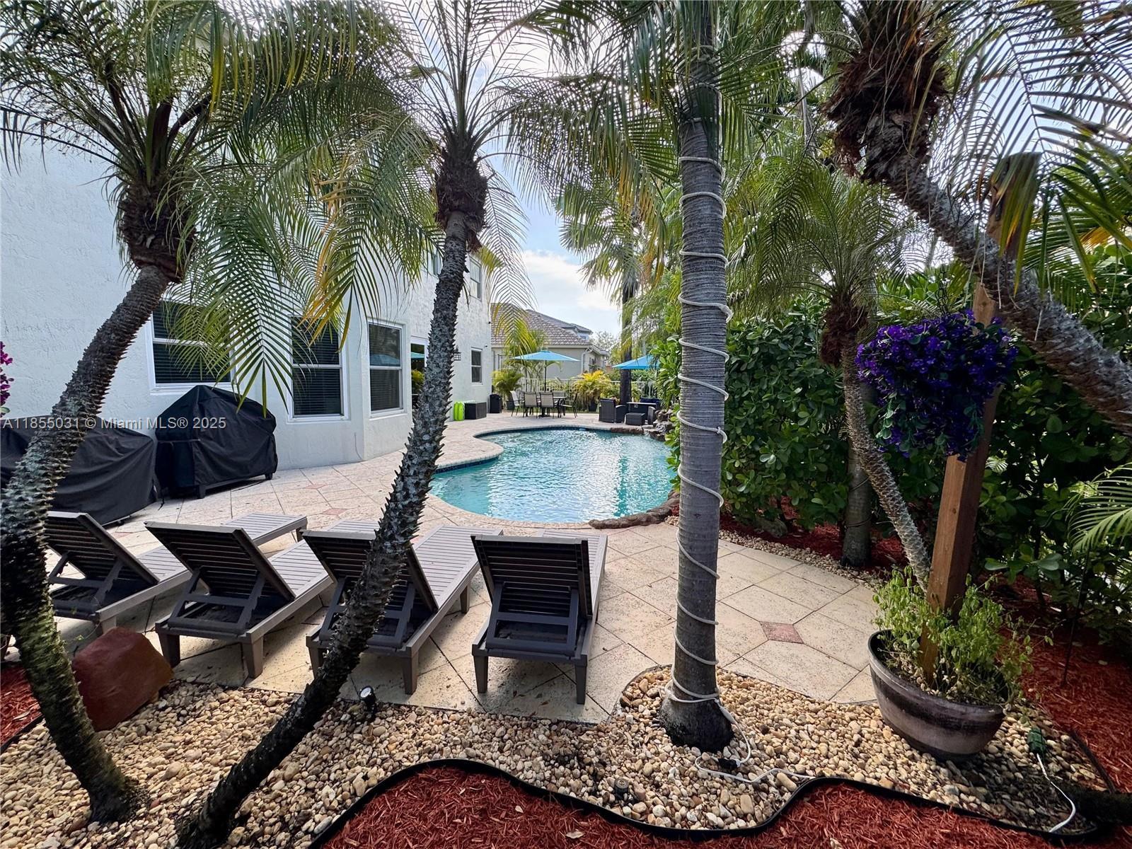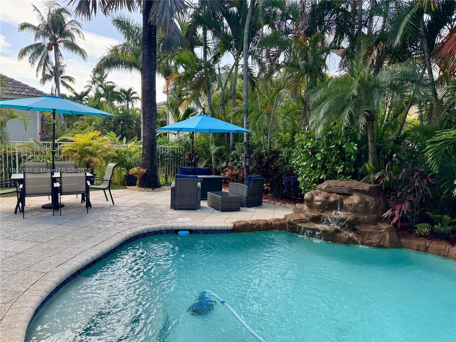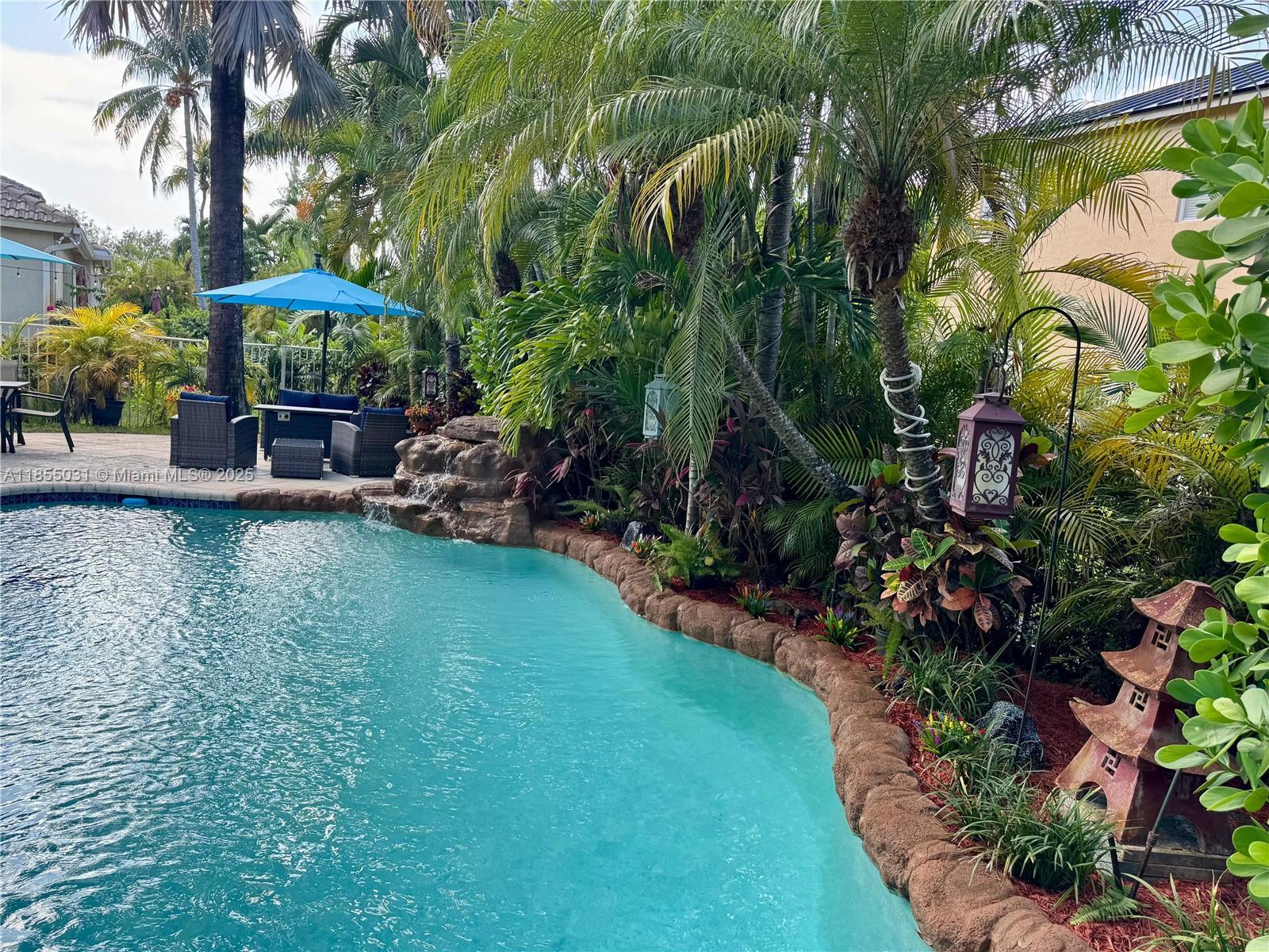 Welcome to your dream home! This beautifully remodeled 5-bedrooms 3 bathroom home, featuring an incredible pool and waterfall, is nestled in a private, beautifully landscaped tropical oasis on a spacious corner lot, in a quiet, well maintained neighborhood with low HOA. Completely remodeled bathrooms, an elegantly designed kitchen, a spacious family room and a stately two-story living room with a water softener filtration system, air purifier, and automatic A/C drain cleaning system are included. Energy-efficient high impact windows and doors. A 3-car garage with race deck flooring and air conditioning are featured. A community pool, fitness center, clubhouse, tennis courts, pickleball courts and a playground are also available. Don't miss this opportunity.