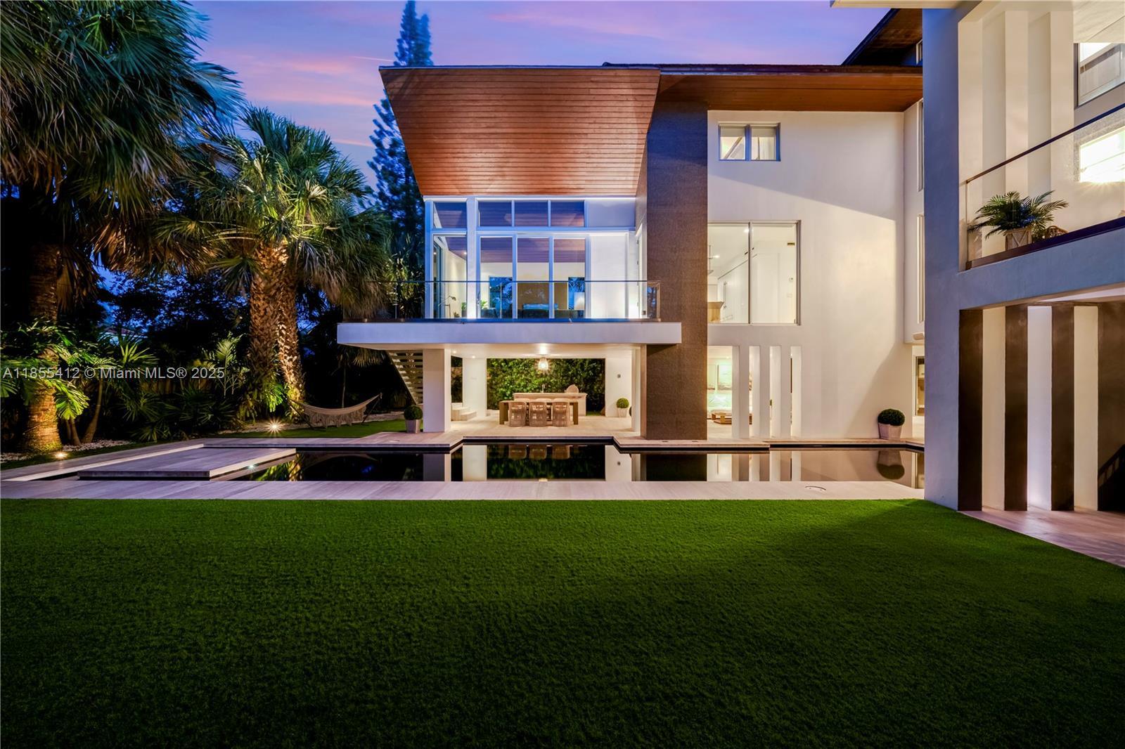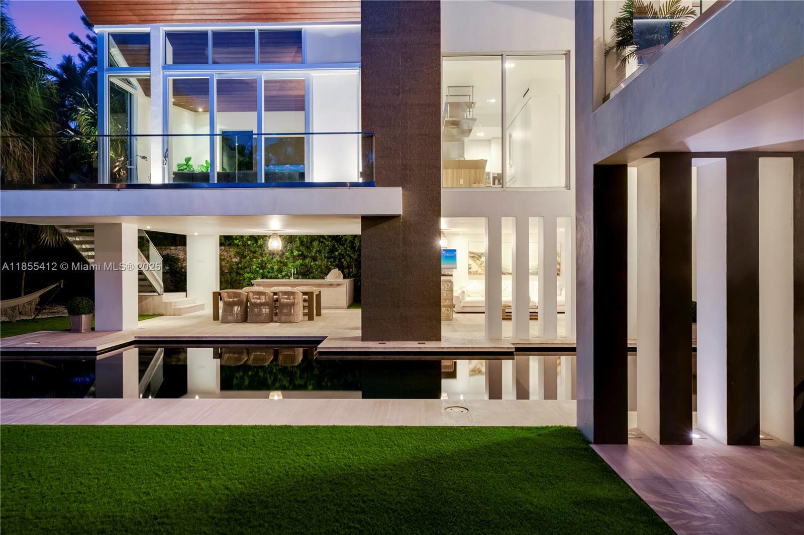 Key Biscayne – Architectural Masterpiece On a secluded 9,633 sq.ft. lot near Harbor Drive, this 6,800 sq.ft. residence by Village Architects (Deborah de León) blends modern elegance with tropical serenity. A dramatic double wood door opens to a lap pool reminiscent of Amanpuri, framed by 2,000 sq.ft. of covered entertainment areas. Inside, a glass-walled foyer, soaring ceilings, and a sculptural staircase set the tone. Formal dining, reception, and a chef’s kitchen flow seamlessly for refined living. The master suite offers vaulted ceilings, walk-in closets, a spa bath, and an adjacent office, complemented by three additional en-suite bedrooms. Rare offering of design,privacy & resort-style living in the heart of Key Biscayne.Please view unbranded matterport t, floor plans & video.