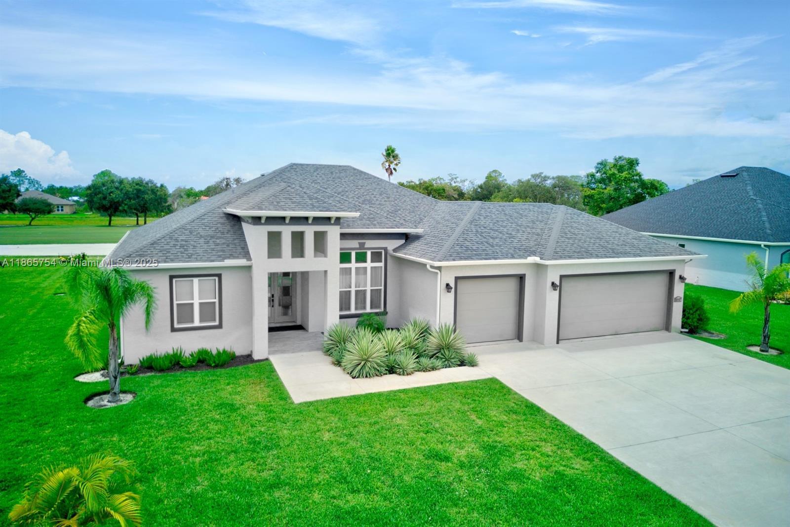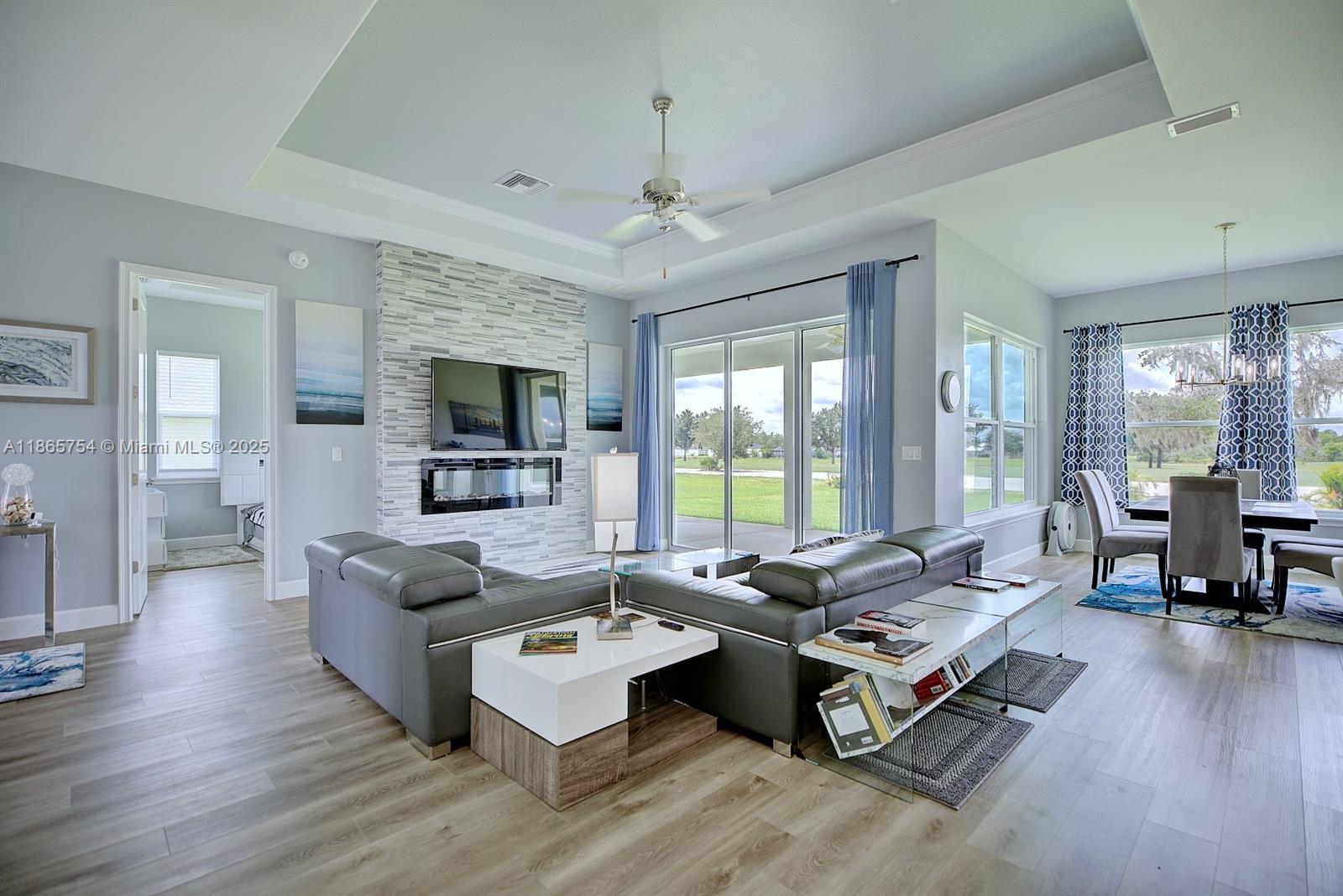 This stunning, almost-new Nevada II by Hornick is ready for immediate enjoyment. Located on Deer Run Golf Course in Sun ’N Lakes of Sebring, it features an oversized split plan with 10–14’ ceilings: 3 bedrooms, 3 full baths, plus an office that can serve as a fourth bedroom. Open living areas offer golf views and sunsets. The living room centers on a stone wall with an electric fireplace and space for a large wall-mounted TV. The dining area and kitchen with breakfast bar overlook a 24’x12’ covered lanai and the course. Gourmet kitchen includes Level III granite countertops, upgraded cabinetry, and GE stainless steel appliances. A 33’x24’ three-plus car garage, utility room, water softener, R-30 insulation, Rheem A/C, and brushed-nickel fixtures complete the package.