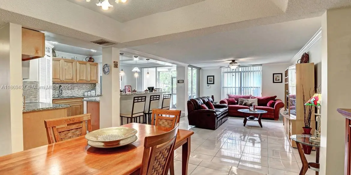 Step into this beautifully upgraded corner unit featuring enhanced ceramic tile flooring throughout the living areas and both bedrooms. The sunken living room flows seamlessly into an open-concept layout, accented by detailed crown molding and professionally painted walls for an elegant touch. The updated kitchen boasts gorgeous granite countertops, a neutral tiled backsplash, and a full suite of appliances. Both bedrooms feature spacious walk-in closets and an additional oversized pantry closet with washer/dryer offers exceptional storage. Enjoy a perfectly maintained AC and water heater Located in a secure gated community, residents enjoy premium amenities including indoor and outdoor pools, spa, five tennis courts, gym, saunas, putting range, racquet courts, and a BBQ area.