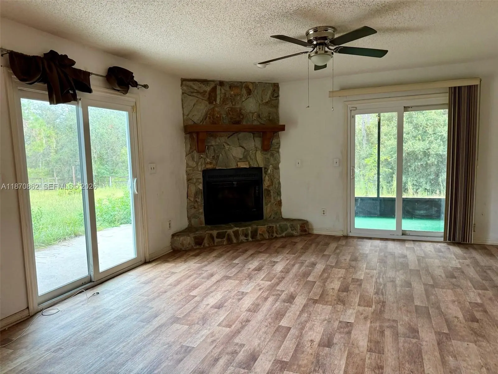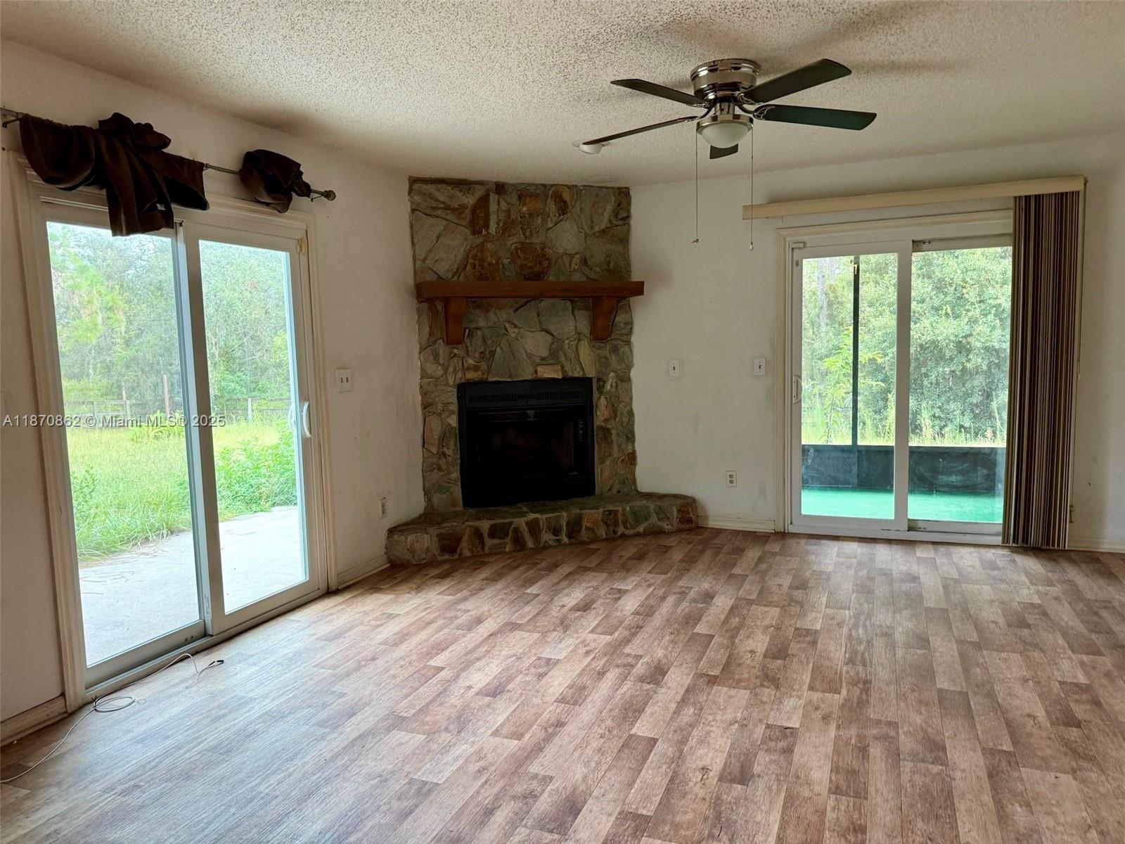 Single-family home with lots of potential! It is situated on a 4.38 acre corner lot in Dunnellon, FL in Marion county zoned residential and agriculture. It features paved roads and detached 2-car garage, hurricane impact windows, alarm system, fireplace, screened patio, cooking island in kitchen, 1 bath with accessible shower and 1 bath with tub/shower combination, laundry room, rec room, ceiling fans, vinyl laminate flooring and central air/heat. There are plenty of closets and a fenced area in the backyard. Can be purchased with adjoining 4.38 acre lot for a total lot size of 8.76 acres that could have a house, barn & pasture on it. Don’t miss this opportunity!