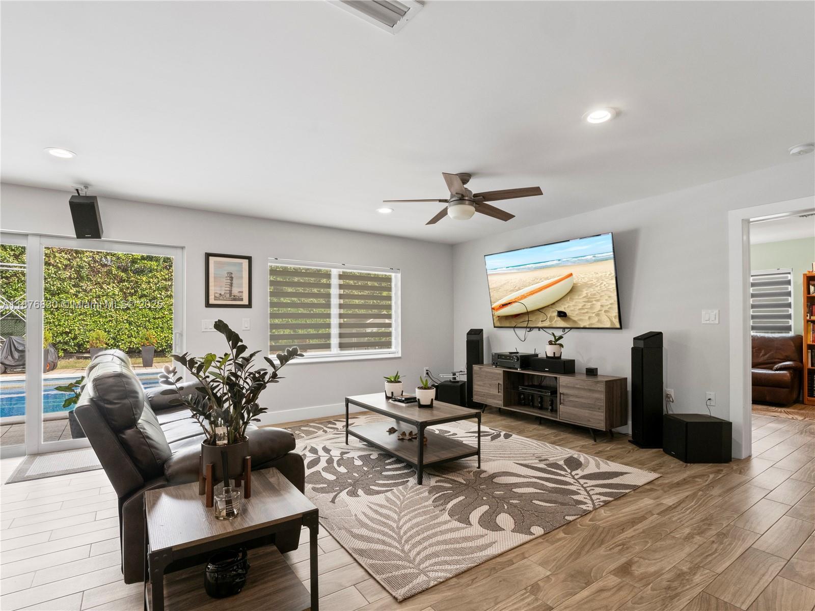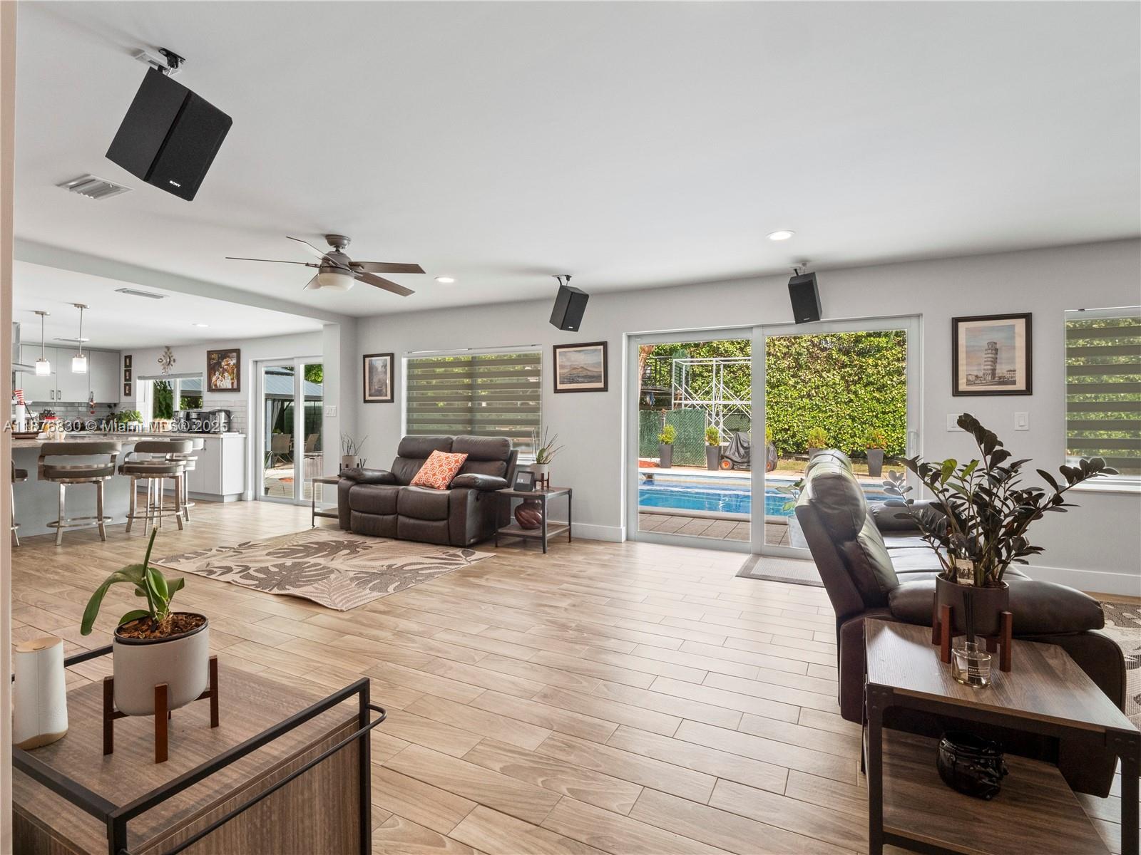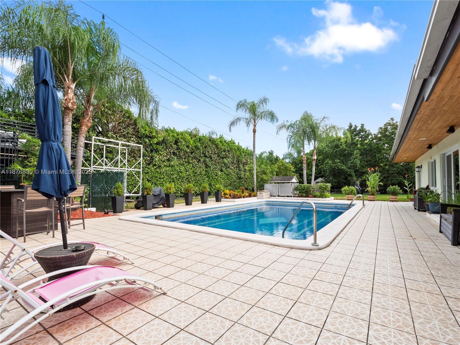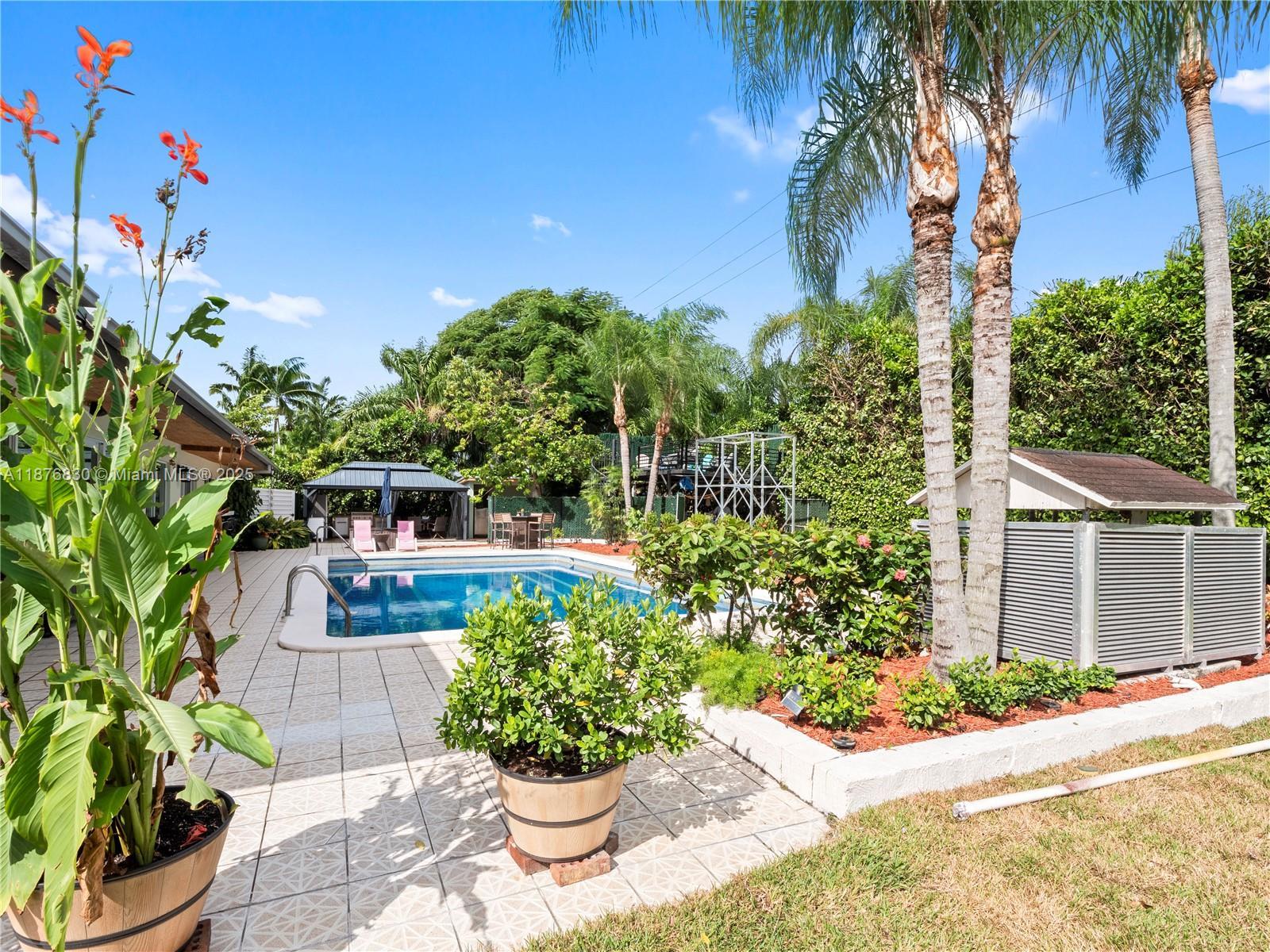 DAZZLING HOUSE!!! Located in a tranquil cul-de-sac, this home features 3 spacious bedrooms, each with its own bathroom. The master suite includes an extra room, perfect for a nursery or office. Completely renovated in 2020, the house boasts a new kitchen, bathrooms, flooring, ceilings, walls, updated plumbing, electrical, internet wiring, and A/C ducts. It is equipped with a gas stove, water heater, and clothes dryer. The open-concept layout seamlessly connects the living, dining, and kitchen areas, along with a pantry, laundry room, and office. Outdoors, enjoy a private oasis with a pool, gazebo, outdoor bathroom, gas grill kitchen, fruit trees, and ample parking. Move-in ready, this home is ideal for families and entertaining.