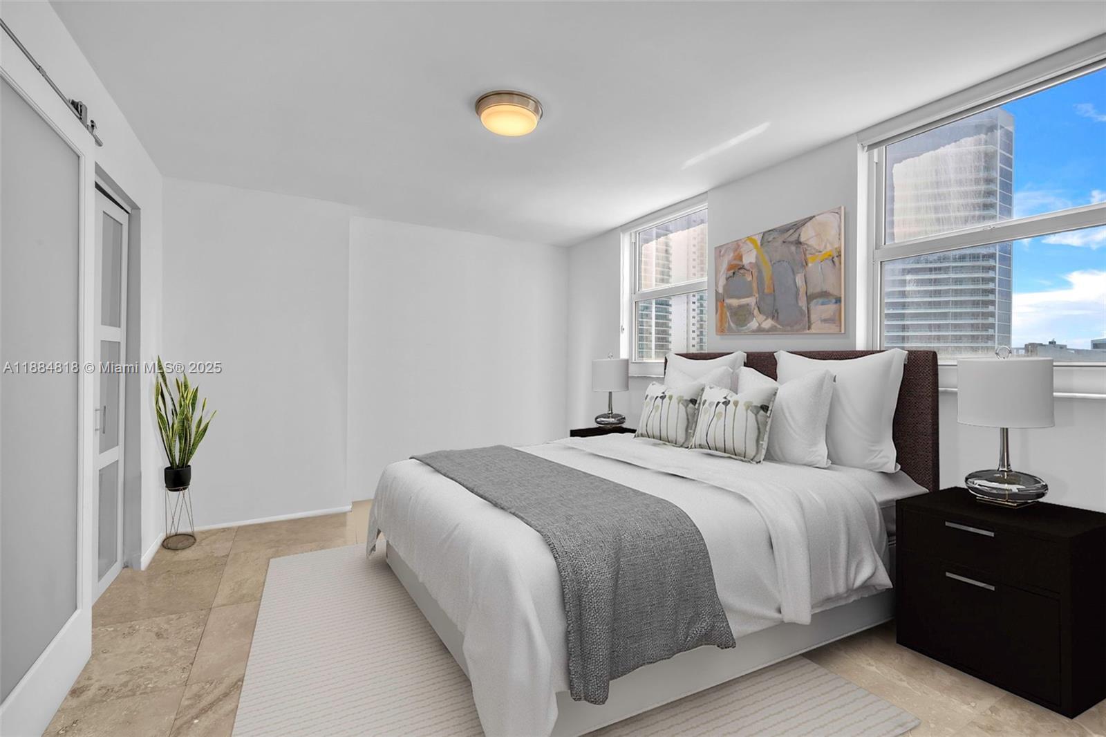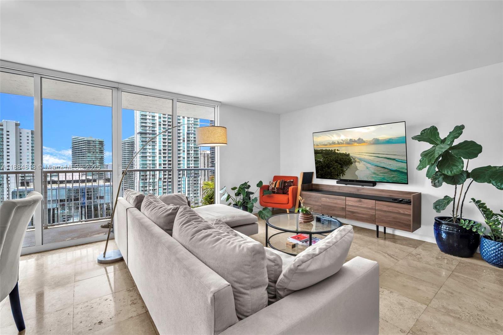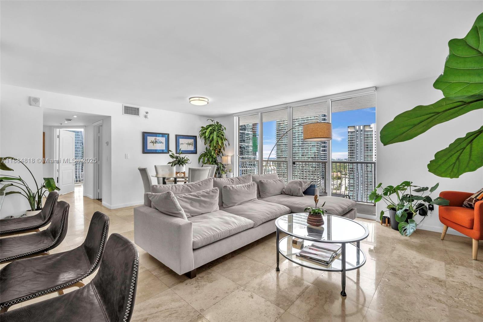 This 2 bedroom 2 bathroom plus den corner residence is filled with natural light and features a wraparound balcony with city skyline and partial bay views. The open floor plan includes travertine floors, a gourmet kitchen with stainless steel appliances, renovated bathrooms, walk-in closets, motorized shades, and an in-unit washer and dryer. One designated parking space is included. Residents enjoy resort-style amenities with pool, fitness center, game room, and 24-hour security. Prime Brickell location close to dining, shopping, nightlife, downtown Miami, the beach, and Miami International Airport. - NO SUBLEASING *NO SHORT TERM