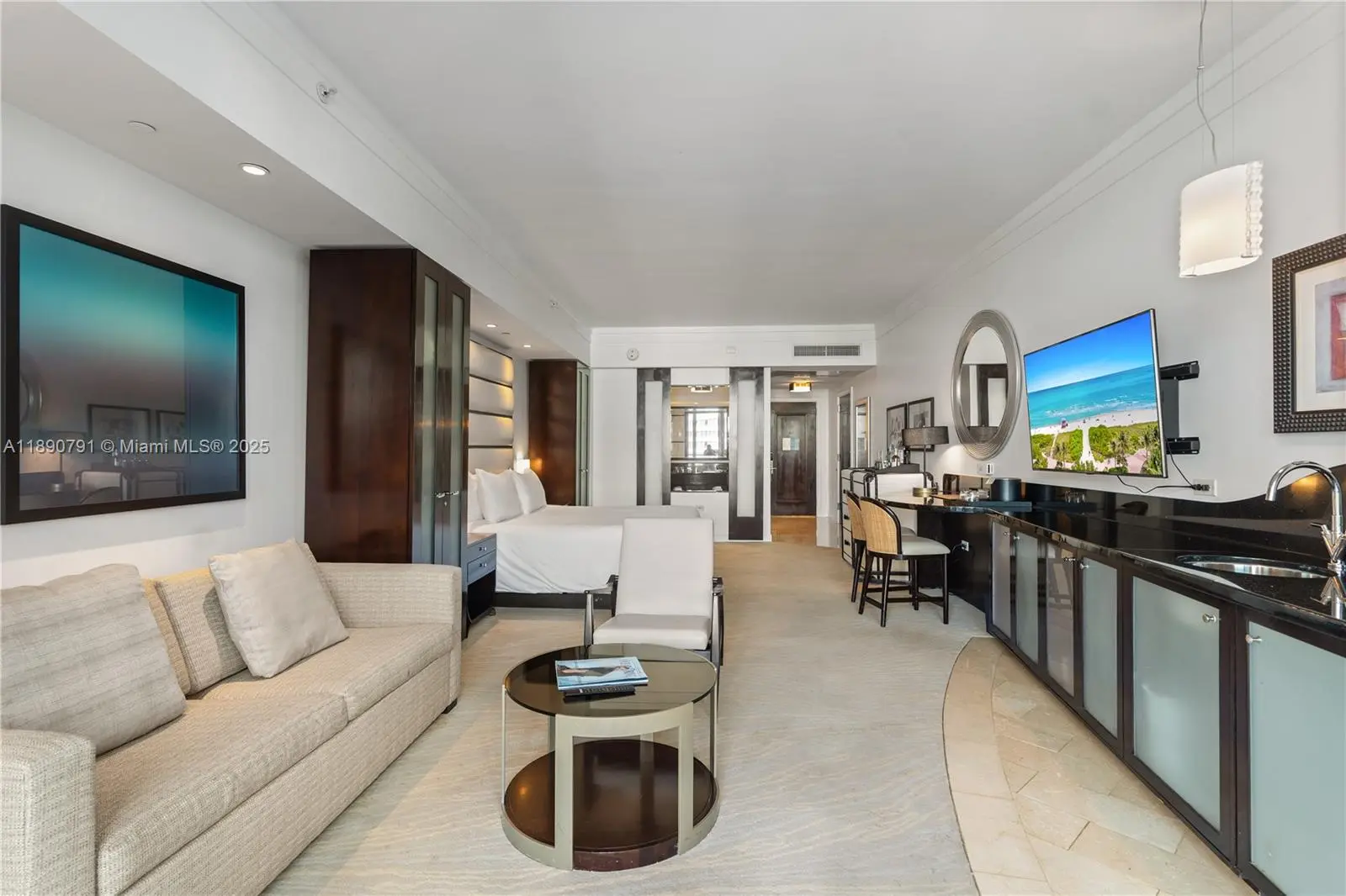 Beautiful Junior Suite at The Fontainebleau III. Enjoy full service, vacation-style living in a furnished turnkey unit with king bed, sleeper sofa & more. Option to enroll in hotel rental program & receive income while away! The Fontainebleau resort offers luxury amenities on 22 oceanfront acres including award-winning restaurants, bakery, shops, LIV night club, Lapis spa & state-of-the-art fitness center. Maintenance fees includes: AC, electricity, valet + daily free breakfast in the owner’s lounge. Please click the virtual tour link to view the video.