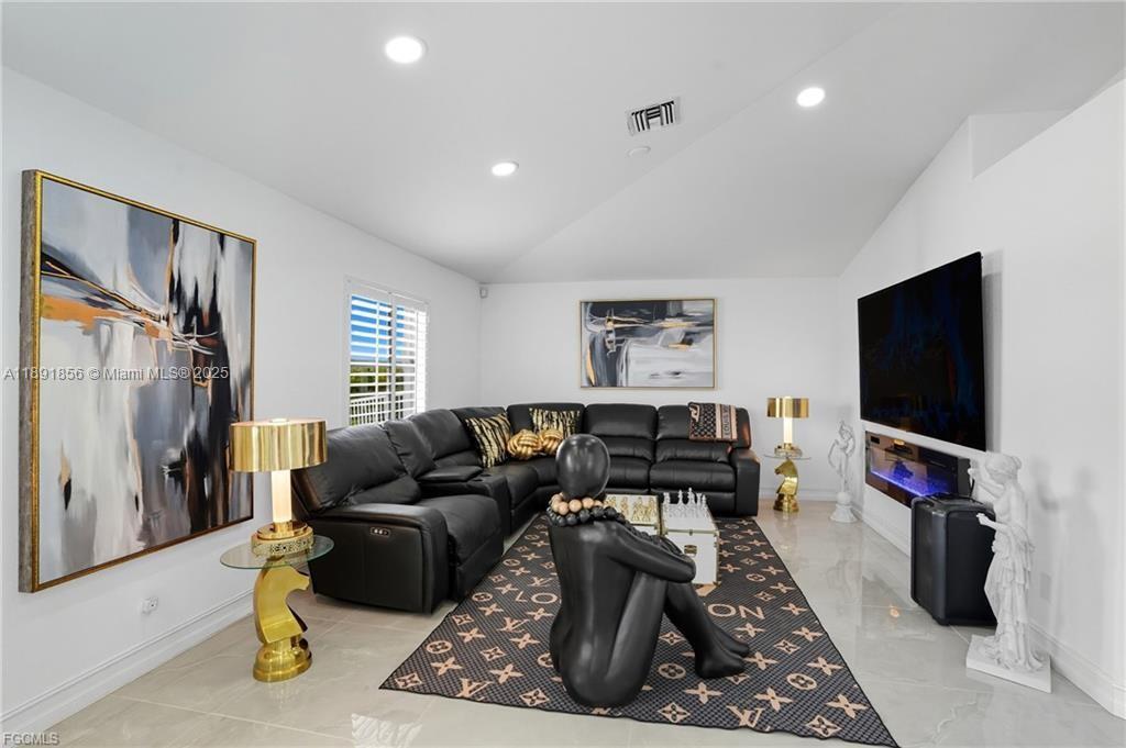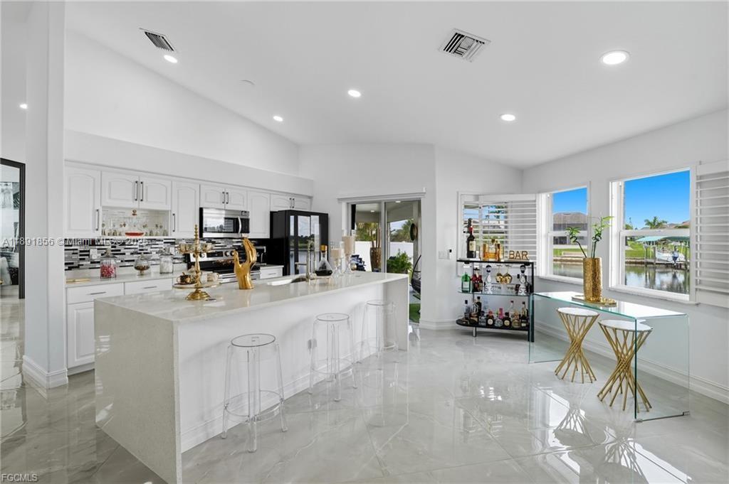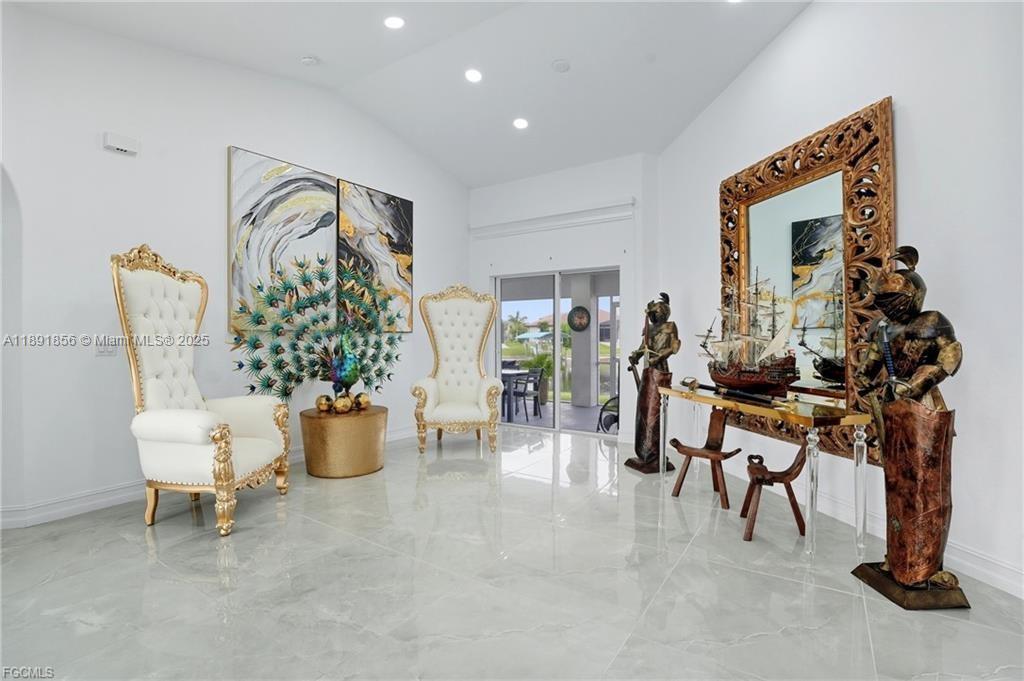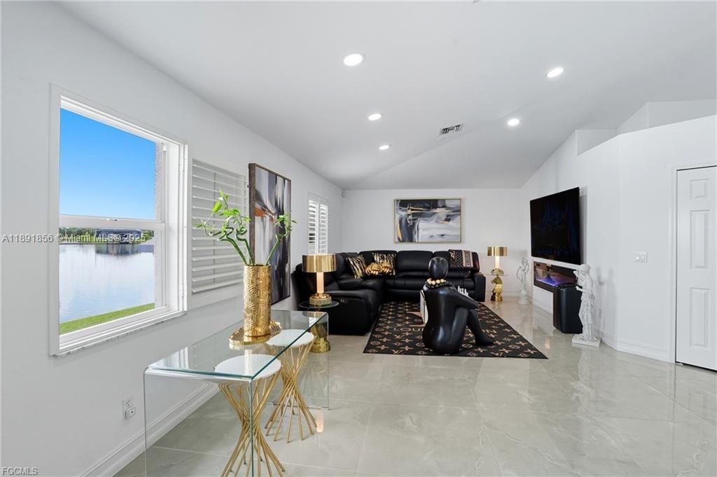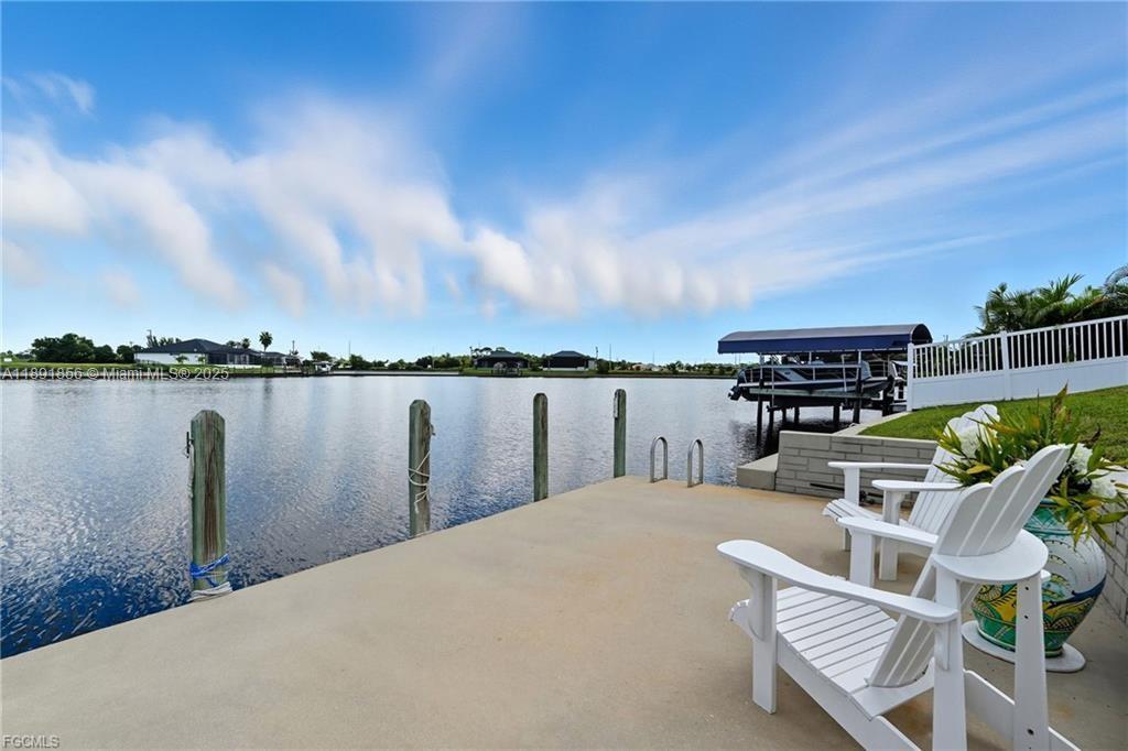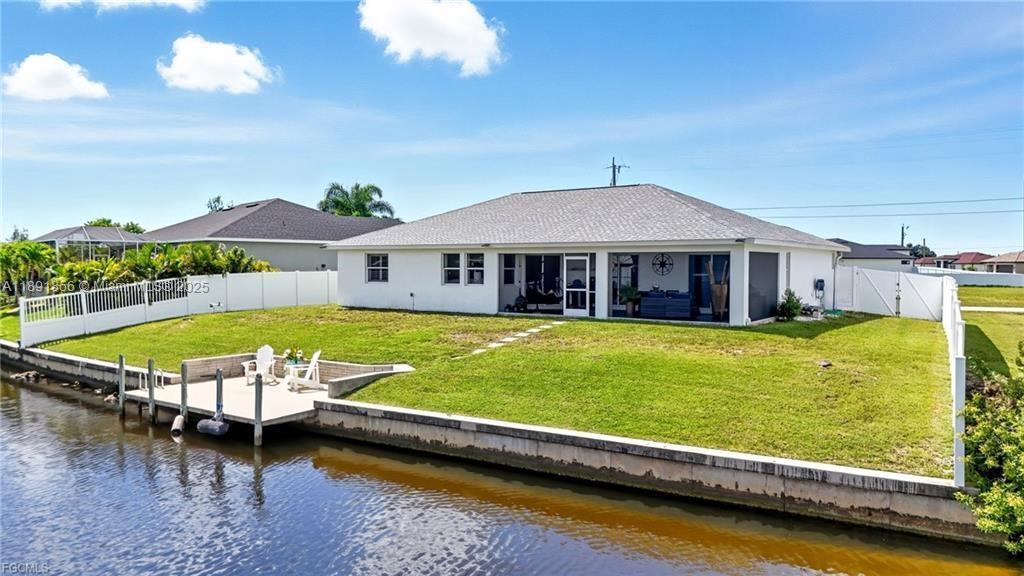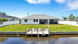 Welcome to your Cape Coral waterfront retreat! This beautifully 3bed/2 bath sits on a saltwater canal with direct Gulf access. Open-concept design, high ceilings, natural light, and elegant finishes, Stainless steel appliances, granite countertops, and a spacious island perfect for entertaining. The master suite features a walk-in closet and a spa-inspired bathroom. Outdoor living is a highlight to enjoy water sports. Enjoy the covered lanai. Ample backyard for adding a pool or customizing your waterfront oasis. Furnished and move-in ready, ideal for Airbnb or seasonal rentals. Extra room for exercise or studio in the garage. Located in the desirable NW Cape Coral. Minutes from beaches, dining, and shopping. NEW ROOF 2023, 2021 fence. Music production and media equipment do not convey.