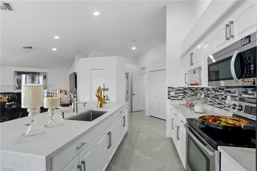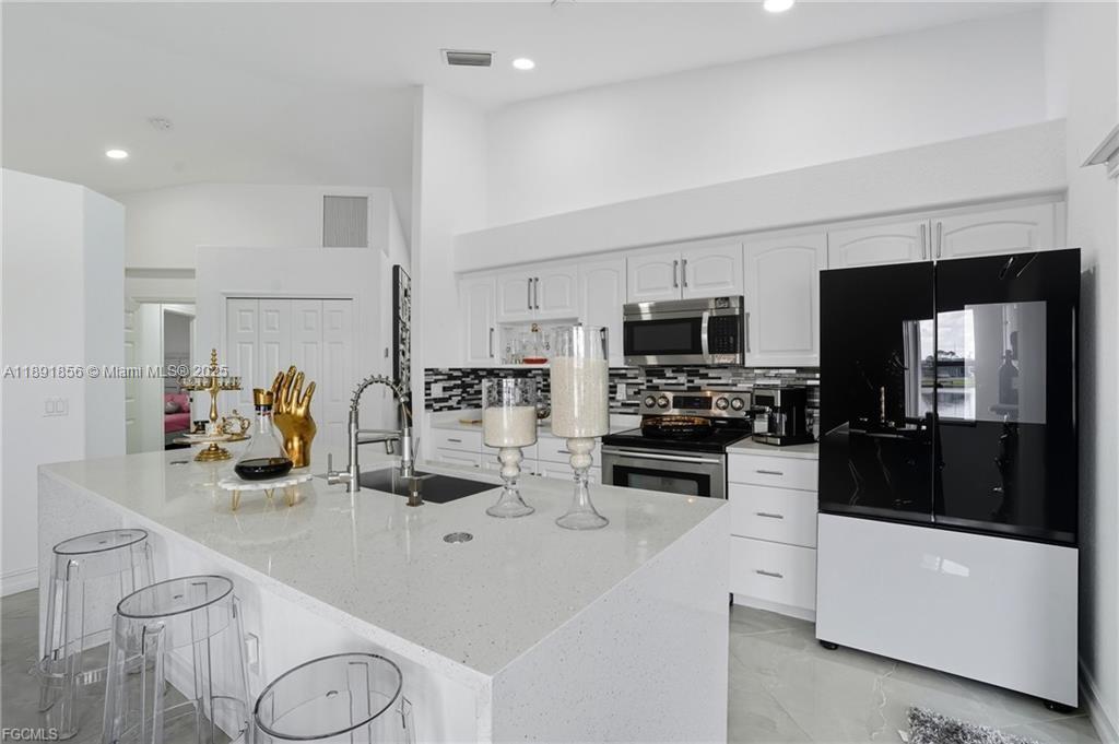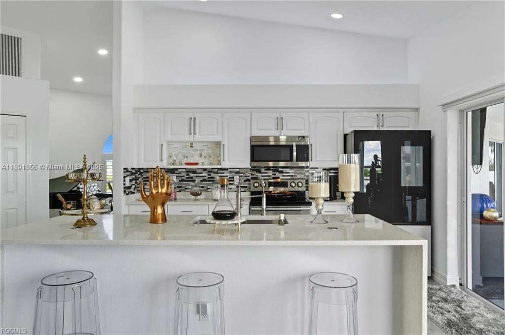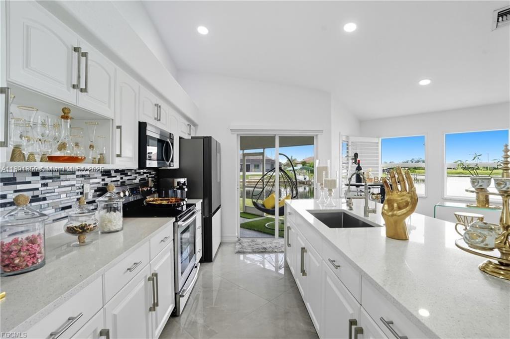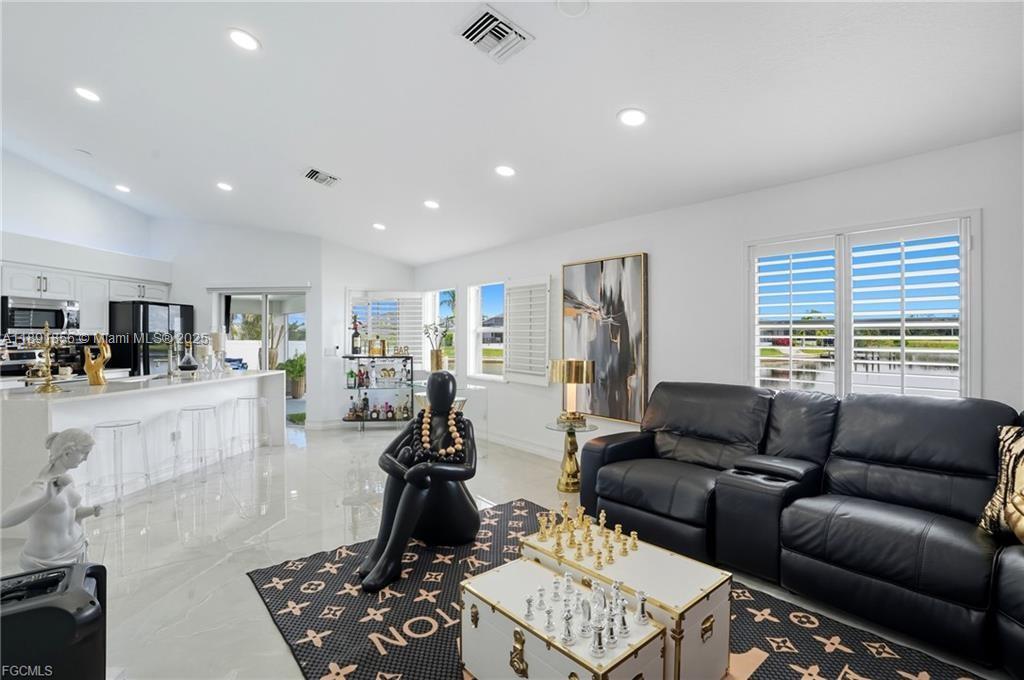 Welcome to your Cape Coral waterfront retreat! This beautifully 3bed/2 bath sits on a saltwater canal with direct Gulf access. Open-concept design, high ceilings, natural light, and elegant finishes, Stainless steel appliances, granite countertops, and a spacious island perfect for entertaining. The master suite features a walk-in closet and a spa-inspired bathroom. Outdoor living is a highlight to enjoy water sports. Enjoy the covered lanai. Ample backyard for adding a pool or customizing your waterfront oasis. Furnished and move-in ready, ideal for Airbnb or seasonal rentals. Extra room for exercise or studio in the garage. Located in the desirable NW Cape Coral. Minutes from beaches, dining, and shopping. NEW ROOF 2023, 2021 fence. Music production and media equipment do not convey.