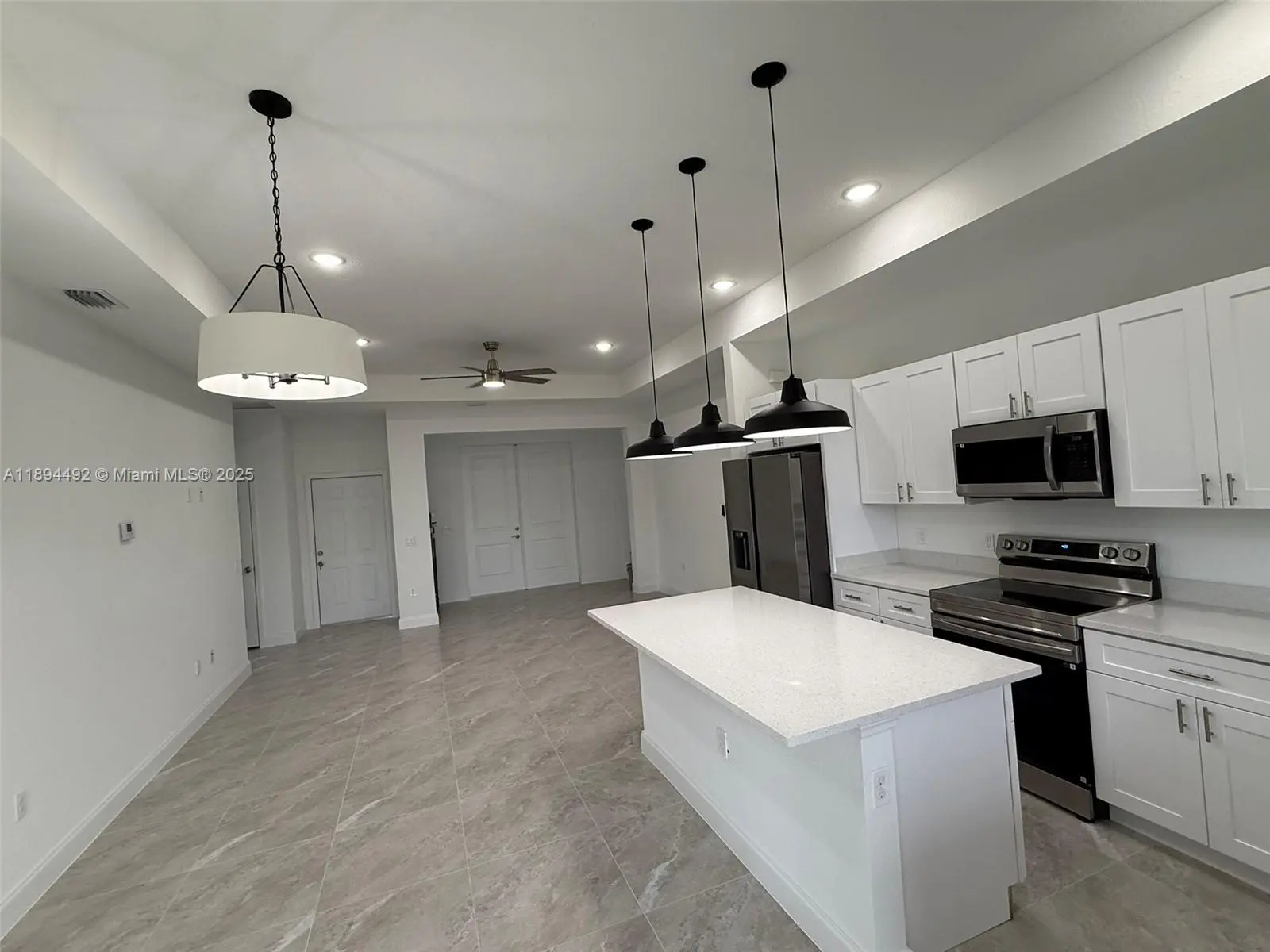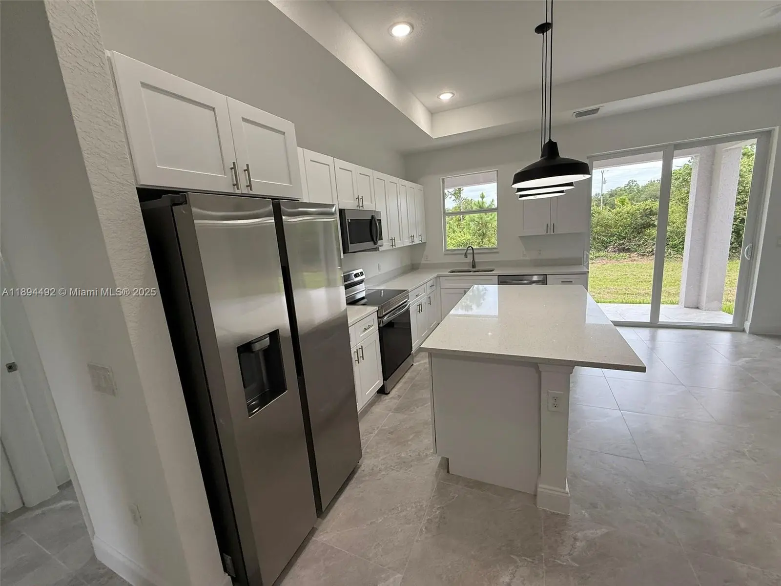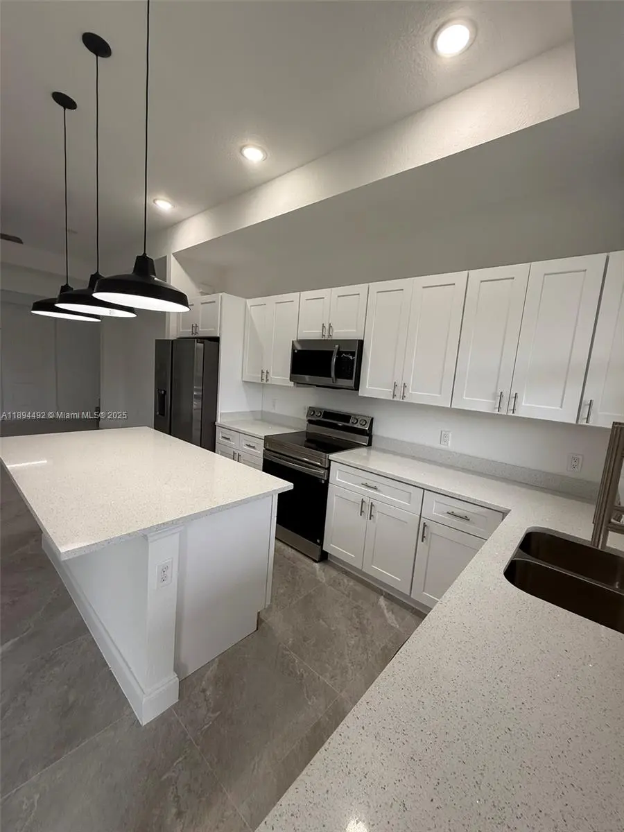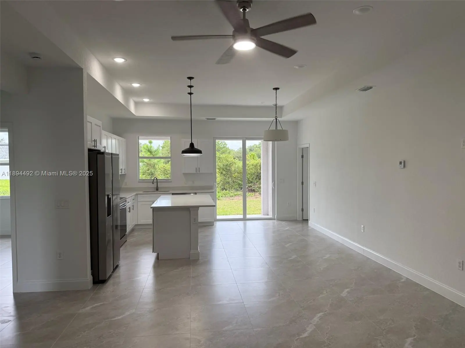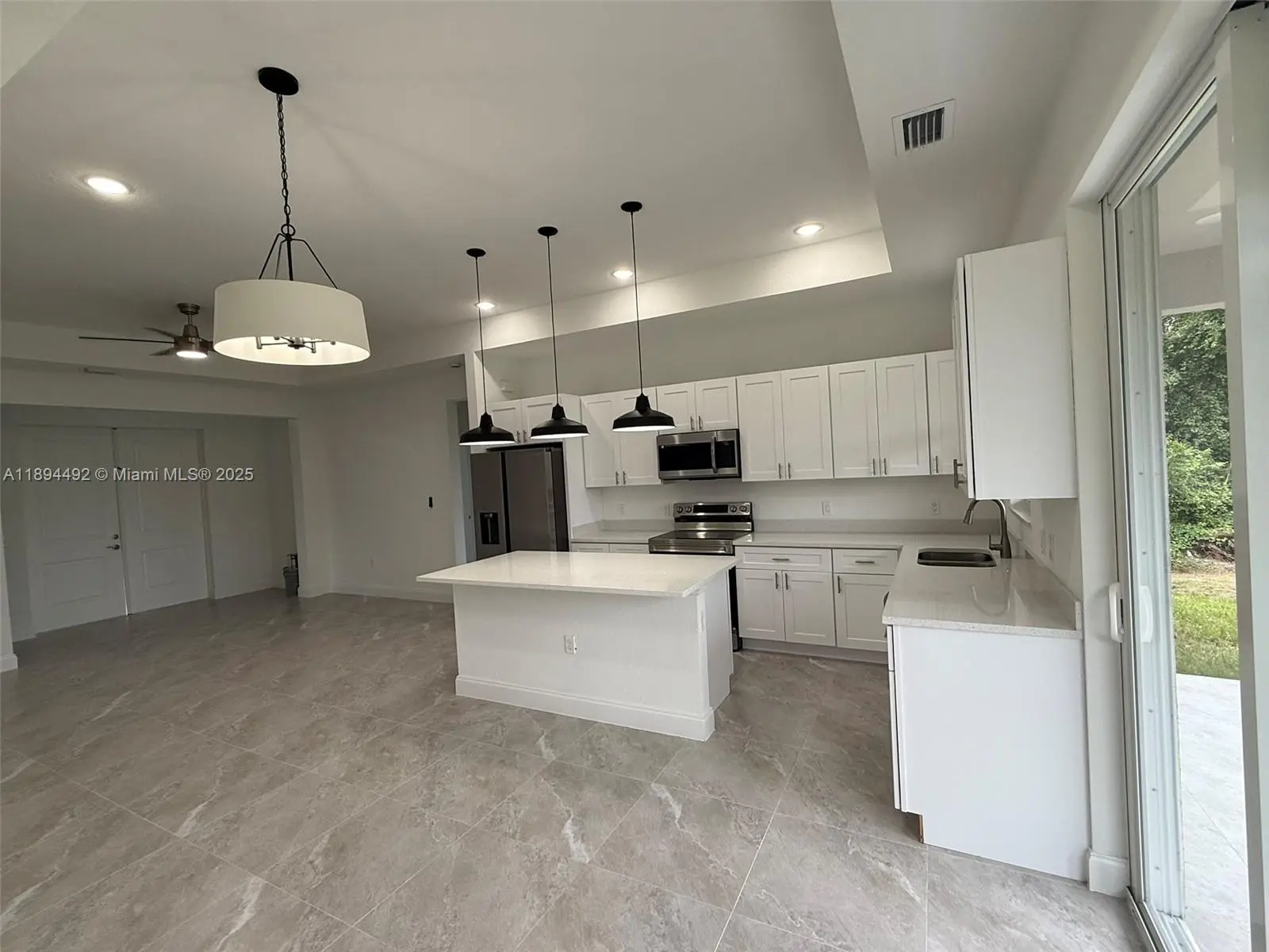 Stunning new construction – move-in ready 3-bedroom, 2-bath home with double garage and screened lanai in prime East Lehigh location. This bright, open-concept home features high ceilings with elegant step details, impact-resistant windows, and porcelain tile throughout. The kitchen offers quartz countertops, stainless steel appliances, and modern designer lighting. Each bedroom includes ceiling fans with lights. The master suite boasts dual walk-in closets and a spa-style bath with double sinks and a large walk-in shower. A spacious laundry room with utility sink adds convenience. Just 15 minutes to RSW Airport and FGCU, with easy access to Fort Myers, I-75, schools, shopping, and dining. Schedule your showing today!