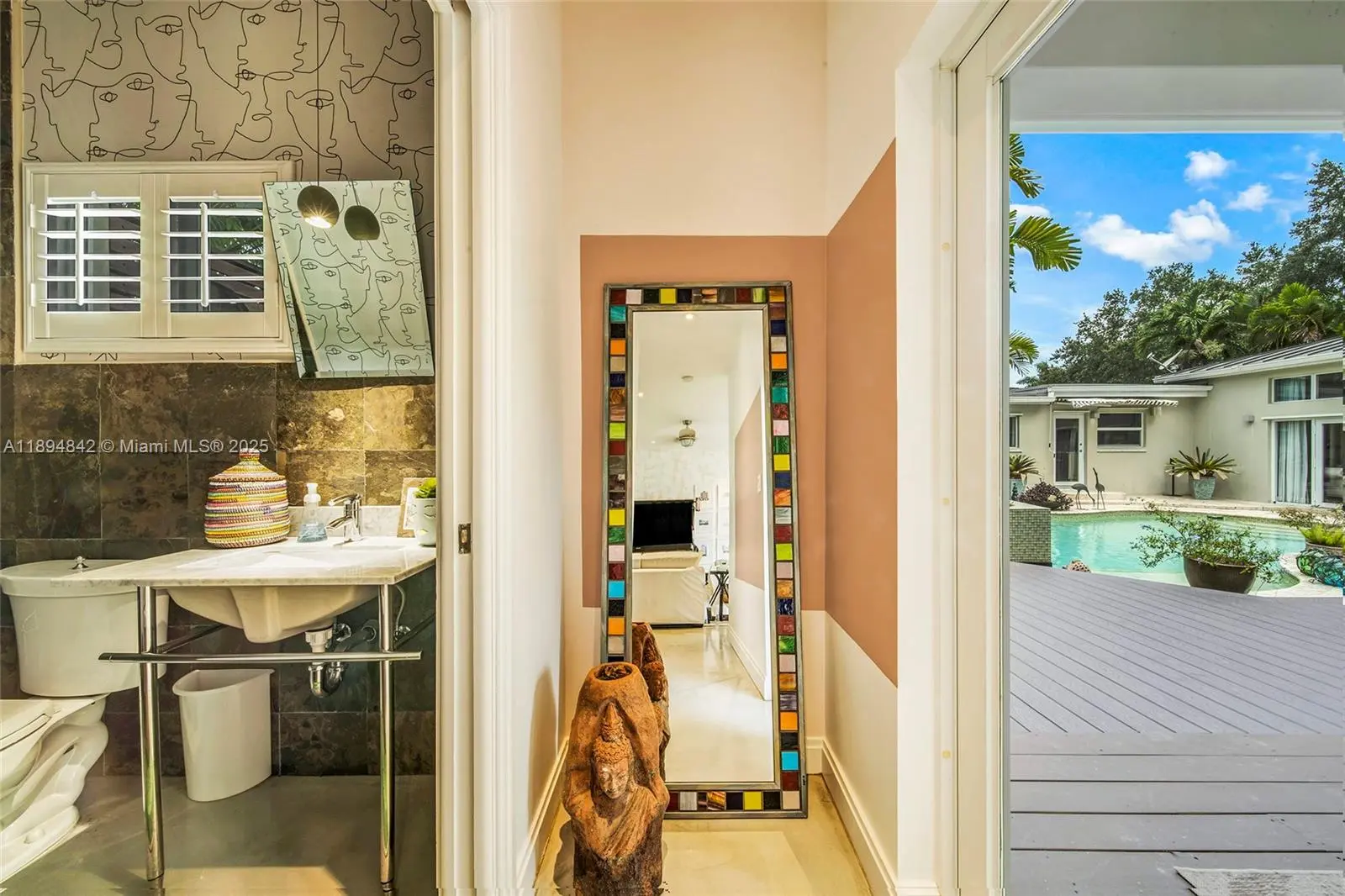 Discover a rare private tropical retreat on a builder’s acre in highly desirable Glenvar Heights, just minutes from Coral Gables, South Miami, and top-rated schools. This exceptional estate blends resort-style living with everyday comfort, offering the space, flexibility, and lifestyle amenities today’s buyers seek. Filled with natural light, the open layout features generous gathering areas ideal for entertaining and relaxed family living. The main residence offers 4 bedrooms plus potential 5th and 4.5 baths, including a serene primary suite wing with spa-inspired bath and garden views. A junior suite with private bath provides flexible options for guests, multigenerational living, or a home office. A separate pool house adds versatility for guest quarters, creative studio, or fitness/yoga space. Outdoors, enjoy a lagoon-style pool surrounded by mature tropical landscaping and fruit trees, multiple lounge areas, expansive lawns, and covered terraces that create seamless indoor-outdoor living. The grounds offer room for recreation or future enhancements such as a wellness garden or sport area. Additional highlights include an EV charger with ample gated parking, extensive storage and ancillary spaces, and an outdoor shower. More than a home, this property is a private sanctuary and entertainer’s dream designed for modern priorities of wellness, personalization, and sustainability