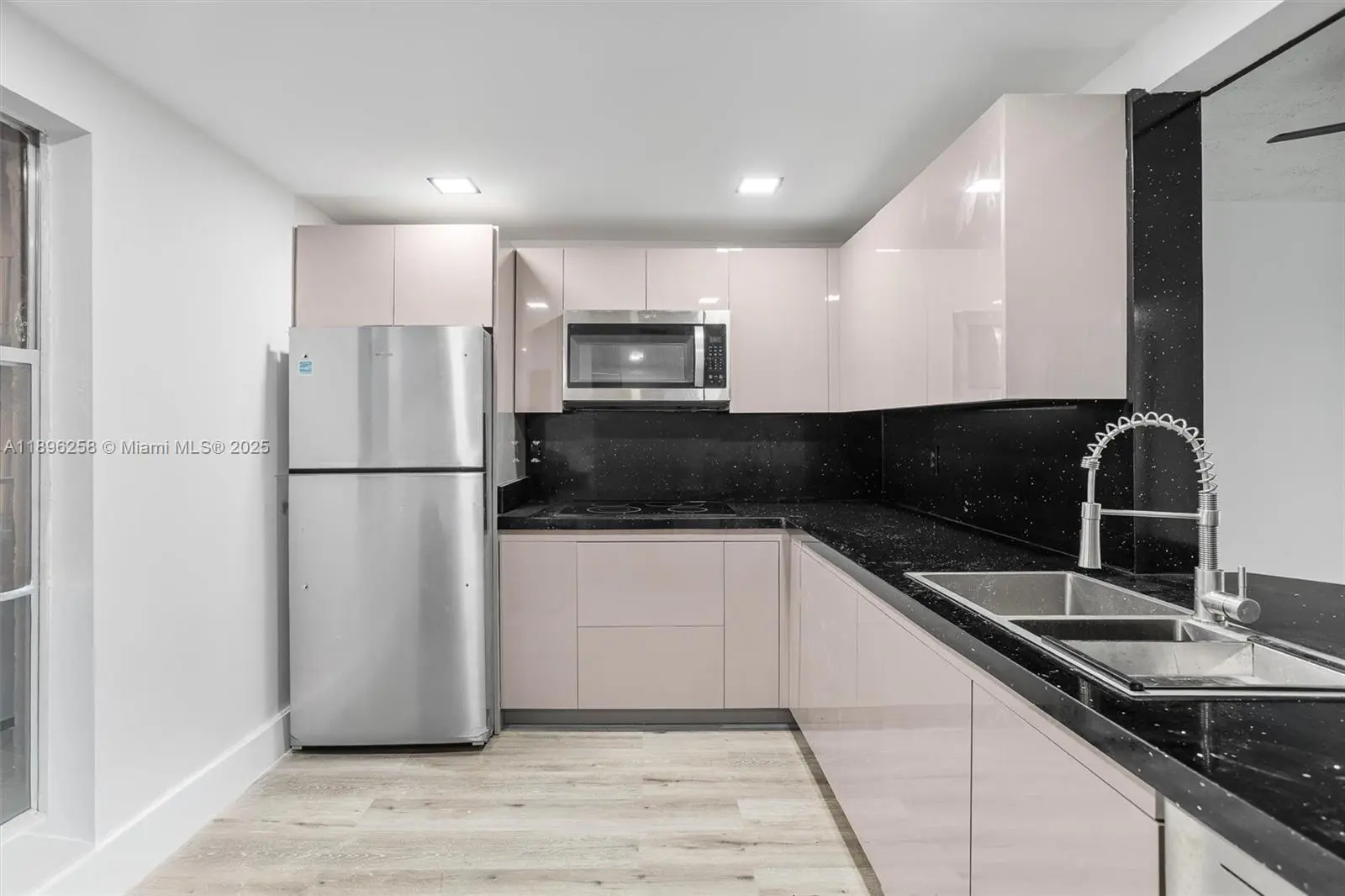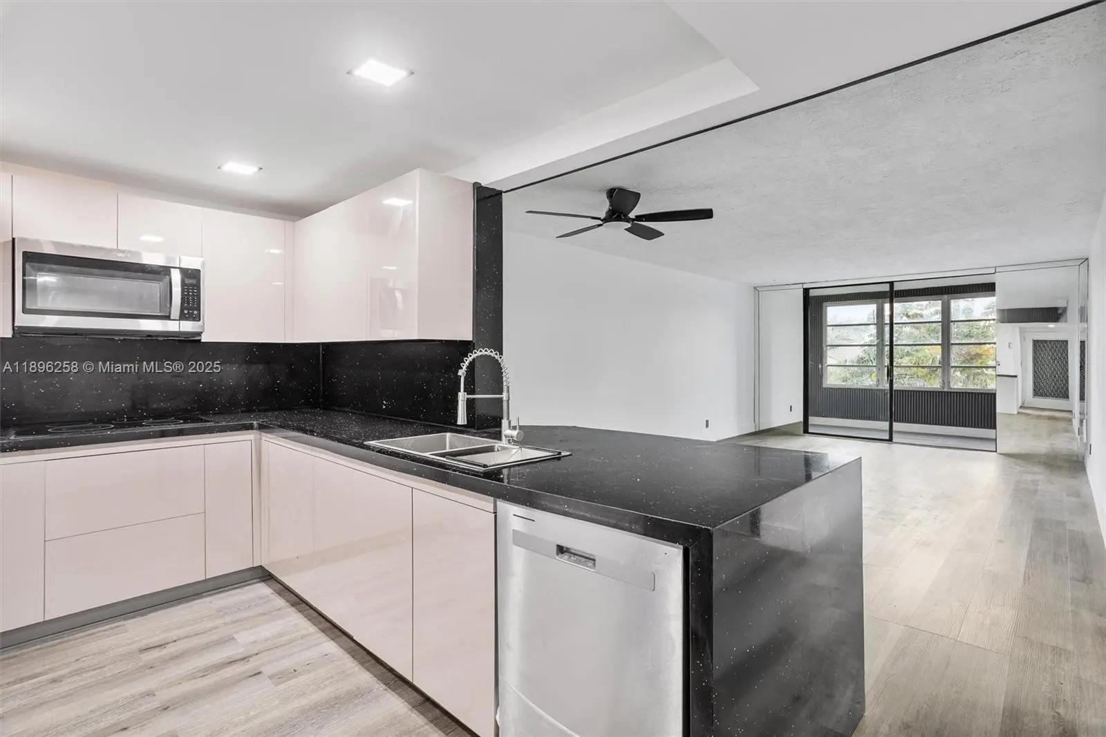 Stunningly remodeled 2-bed, 2-bath condo. This exquisite residence features luxury light gray vinyl flooring throughout, paired with sleek white counter and high-end stainless steel appliances. The kitchen dazzles with elegant black granite countertops, perfect for entertaining. A harmonious blend of modern sophistication and comfort, this unit offers an inviting atmosphere with abundant natural light. Ideally located with easy access to local amenities and major roads, this home is a true gem.