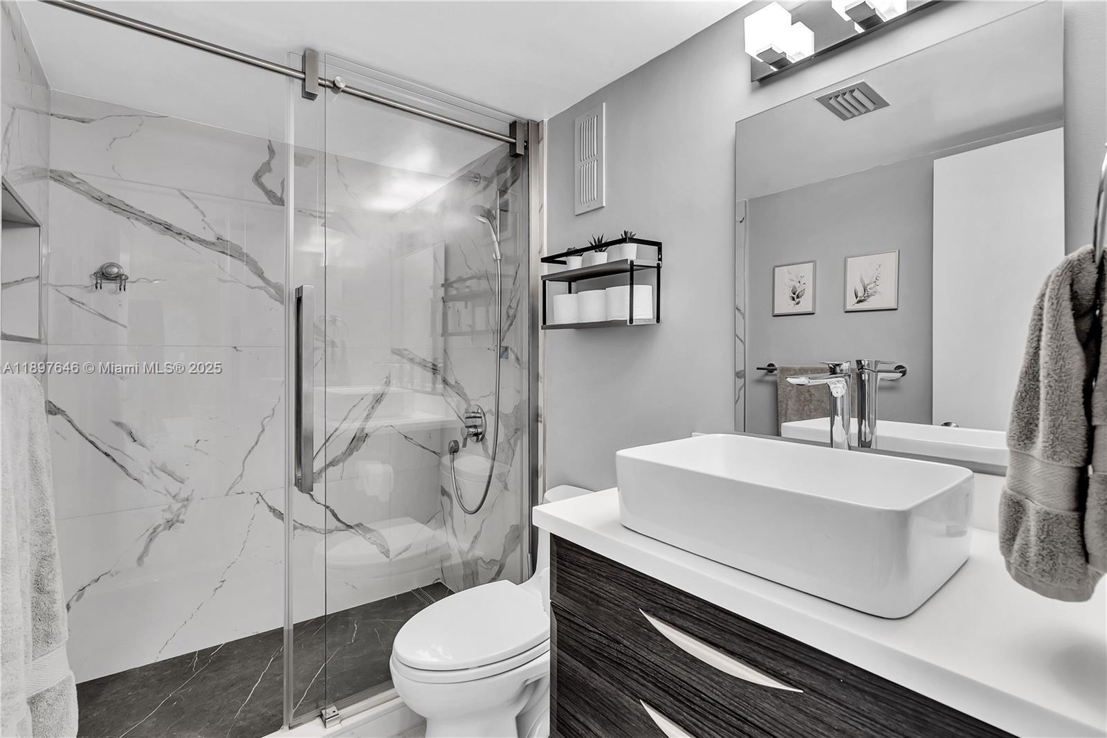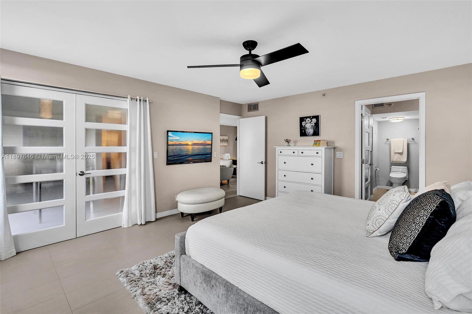 STEP INTO THIS EXQUISITE MODERN SPACE. TASTEFULLY RENOVATED 2 BEDROOM 2 FULL BATHS OVERLOOKING THE WATER. THIS SPACIOUS 2 BEDROOM OPEN FLOOR PLAN UNIT FEATURES QUARTZ COUNTERTOPS WITH TOP OF THE LINE KITCHEN AID STAINLESS STEEL APPLIANCES, BRAND NEW SAMSUNG WASHER DRYER, GLASS TILE BACKSPLASH, MODERN WOOD CABINETRY, BUILT IN WINE COOL, RHEEM AC 2018 UNIT WITH NEST TEMP CONTROL, RHEEM HOT WATER HEATER, IMPACT WINDOWS, PATIO STORM SHUTTERS. MASTER BEDROOM COMES WITH KING SIZE BED SET WITH ENSUITE BATH THAT FEATURES STATE OF THE ART TOILET WITH BIDET, HEATED SEAT AND DRYER. GUEST BEDROOM COMES WITH QUEEN SIZE BED SET. THIS SPECTACULAR UNIT COMES FULLY FURNISHED. NOTHING HAS BEEN SPARED. TURNKEY INVESTMENT, MOVE IN READY ! NO OTHER UNIT LIKE IT. REQUEST A SHOWING TODAY !