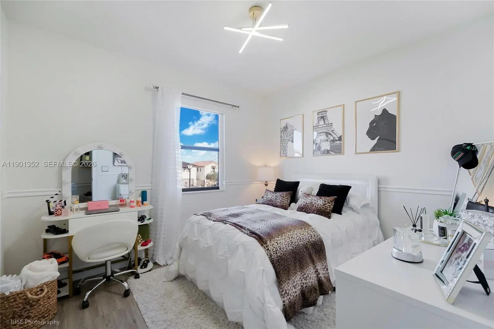 Elegant two-story home in gated Madison Pointe at Central Park. This 4-bed, 3-bath home offers 2,548 sq. ft of living area (3,025 total, 2,580 adjusted) with one bed and bath on the first floor. Situated on a premium 4,746 sq. ft corner lot across from the park, it features polished tile floors, open living areas, and a modern kitchen with granite countertops and stainless steel appliances. The fenced backyard includes a covered outdoor space for lounging and dining. Madison Pointe is a private community of only 64 homes with a manned gate and access to the nearby Grand Resort clubhouse. Walking distance to the clubhouse and surrounded by Doral’s premier nature preserve.