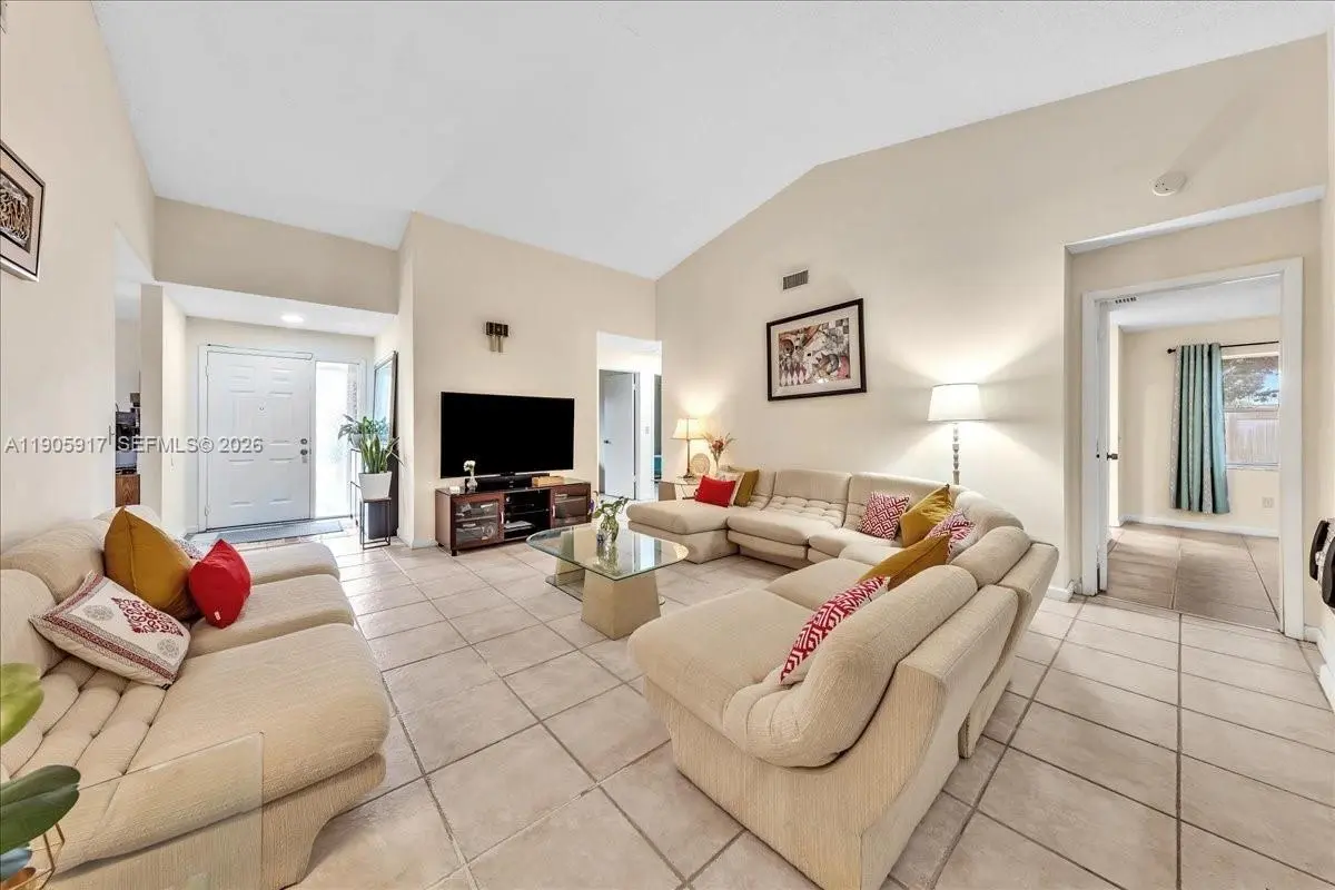 Welcome to this beautiful 2,092 sq. ft. NON HOA home in Davie, perfectly situated on the largest lot in the neighborhood. The moment you step inside, you’ll notice the soaring vaulted ceilings in the extended formal living room and dining area, creating a bright and open atmosphere. The kitchen flows seamlessly into a cozy breakfast nook and spacious family room—perfect for everyday living and entertaining. The split-bedroom layout gives everyone a little extra privacy, and the spacious primary bedroom includes a large walk-in closet. Step outside to a screened-in porch overlooking a stocked swimmable lake, where you can relax and unwind. The backyard is a true tropical retreat with mango, sapodilla, and coconut trees. Ideally located in a quiet neighborhood. This home features a one-car garage. Easy to show !!