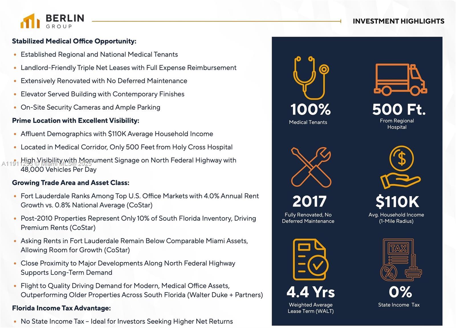 Berlin Group is proud to present this 19,492 SF, four-story medical office building (“MOB”) positioned along North Federal Highway in Fort Lauderdale/ Oakland Park, less than 500 feet from Holy Cross Hospital. The property is anchored by a diverse roster of healthcare providers, including 4Ever Young Anti-Aging Solutions (66+ locations), Encore MRI (11 Florida centers), Aesthetix Dermatology, and Coastal Infusion, a subsidiary of Sagebrush Health, which operates 12 specialty practices across Nevada, Connecticut, and South Carolina along with four additional clinics in South Florida. Built in 1998 and fully renovated in 2017, the property offers contemporary finishes with no deferred maintenance, 68 on-site parking spaces, and additional parking secured on an adjacent parcel.
