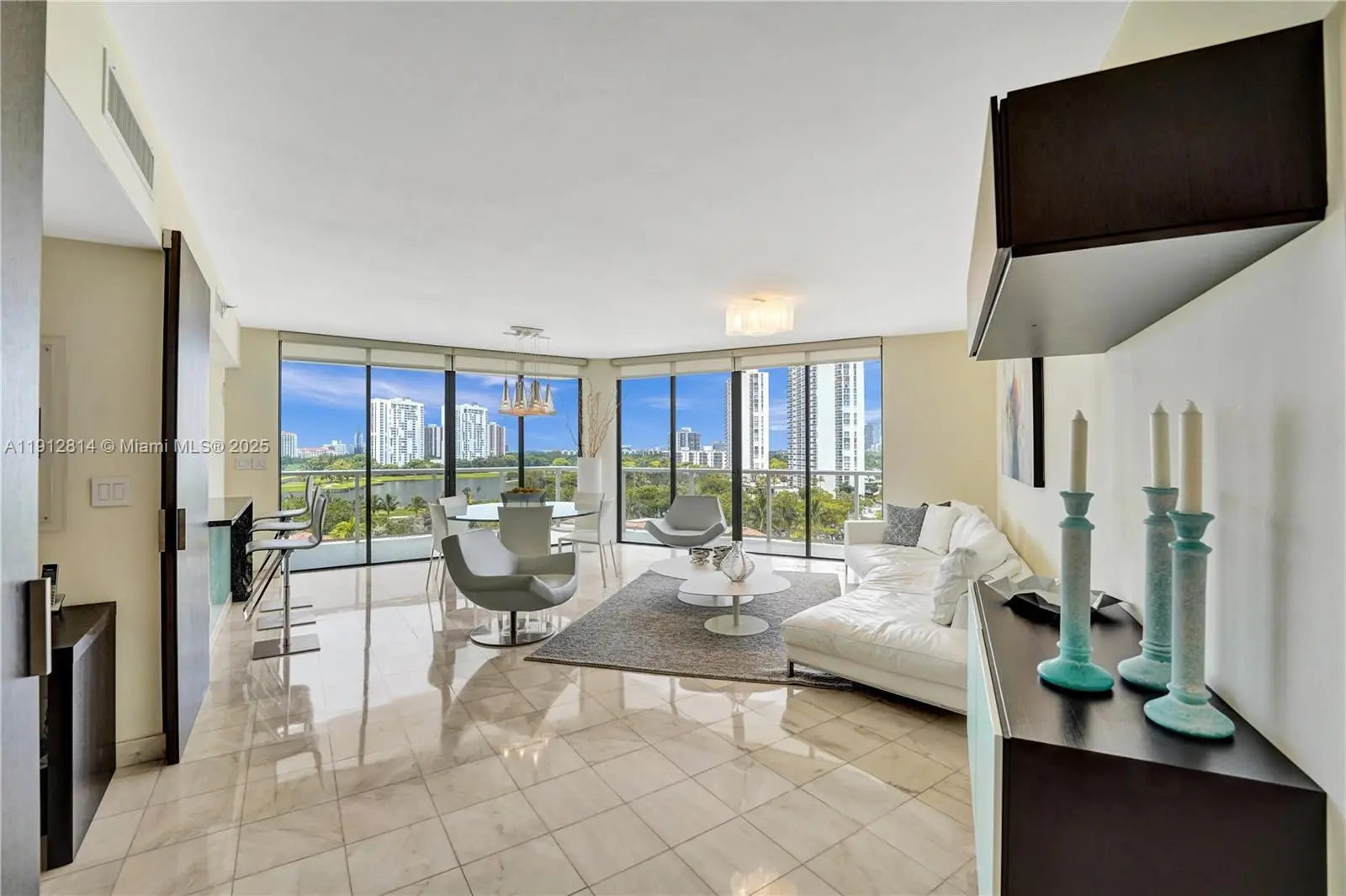 This beautifully furnished bright unit offers 3 BD + den/office/guest room & 3 full bath. It boasts a modern look, tastefully decorated & renovated. Marble floors in living areas & bamboo floors in bedrooms. Access to balcony from all rooms to enjoy beautiful views of the pool, lake, golf course & Aventura skyline. An open-layout floor plan that joins multiple spaces promoting an airy ambiance. Open kitchen, white glossy cabinets, SS appliances, granite countertops & tiled backsplash. Ample closet space. Luxury living in The Hamptons; two pools, a private gourmet restaurant, Wi-Fi café, Movie Theater, state-of-the-art fitness center & spa, tennis & racquetball courts, party room & Kids playroom. Enjoy strolls in “the circle”. Available for annual & seasonal rent, offered only furnished.