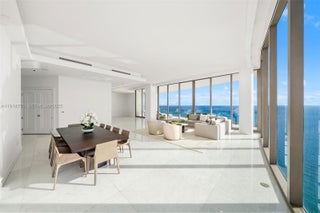 The most highly sought-after and rarely available unit type at The Estates at Acqualina, coined The World's Finest Residences! Located on the coveted south corner with endless views of the turquoise Atlantic and Miami's glittering downtown skyline, the 45th floor is unique with vaulted 12' ceilings lending to the residence's already-grand feel. Generous outdoor space featuring more than 1100sf of balconies with an oceanfront outdoor sauna. Impressively spacious layout with oversized great room ideal for families and for entertaining, separate family room, 4 bedrooms (convertible 5th), chef's kitchen with dual La Cornue gas ranges and other top-of-the-line appliances by Sub-Zero and Miele, luxurious/upgraded stone finishes including white onyx in all bathrooms with Dornbracht fixtures and Toto washlets. Enjoy the convenience of complete smart-home automation for lighting, audio/visual, climate and window shades. Bar-none, Miami's most luxurious oceanfront enclave with five-star world-class services and amenities that include Rolls Royce House Cars, five restaurants featuring Estiatorio Avra, Il Mulino and KeUh, three pools complete with FlowRider and waterslide, daily breakfast, cinema, skating rink, bowling alleys, F1 and golf simulators, basketball court, soccer field, and dedicated concierges.