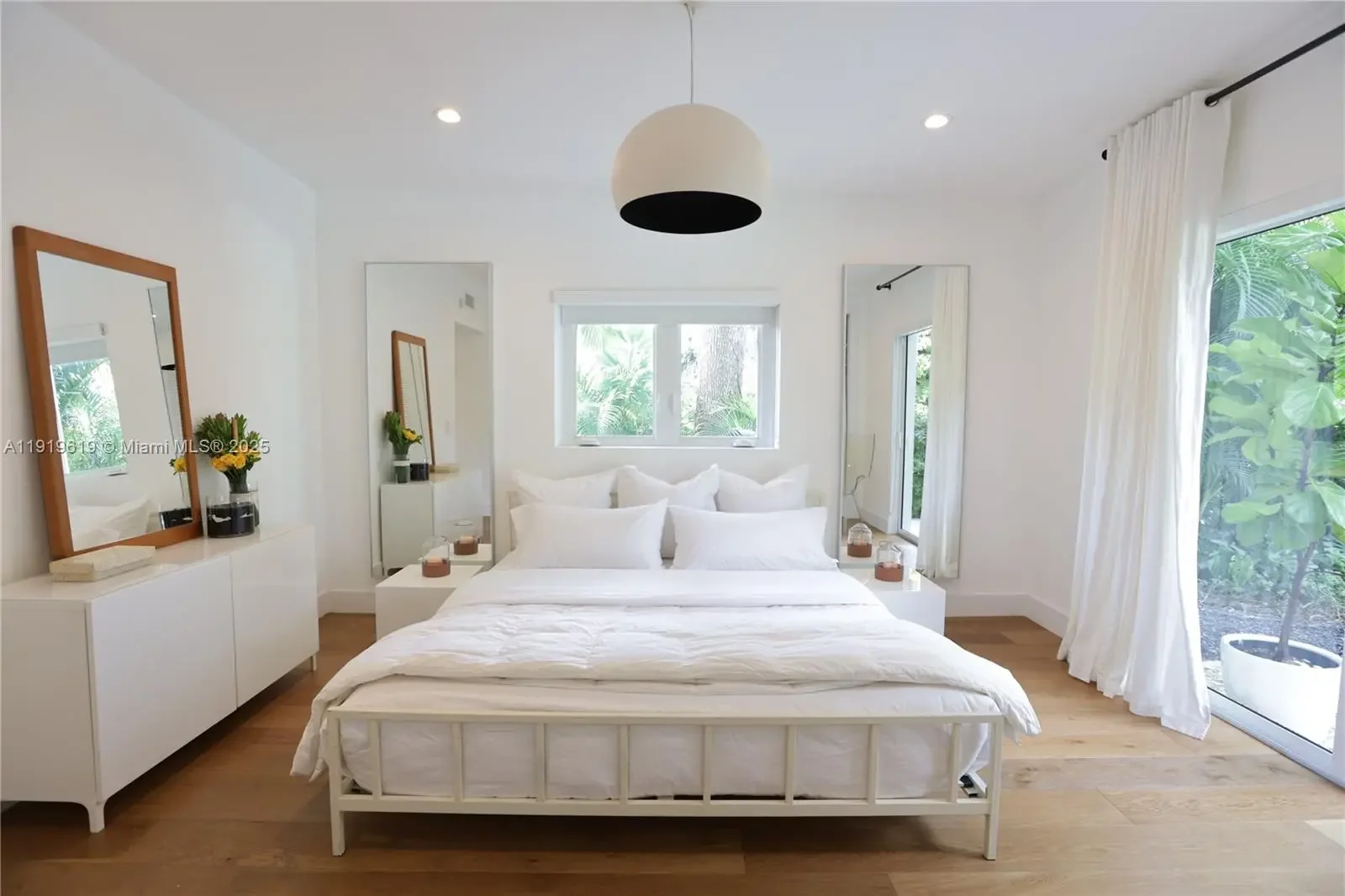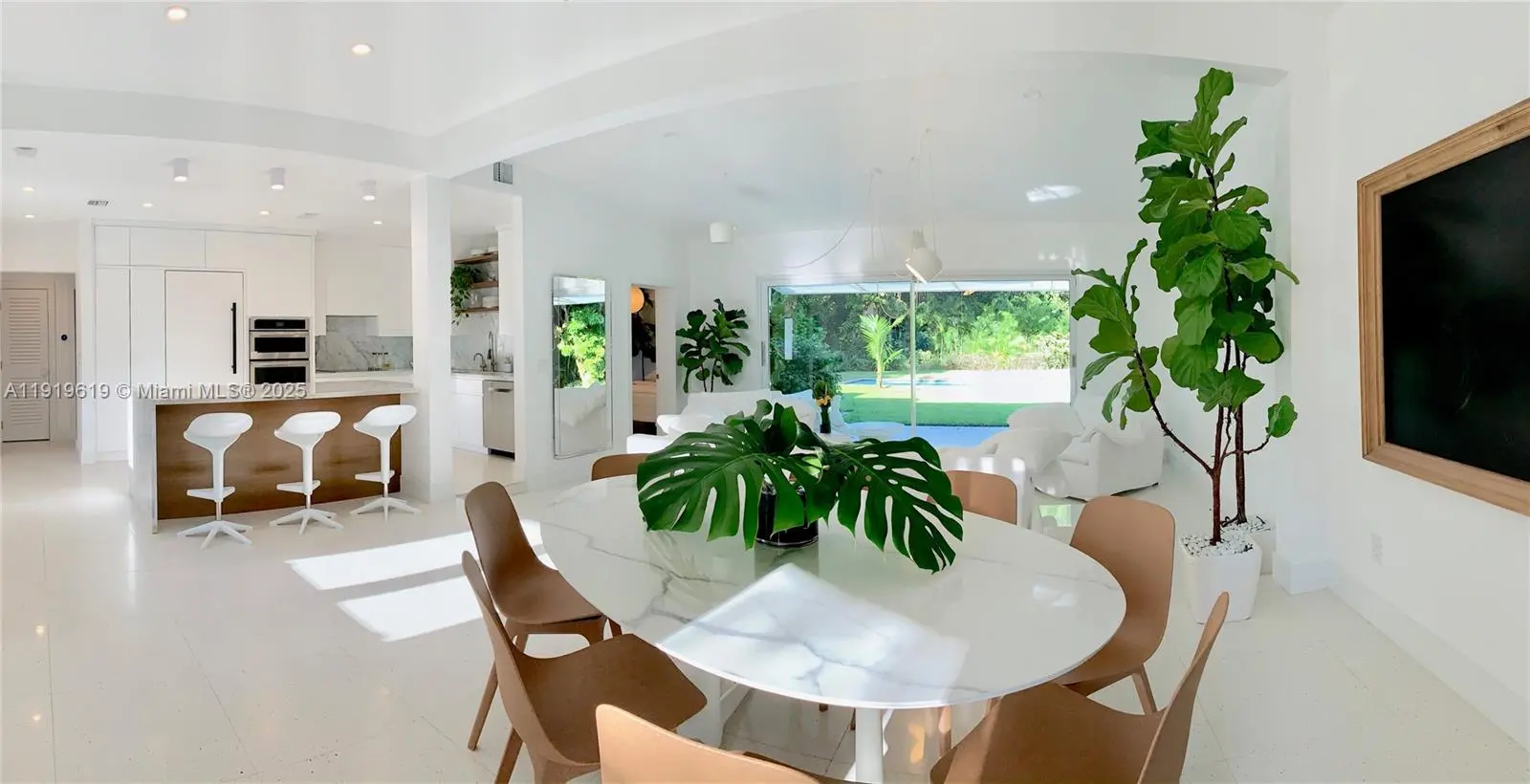 Exquisitely fully furnished modern living space with high ceilings and open airy spaces. White throughout, including large cool terrazzo tiles in the living area and wide-planked Siberian white wood in the bedrooms. High impact windows and doors and custom closets. Immaculately maintained high-end kitchen including marble counters and top of the line appliances. Large lush private canopied/tropical backyard with mature trees and nearly 1/2 acre fenced property with saltwater heated pool. Outdoor shower and patio with awning for all year round entertaining. A tropical paradise! NO DOGS ALLOWED.