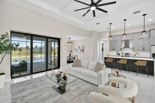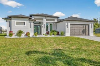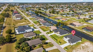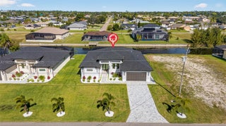 Beautiful, never-lived-in new construction luxury home on a freshwater canal in highly desirable SW Cape Coral. NOT IN A FLOOD ZONE and NO HOA! Thoughtfully designed with elegant landscaping and mature palms, this home welcomes you with soaring coffered tray ceilings and a stunning entertainment wall with mounted TV and electric fireplace. The desirable split floor plan includes 3 bedrooms, 3 baths, plus a flex room ideal as an office, den, or 4th bedroom. The kitchen features custom cabinetry, generous storage, and quartz countertops. A large laundry room includes built-in cabinets, utility sink, and washer and dryer. The primary suite offers lanai access, dual walk-in closets with custom shelving, and a spa-style bath with walk-in shower, dual sinks, and anti-fog lighted mirrors. The second bedroom includes its own ensuite, perfect for guests. Enjoy the screened lanai with pool and sun shelf, plus an outdoor kitchen with sink and wine refrigerator—ideal for entertaining. Furnishings are negotiable for easy move-in. High-end finishes include upgraded fans, multi-mode lighting, impact doors and windows, oversized tile flooring with membrane, and refined craftsmanship. A second similar new construction home is available next door—perfect for investors or those wanting to live close by.