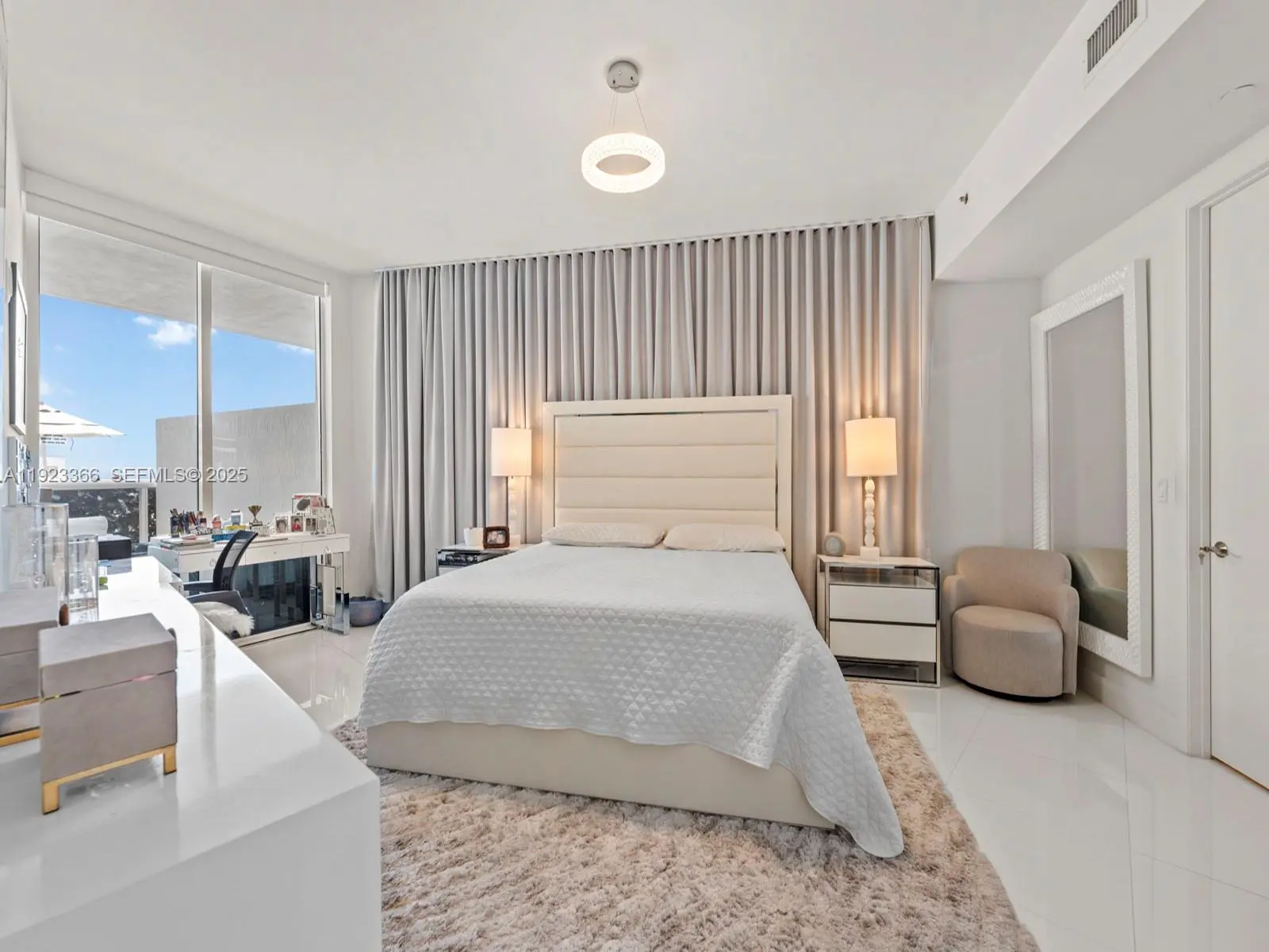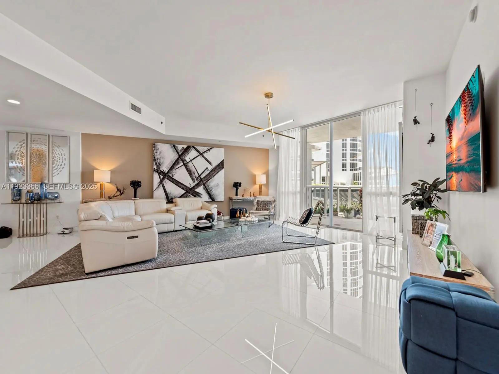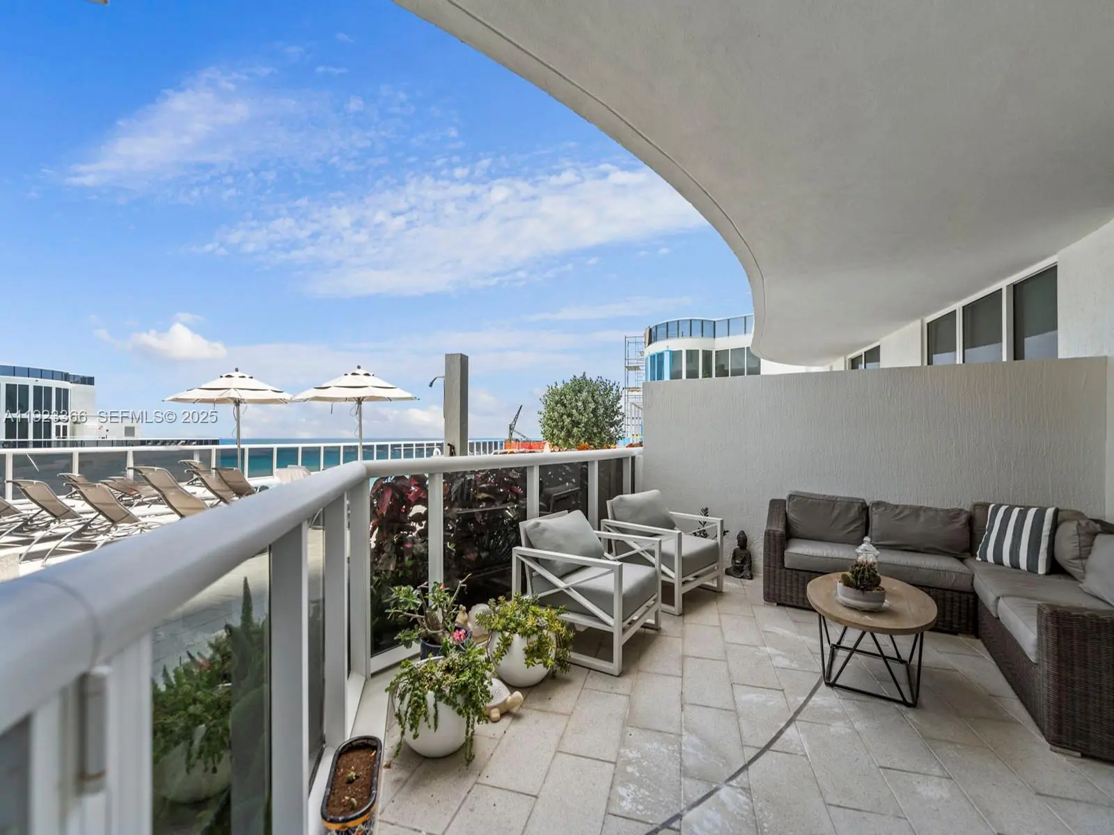 Luxury two-bedroom, two-bathroom oceanfront lanai condominium offering 1850 square feet of living space and features an oversized private terrace with direct access to the pool deck. Resembling a beach house, it boasts a generously high ceiling living room with views through 10-foot-to-ceiling windows. The spacious master bedroom with an en-suite bathroom, a modern kitchen, Exclusive beachfront amenities include private beach chairs, an oceanfront gourmet restaurant with on-demand delivery to your beach chair, an opulent clubhouse, a state-of-the-art fitness center, his and her health spas, two lap pools with attendants, valet service for two cars accessible via an on-call app, and a business center. Additionally, the property features a newly and spectacular renovated patio and pool area.