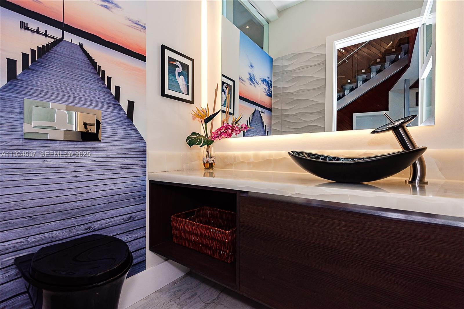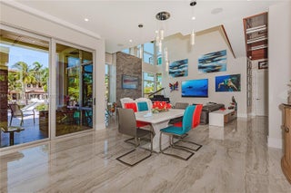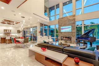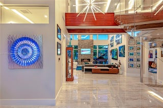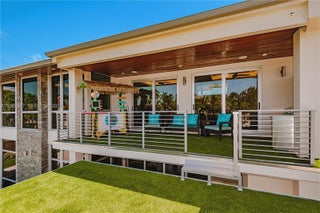 A modern waterfront masterpiece built in 2019 by Barron Construction and designed by Kevin Akey. Elevated with 54 pilings, this smart home features Control4 automation, Sonos audio, a whole-house generator, and premium finishes including 23-ft ceilings, a glass walkway, a floating staircase, and a chef’s kitchen with Sub-Zero and JennAir appliances. The first-floor primary suite offers spa-level luxury, while the outdoor space includes an 80-ft Trex dock with ocean access, a heated pool and spa, turf yard, and an 11-car gated driveway.