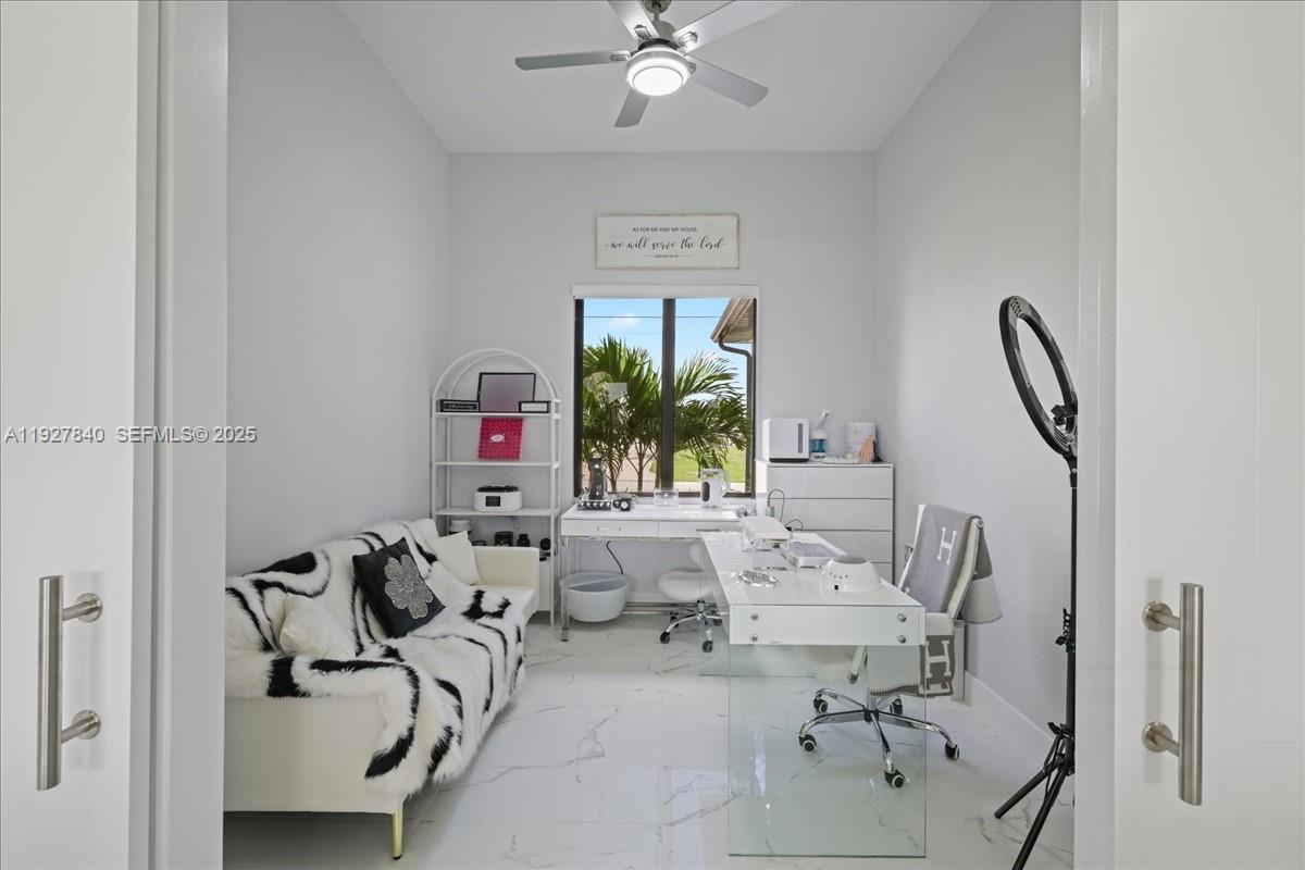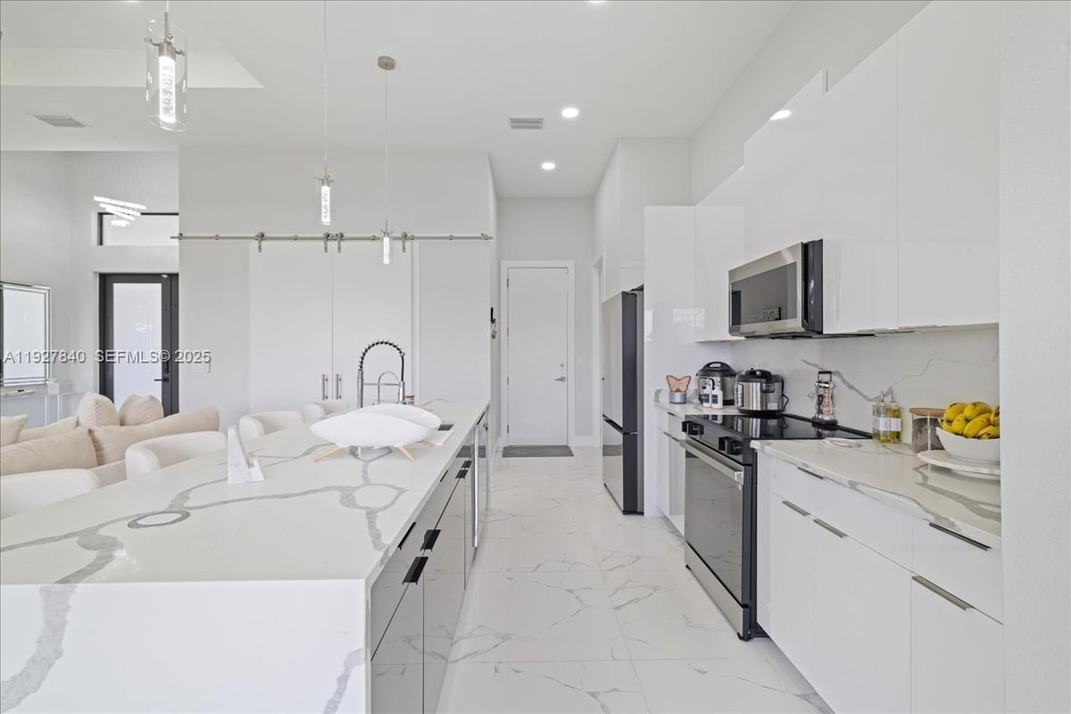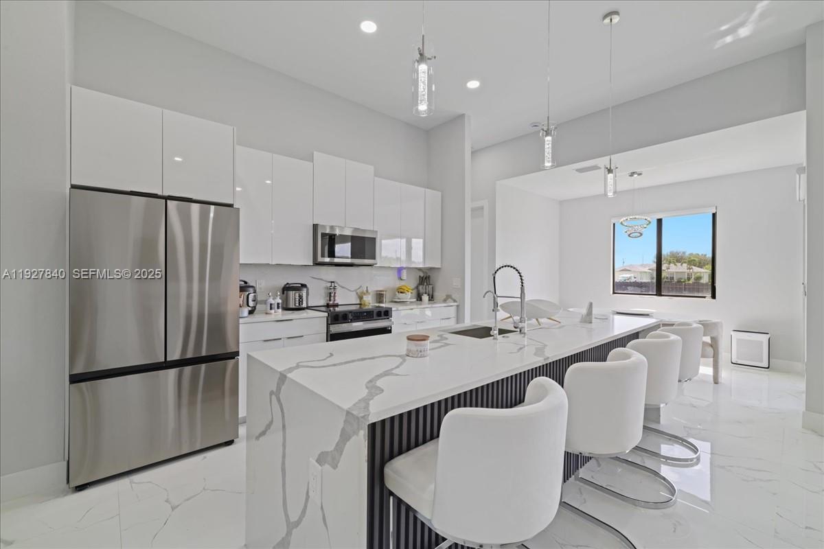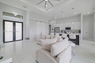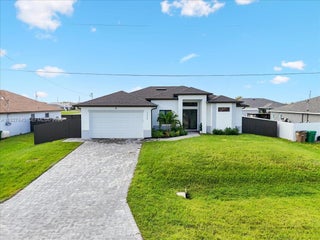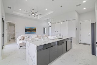 Step into style and comfort with this 3-bedroom, 2-bathroom home plus den, built in 2024 and designed for modern Florida living. Featuring a large waterfall-style quartz island, stylish cabinetry, stainless steel appliances, and quartz countertops that extend into both bathrooms. Spacious living and dining areas, all beautifully finished with porcelain tile flooring throughout. Spa-inspired bathroom that includes a soaking tub, glass-enclosed shower, and dual quartz vanities. Fully fenced yard and an outdoor kitchen. Built for peace of mind and comfort, this home is equipped with impact-resistant windows and doors for hurricane protection and a security camera system for added safety.