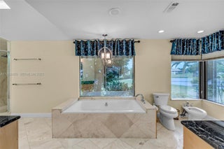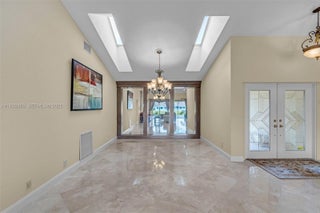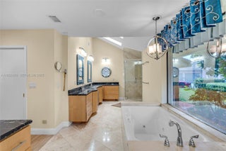 BEAUTIFUL HOUSE in Woodmont! This Home sits on a premier Island cul-de-sac with water views! Marble floors flow through living areas, tile floors in bedrooms, carpet in the Theater Room The Kitchen boasts Custom Wood Cabinets, Marble Backsplash, Stainless Steel Appliances, double oven, and Granite Countertops. Marble Countertops and Frameless Glass Showers elevate bathrooms. Enjoy entertainment in the THEATER ROOM or relax in the MASTER SUITE's cozy sitting area with spacious his&her closets or unwind with a dip in the lap pool. Practical upgrades include a Back-up Generator keeping your home fully powered during outages, CHIC Chicago Brick Pavered Driveway, and Landscaping with exterior lighting. Protect your investment with sturdy Accordion Shutters. NOTE: Property is under 24/7 camera surveillance.
