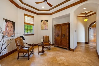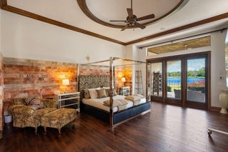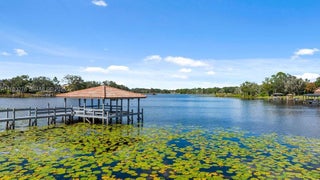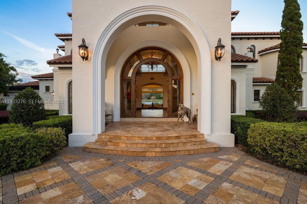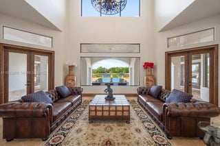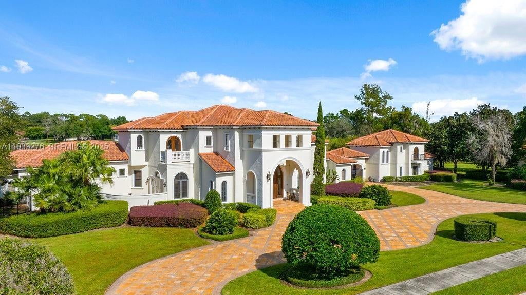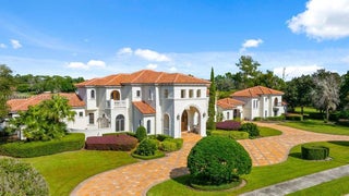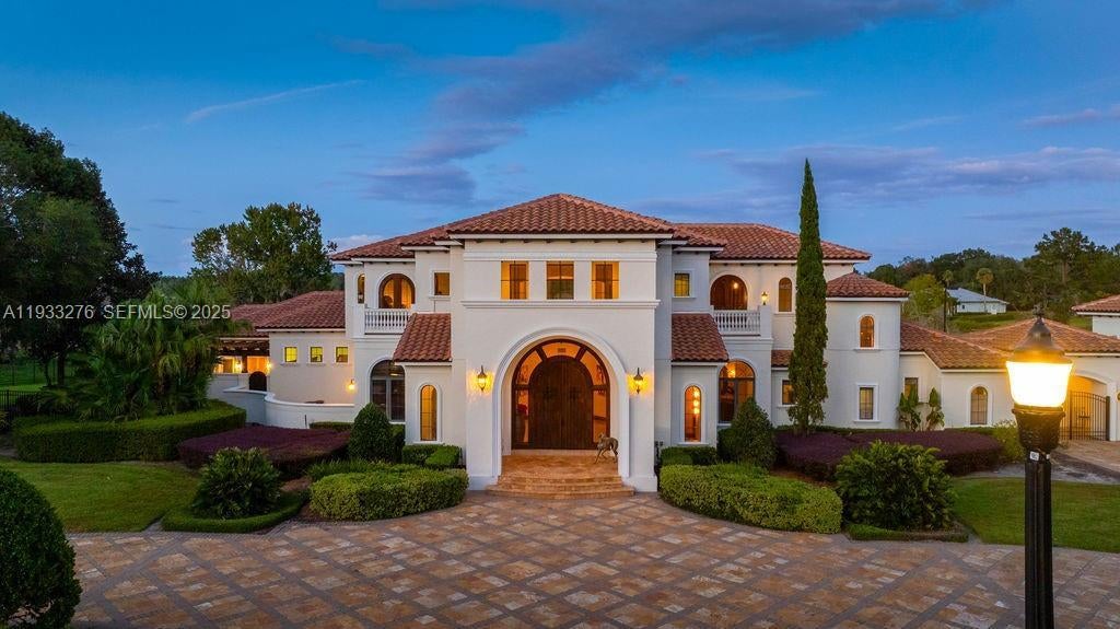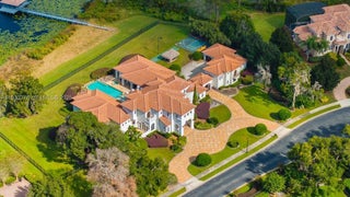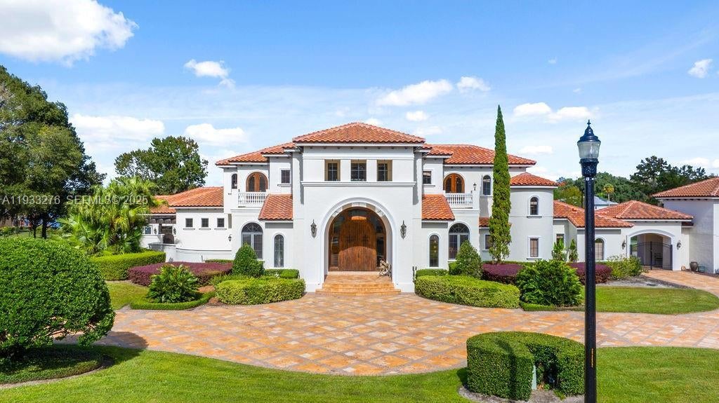 Experience exceptional lakefront living in this one-of-a-kind estate located on a double lot within the prestigious guard-gated community of Lake Markham Preserve, just minutes from Lake Mary, Longwood, and Heathrow. This elegant residence offers 5 bedrooms, 7 bathrooms, and a 6-car garage, set on over two acres of private, manicured grounds. A grand two-story foyer welcomes you with a sweeping double staircase, soaring ceilings, and stunning views of the infinity-edge pool blending into the lake. The primary wing is a private wellness retreat featuring sea-salt walls and a dedicated salt therapy room, along with a sauna, massage room, private gym, and spa-inspired bath. The primary suite and executive office open to a serene Tuscan-style courtyard. The gourmet kitchen flows into expansive living and entertainment areas, including a game room with a private bowling lane. Upstairs, enjoy three en-suite bedrooms, a theater room, and a large balcony overlooking the pool and Lake Markham. Outdoor living includes a heated infinity pool and spa, summer kitchen, tiki cabana, sports courts, and a private dock with covered lift. A detached guest house, wine cellar, generator, and circular driveway complete this extraordinary estate.