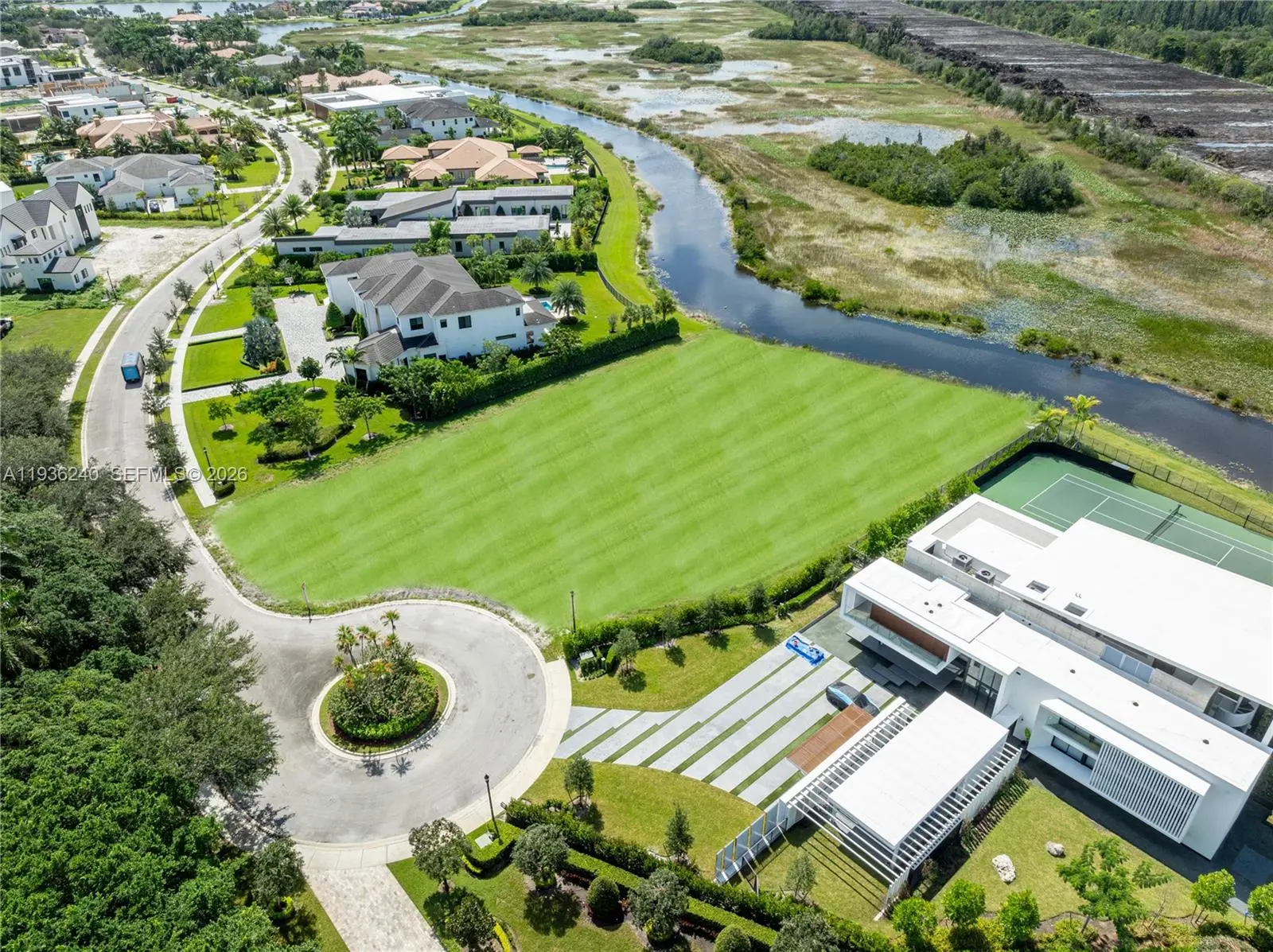 Welcome to Tranquility at Lake Ridge, a newly permitted custom estate by Thomas Homes, located at the end of a private cul-de-sac on just over one acre with peaceful water and preserve views. This extraordinary residence offers more than 15,000 square feet under roof, including 10,036 square feet of air-conditioned living space, and is ready to begin construction. Designed for refined living, the home features six bedrooms, seven full bathrooms, and two half baths, along with a private elevator, home theater, wine room, sauna, sport court, and oversized four-car garage. Buyers have the opportunity to personalize interior finishes with a professional designer. The gourmet kitchen is planned with Sub-Zero and Wolf appliances and flows seamlessly into expansive living and entertaining areas. Outdoor living is equally impressive, highlighted by a resort-style pool with spa and waterfall, summer kitchen, koi pond with floating steps, and multiple spaces to relax or entertain. Situated within the prestigious 24-hour guard-gated Windmill Reserve community and zoned for top-rated Weston schools, this is a rare opportunity to build a fully customized luxury estate in one of Weston’s most sought-after neighborhoods.