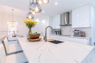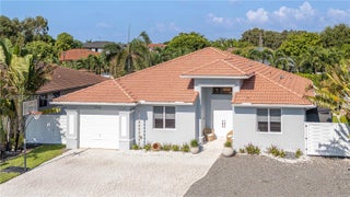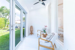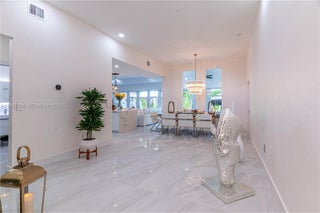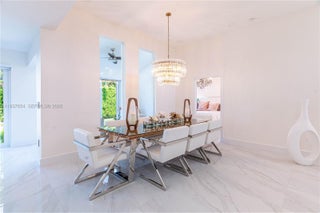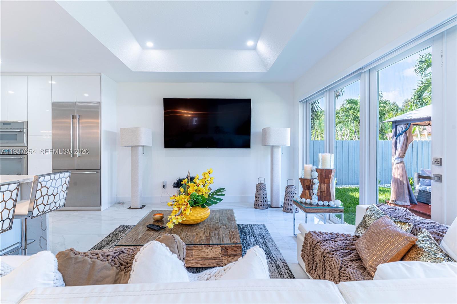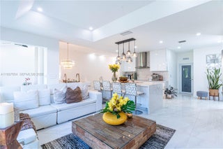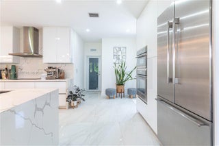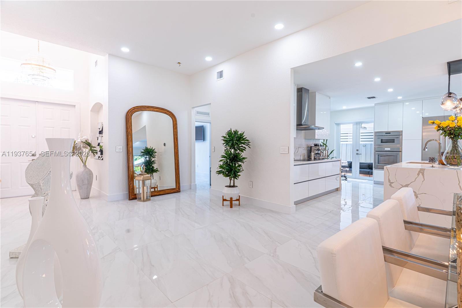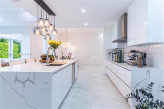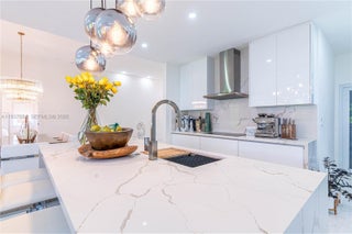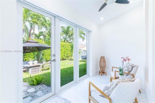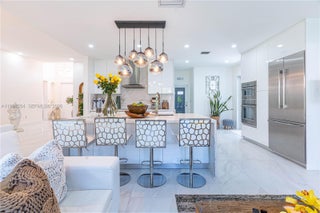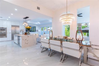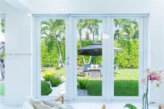 Elegantly renovated 3-bedroom, 3-bathroom home featuring an open concept design and impact windows and doors throughout. The spacious living area offers tray ceilings, porcelain flooring, and french doors that open to a private patio with a covered seating area. The gourmet kitchen showcases waterfall quartz countertops, modern cabinetry, stainless steel appliances, and a large island, perfect for entertaining. Outdoors, enjoy a fully equipped summer kitchen and ample space to build a pool. Additional highlights include a new 5-ton central A/C, custom electric blinds, built-out closets, and much more. Move-in ready, this home blends modern elegance with comfort and seamless indoor-outdoor living in a highly desirable location. (Chandeliers are not included in the sale.)